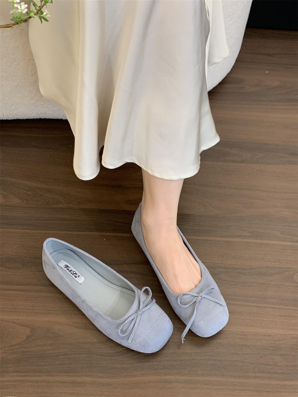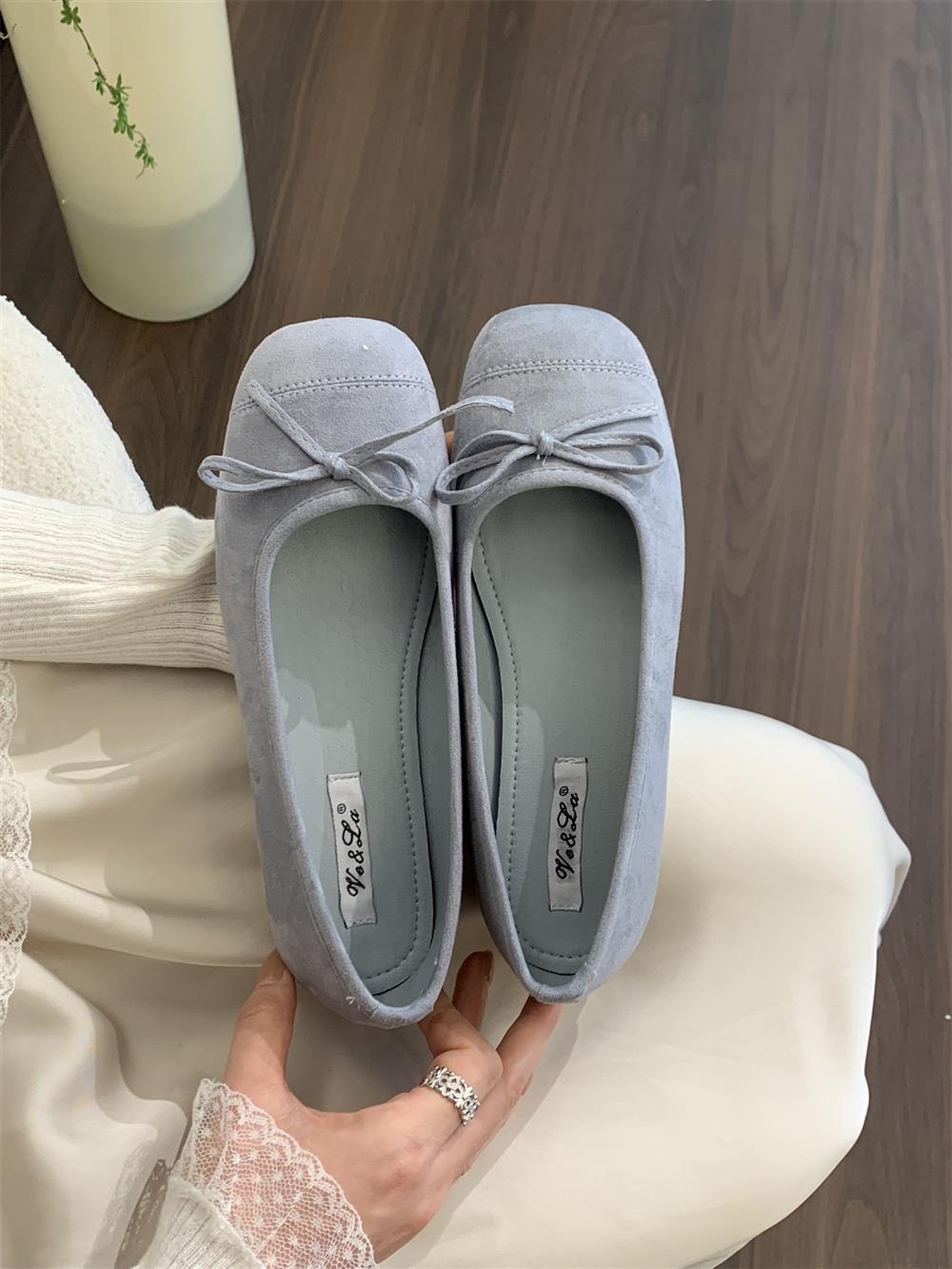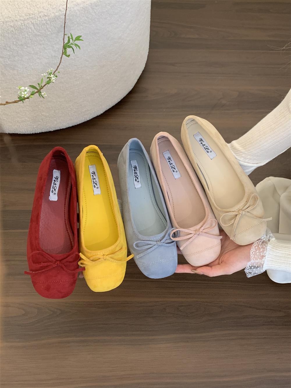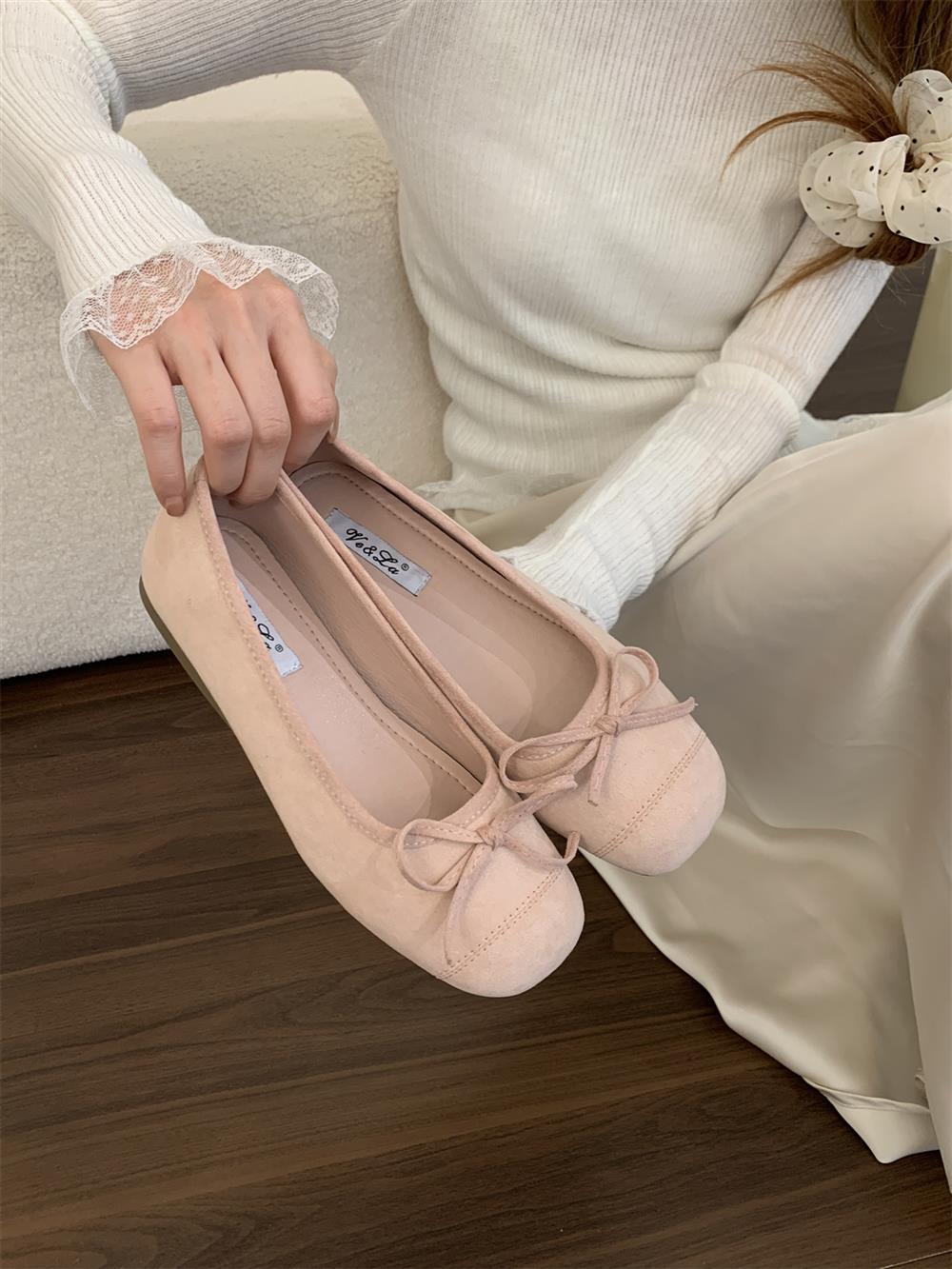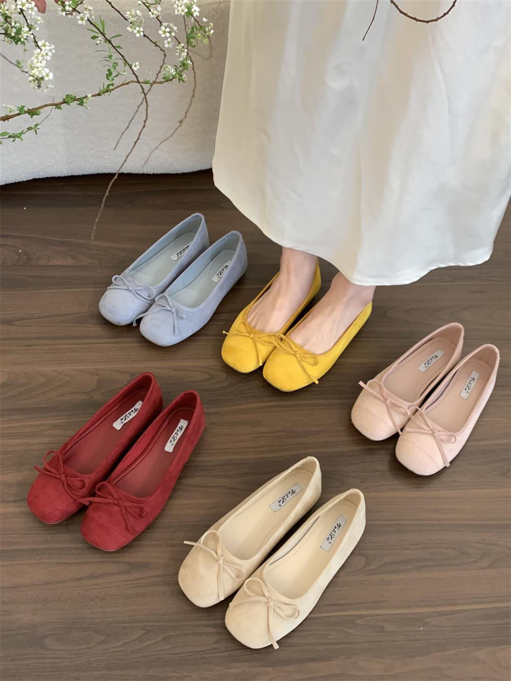 Ve & La Suede 레드 싱글 신발 여성의 봄 얕은 입 페달 레트로 젠틀 요정 발레 플랫 빈 신발스토어 가기
