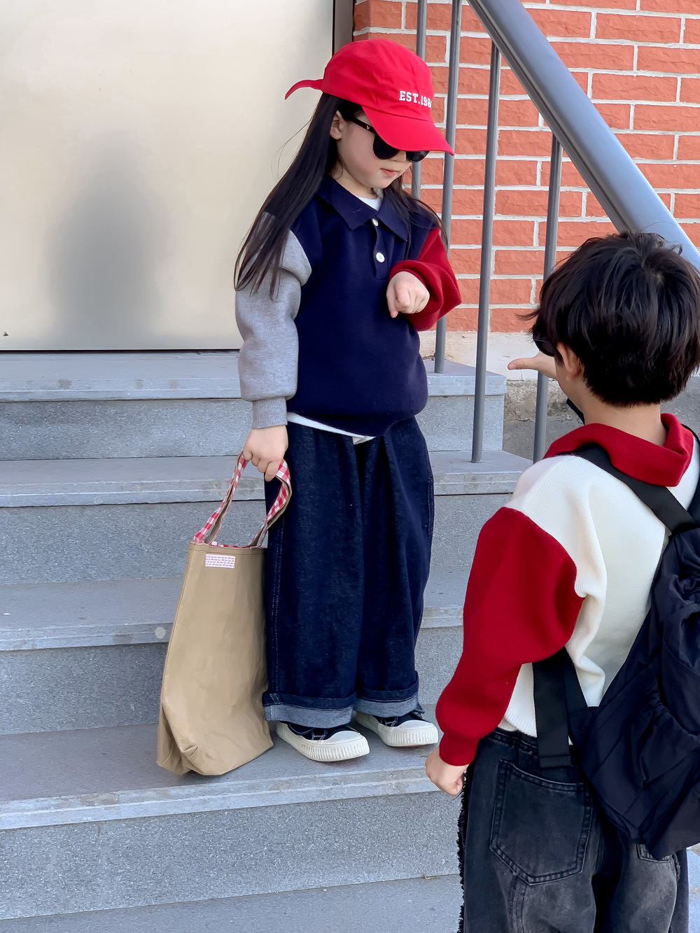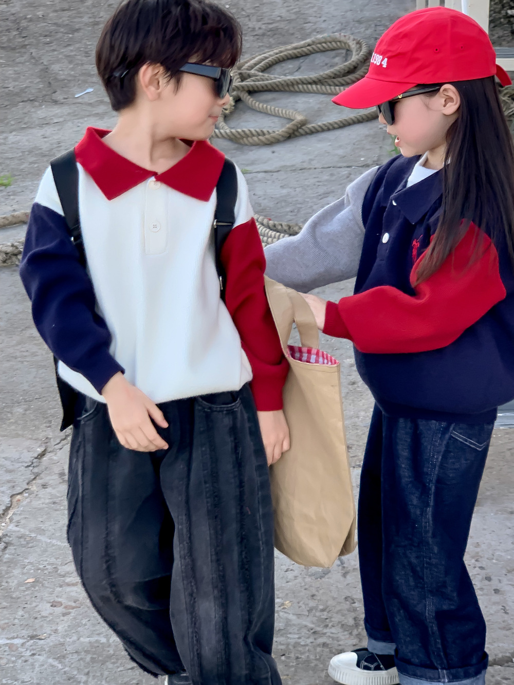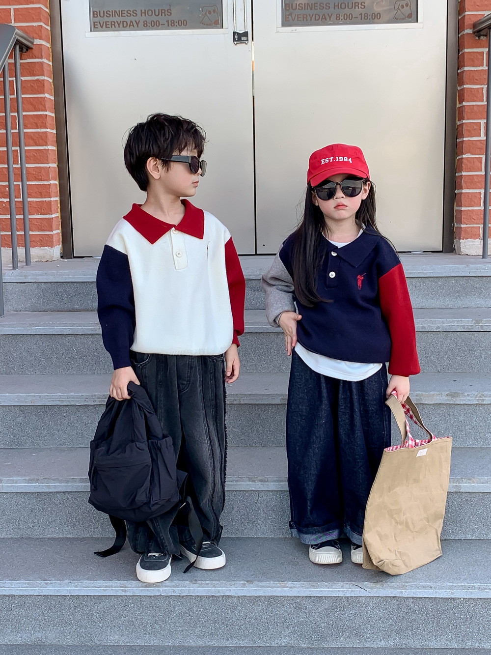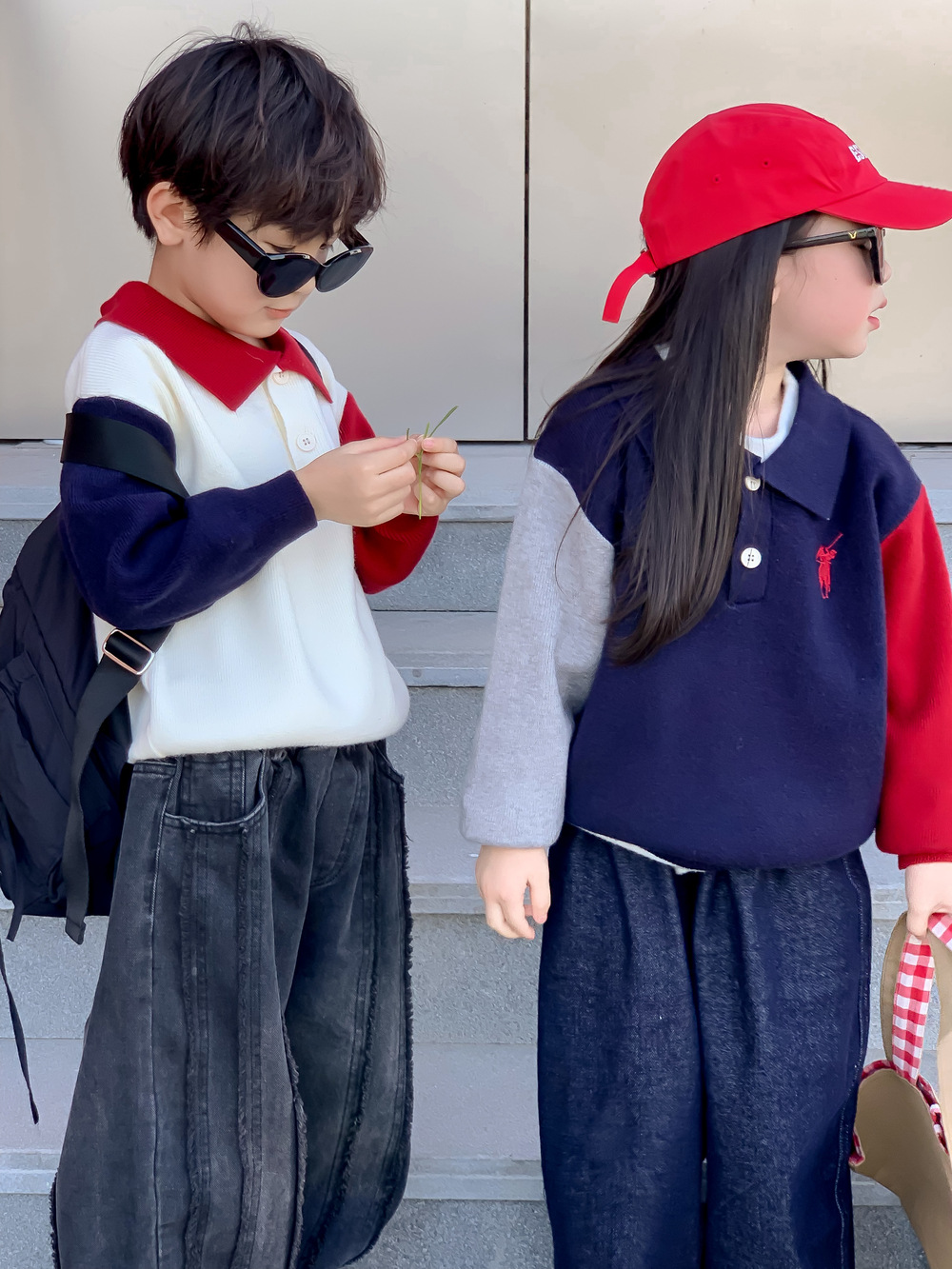 어린이 스웨터 가을 2024 년 소년 소녀 한푸 컬러 매칭 스웨터 어린이 옷깃 캐주얼 콘트라스트 니트 코트스토어 가기