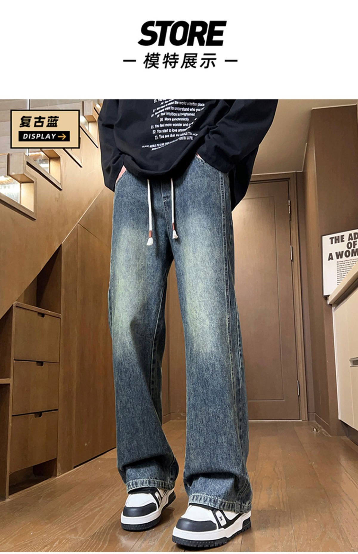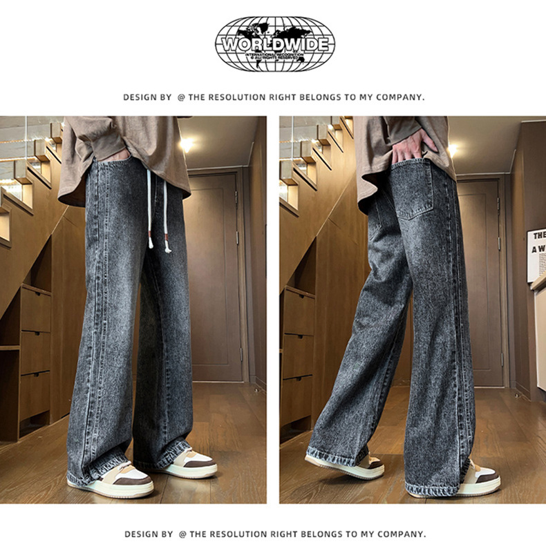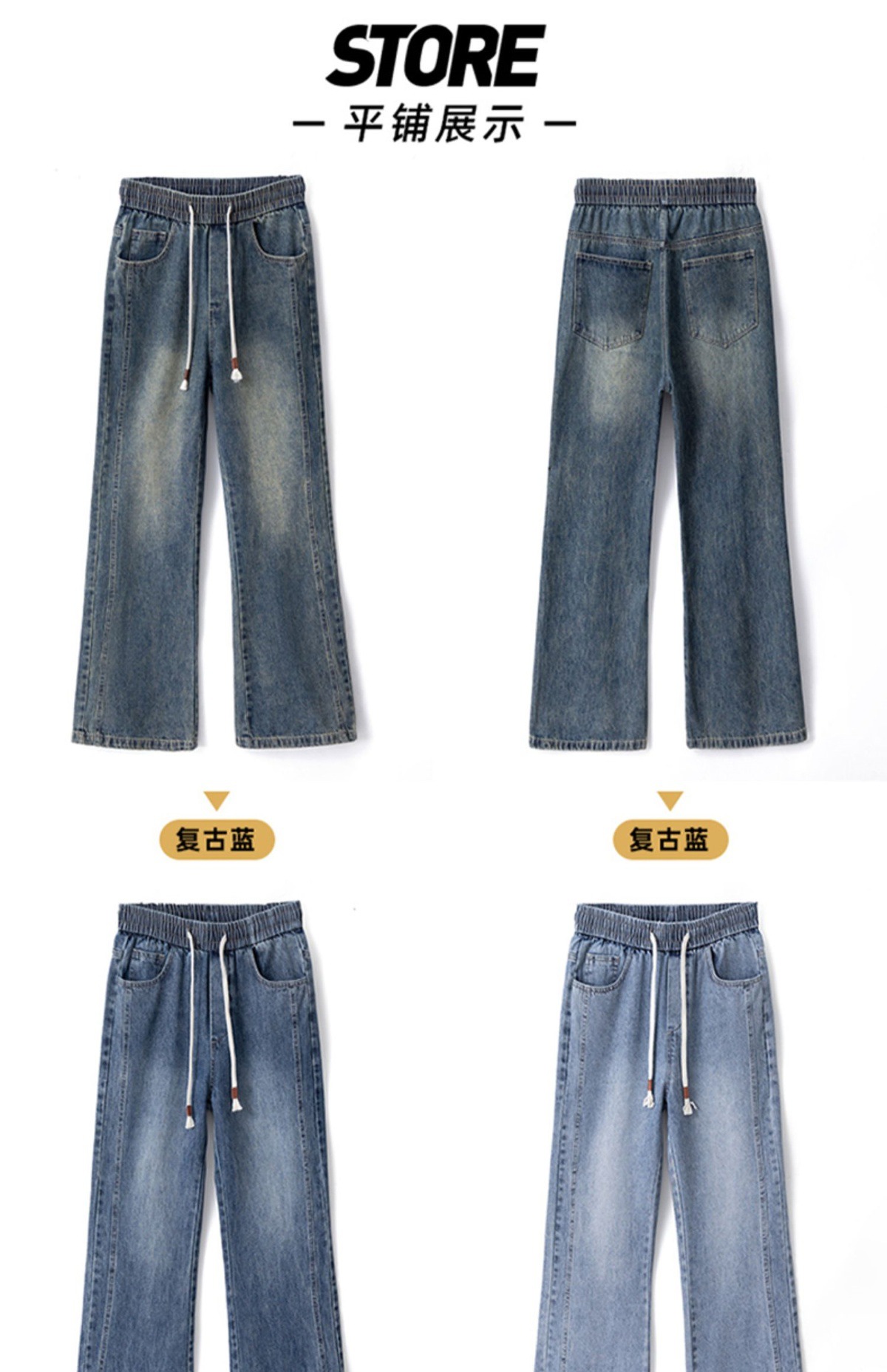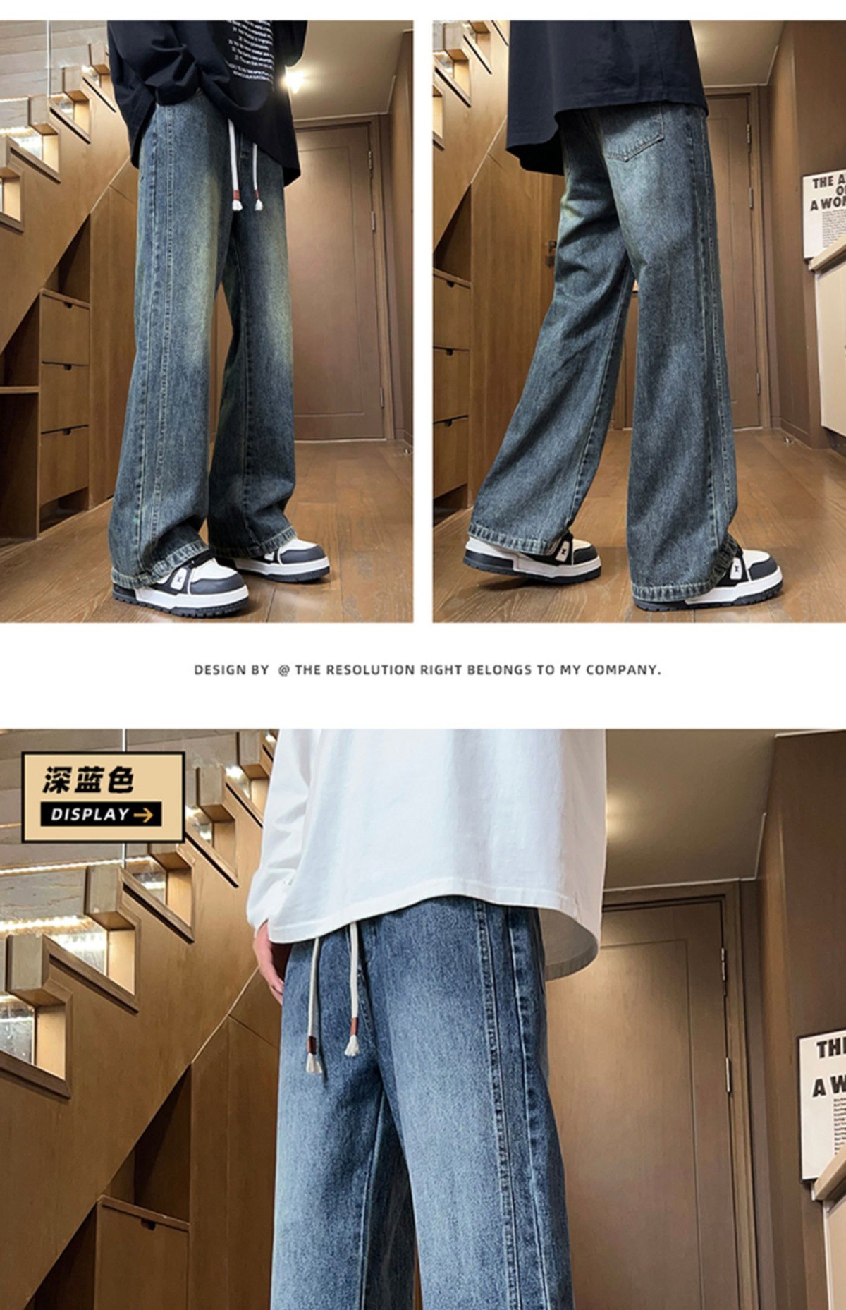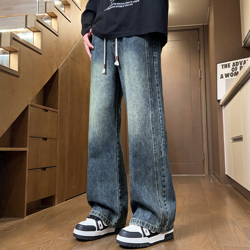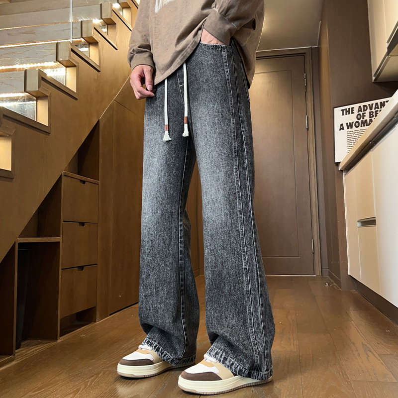 남성용 마이크로 플레어 진, 봄, 가을, 여름용 레트로 아메리칸 스타일 긴 바지, 워싱 처리된 루즈핏 청소년용 스트레이트 와이드 팬츠스토어 가기