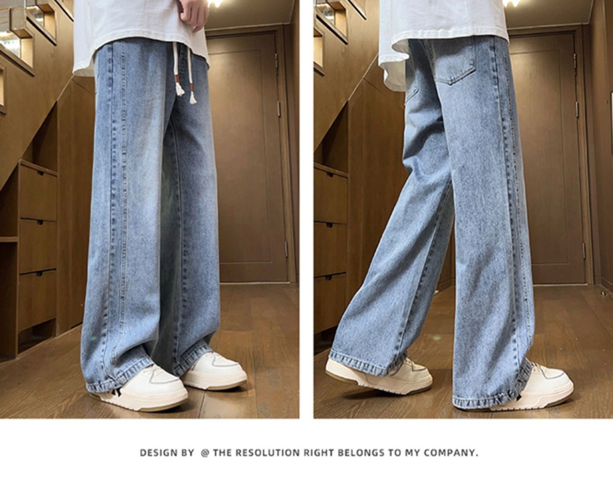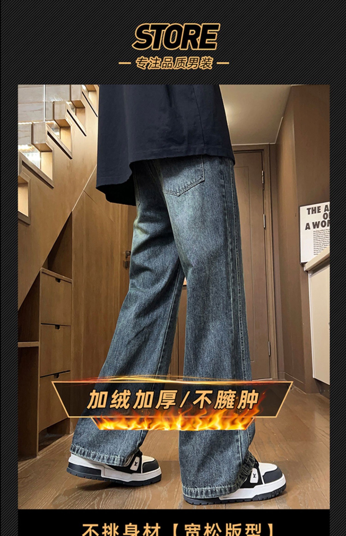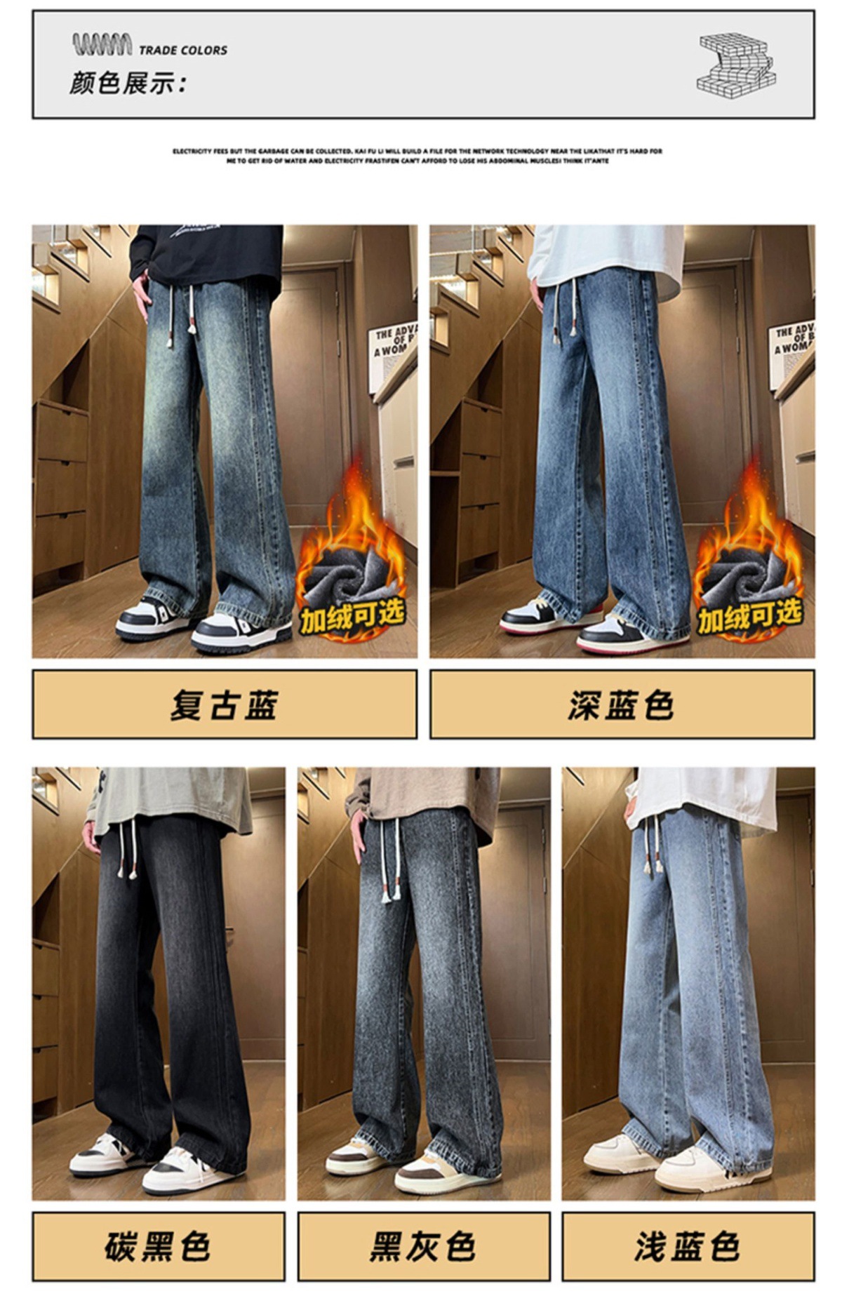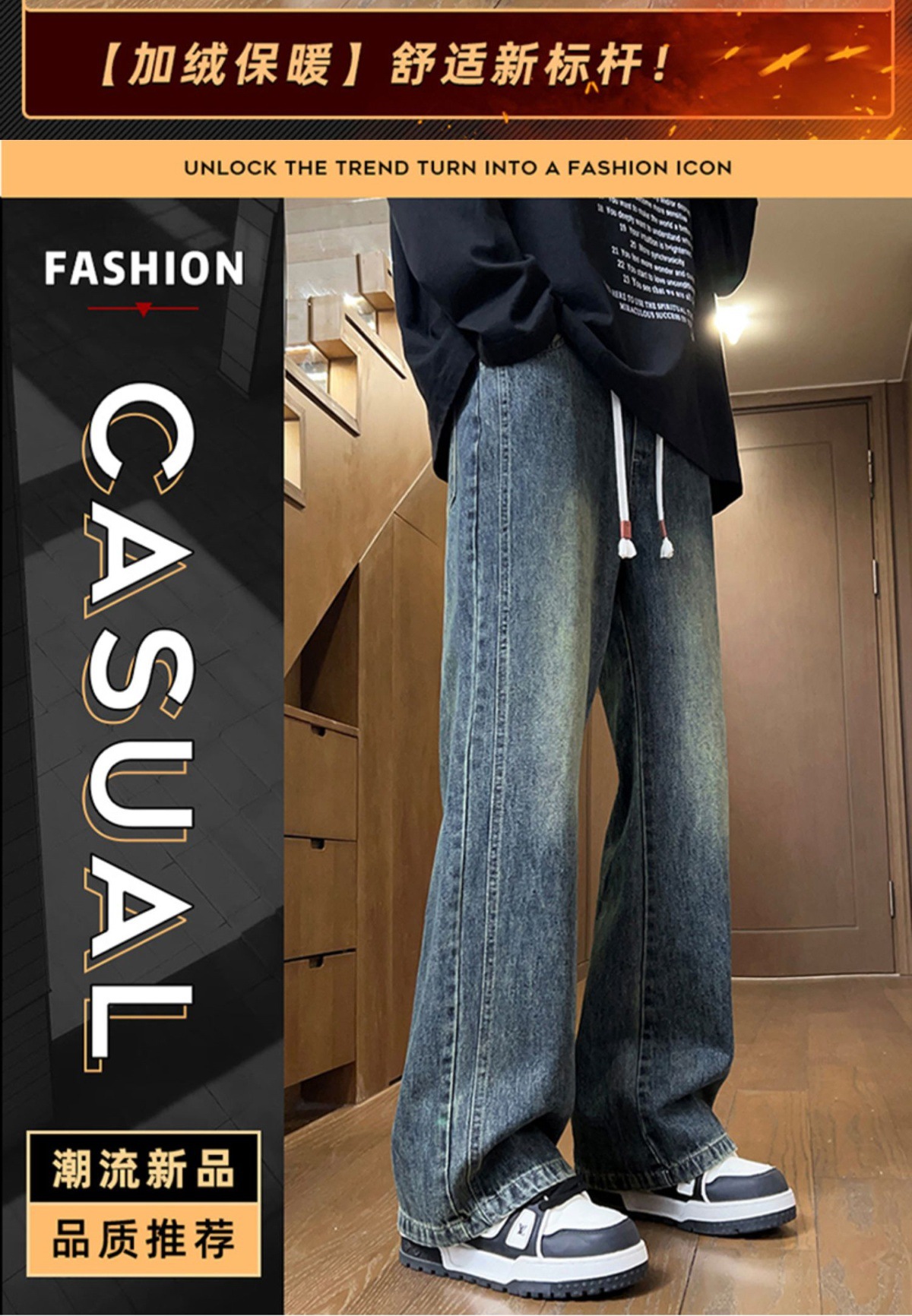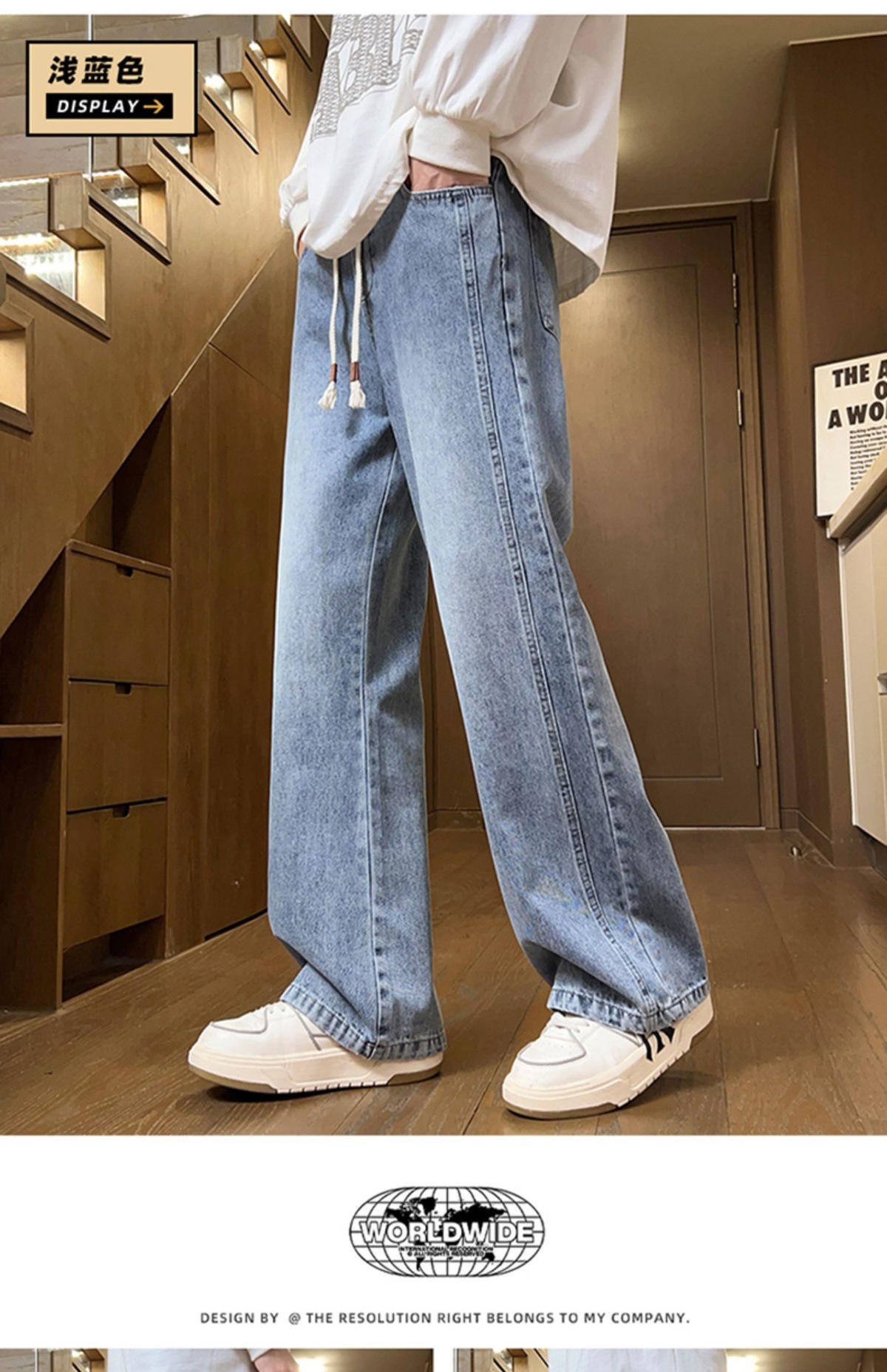 남성용 마이크로 플레어 진, 봄, 가을, 여름용 레트로 아메리칸 스타일 긴 바지, 워싱 처리된 루즈핏 청소년용 스트레이트 와이드 팬츠스토어 가기
