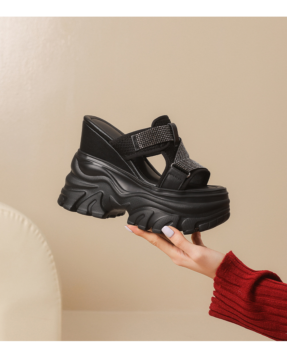 라인스톤 샌들 및 슬리퍼 여성의 2025 년 새로운 도착 슬라이드 캐주얼 올매치 두꺼운 단독 하프 슬리퍼 의류 샌들 웨지 샌들 여름