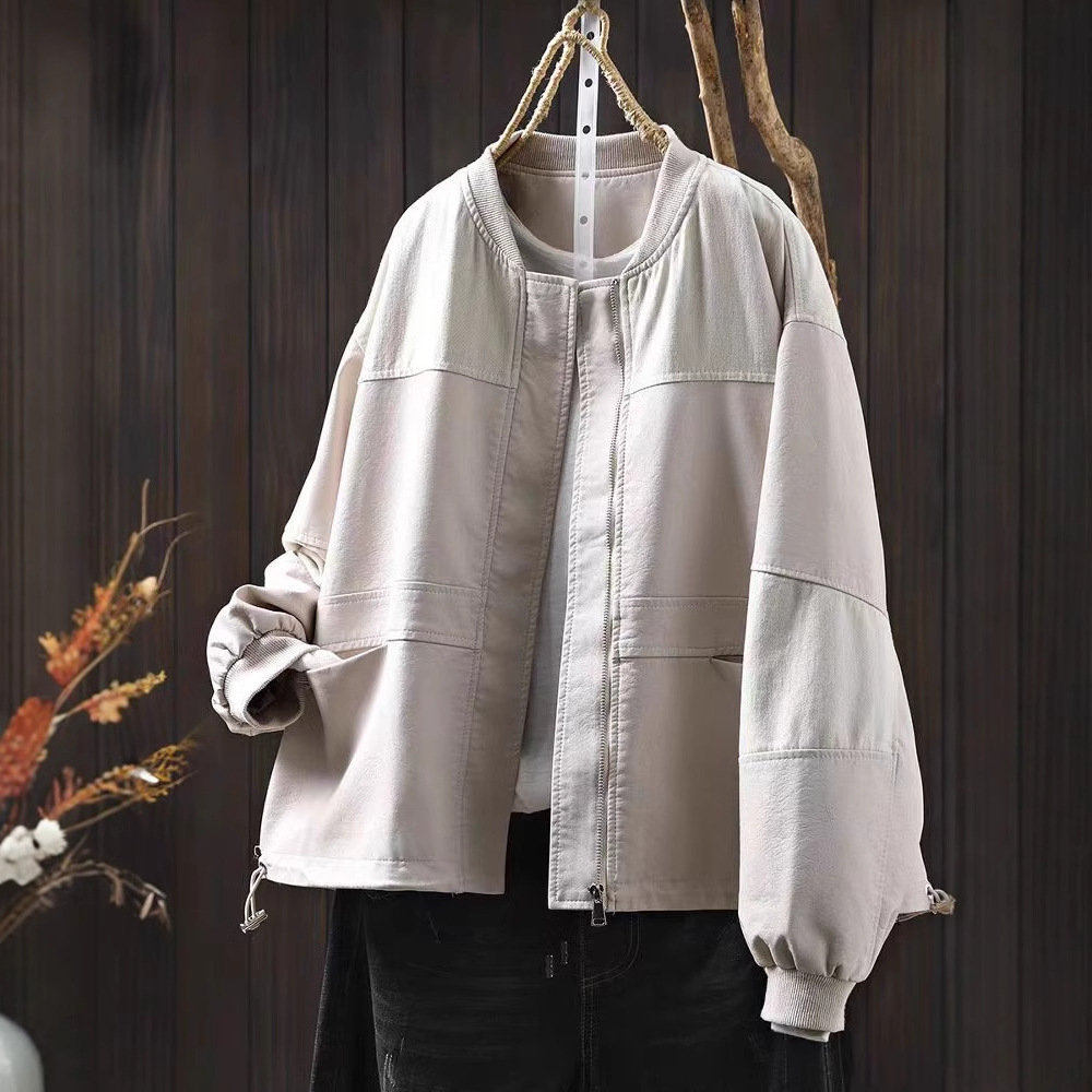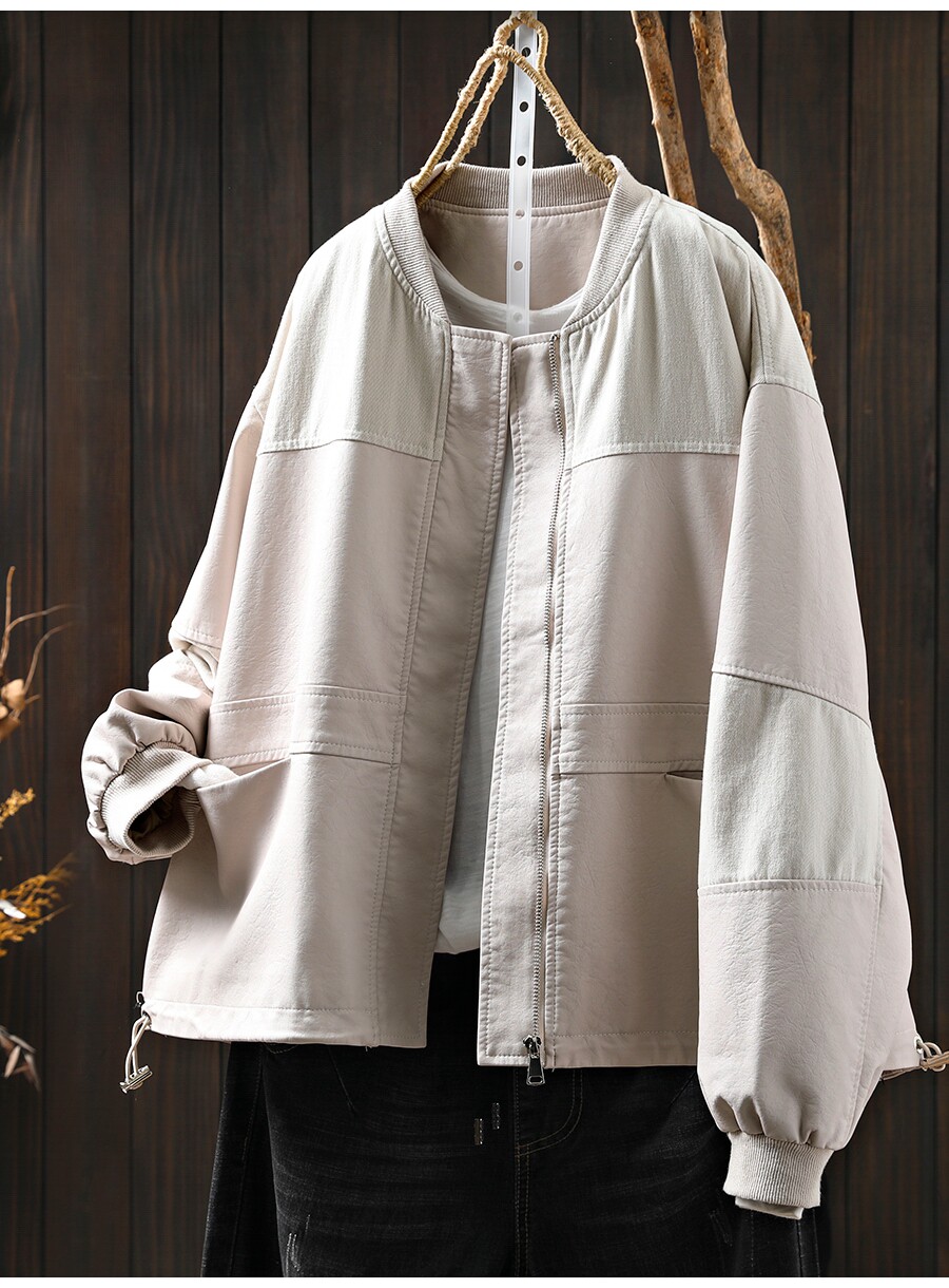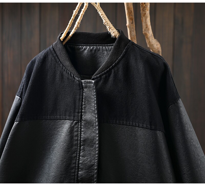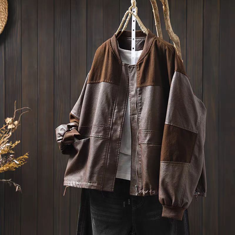 여성을 위한 세련되고 세련된 밑단 조임끈 PU 가죽 재킷, 대형 루즈 캐주얼 기질, 대비되는 색상 스플라이싱 재킷 카디건