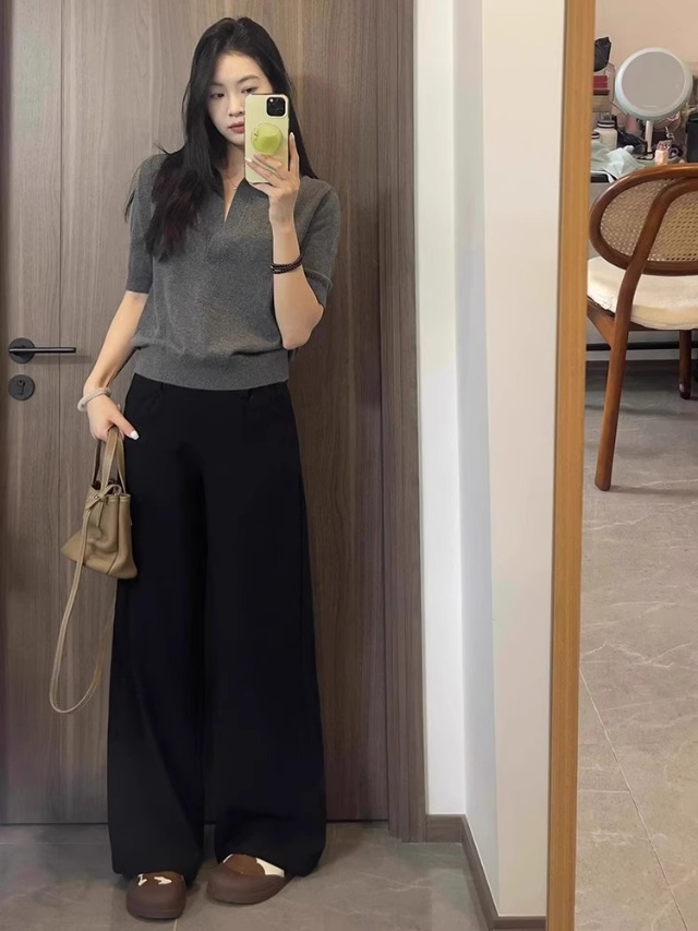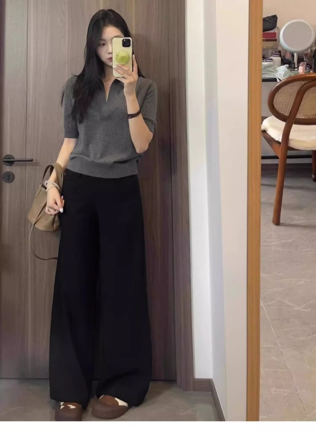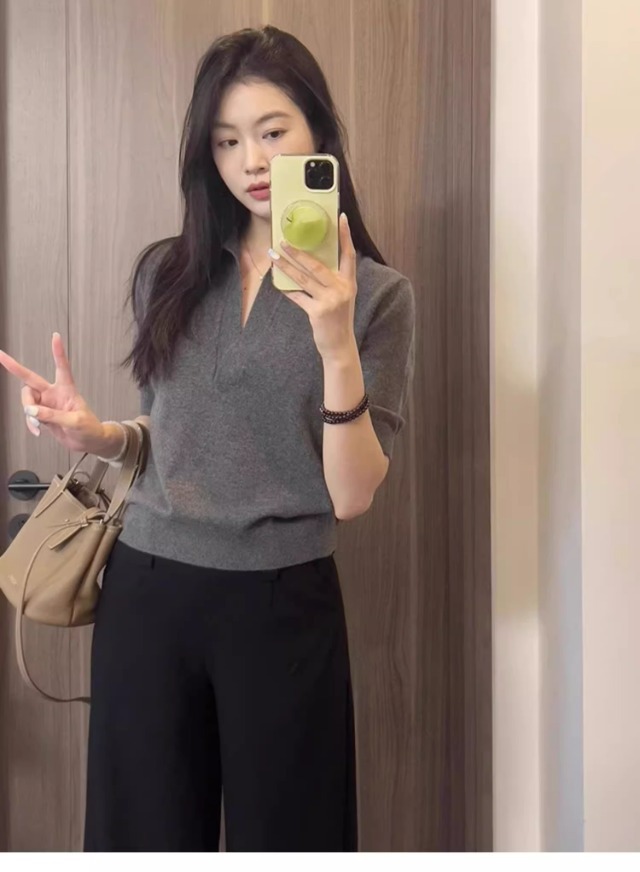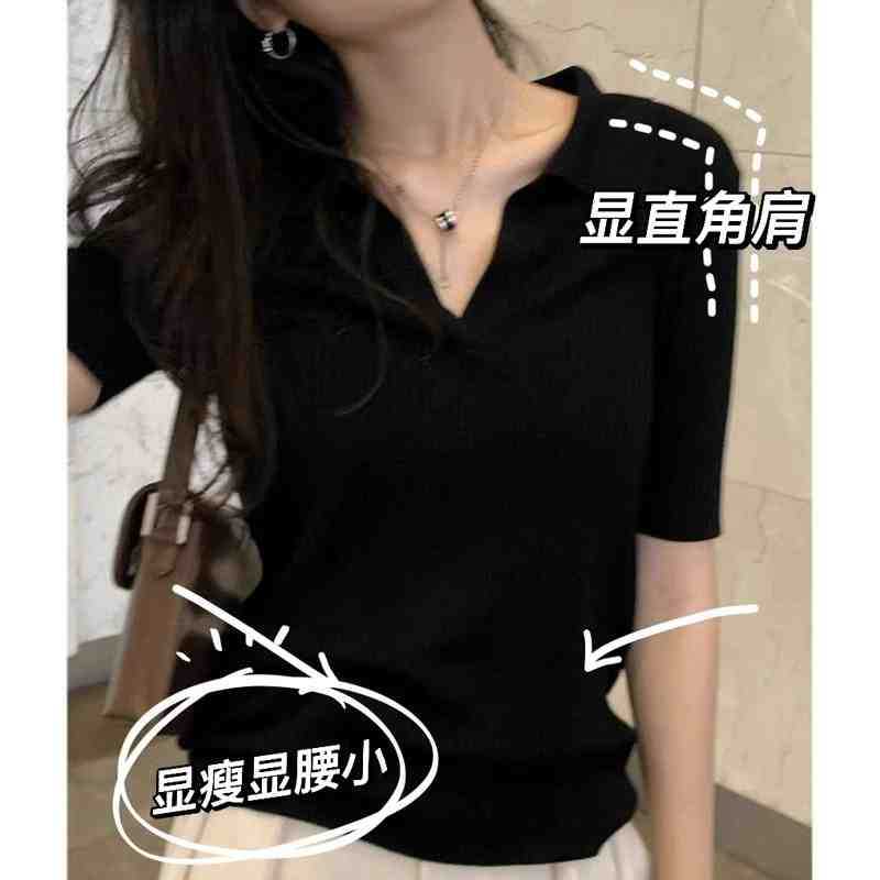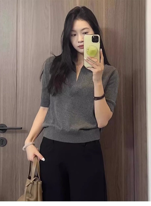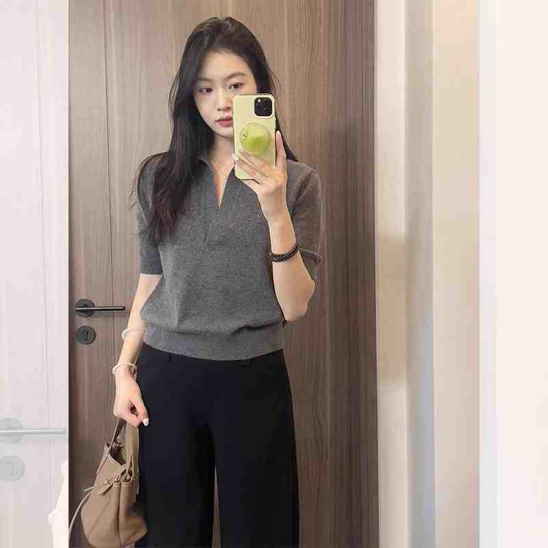 하이 엔드 센스 그레이 니트 반팔 어깨 티셔츠 여성용 2025 년 이른 봄 짧은 서양식 카라 비난 탑스토어 가기