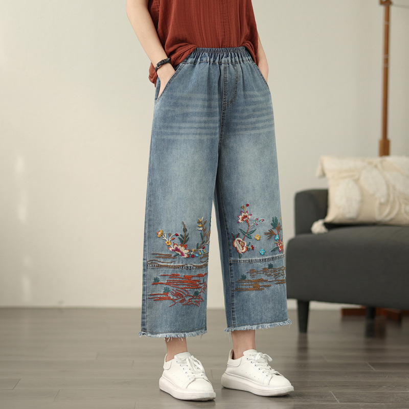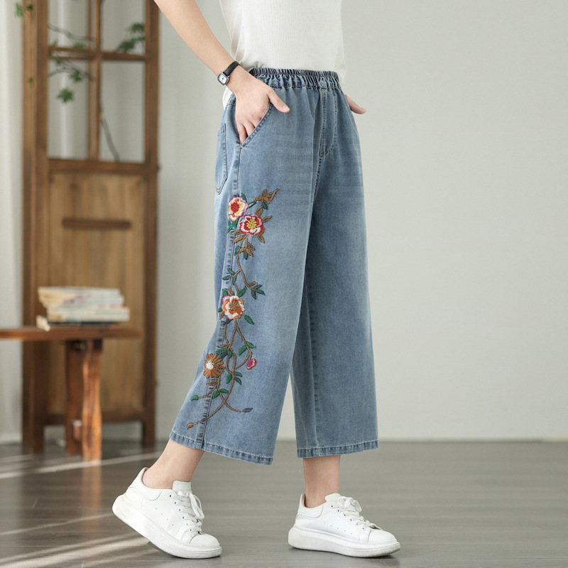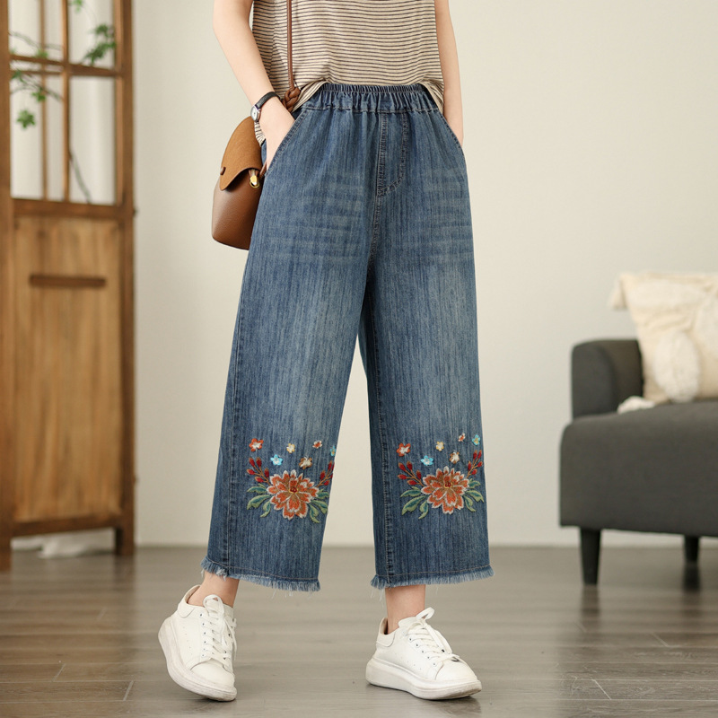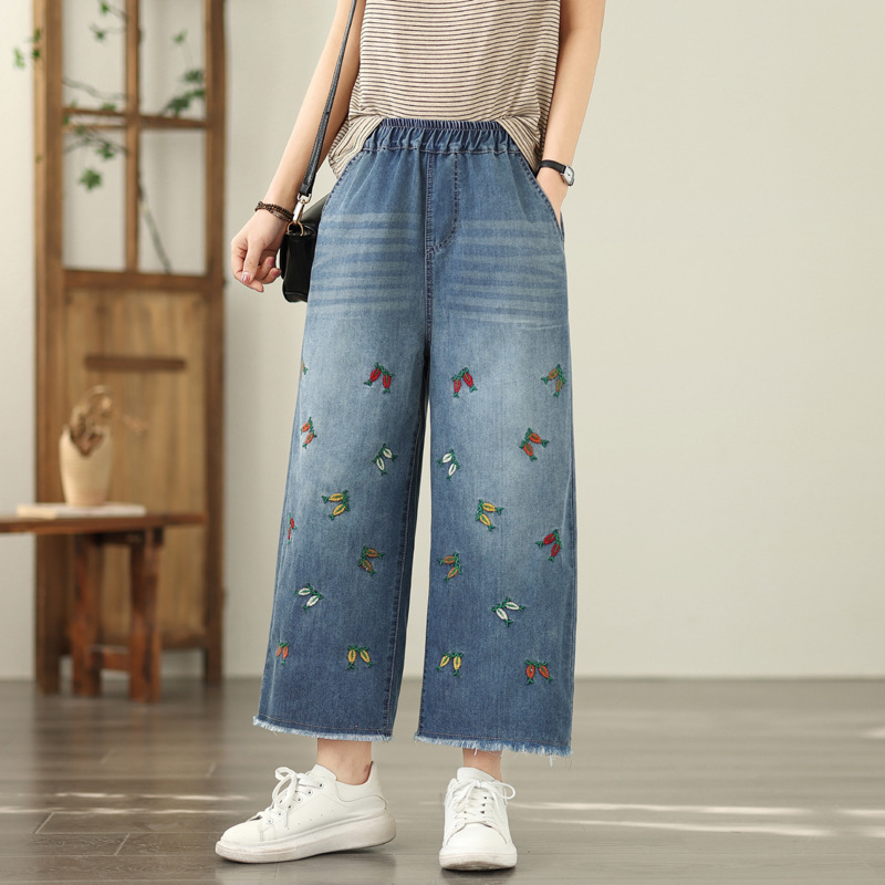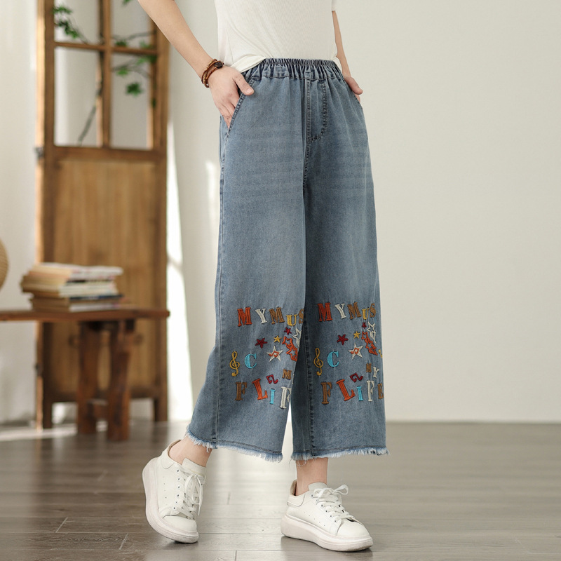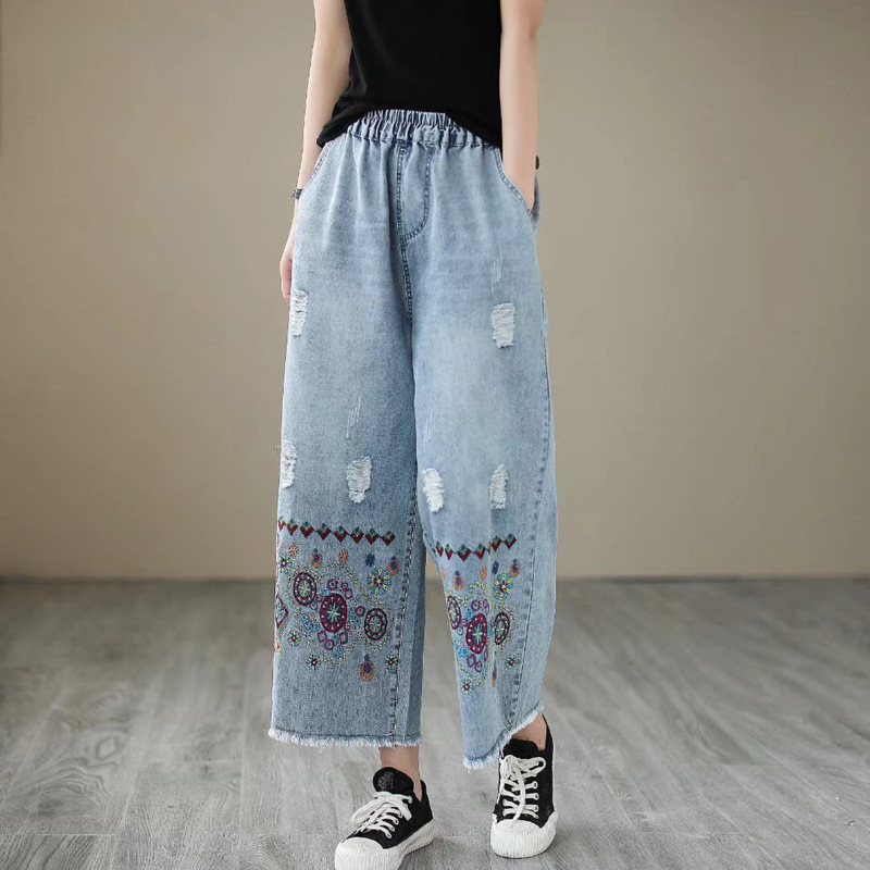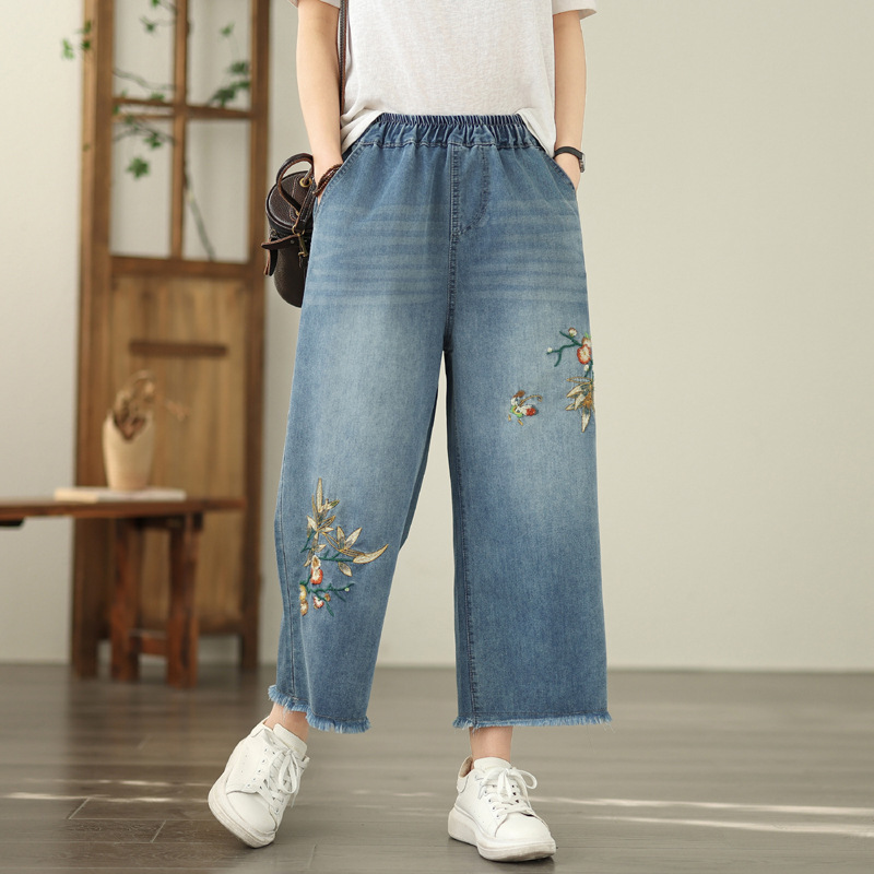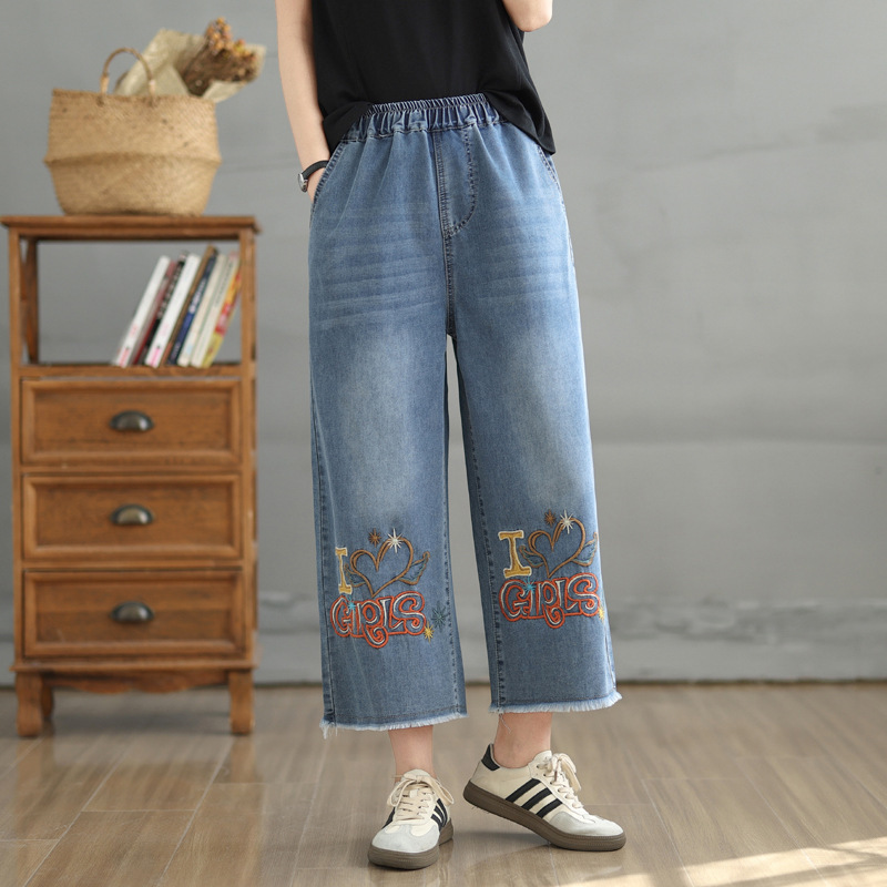 여성용 하이웨이스트 슬림 스트레이트 청바지 봄 여름 워싱 코튼 디스트레스드 자수 와이드 팬츠 9부 캐주얼 팬츠 다용도