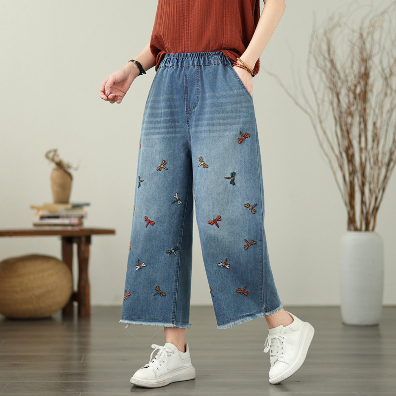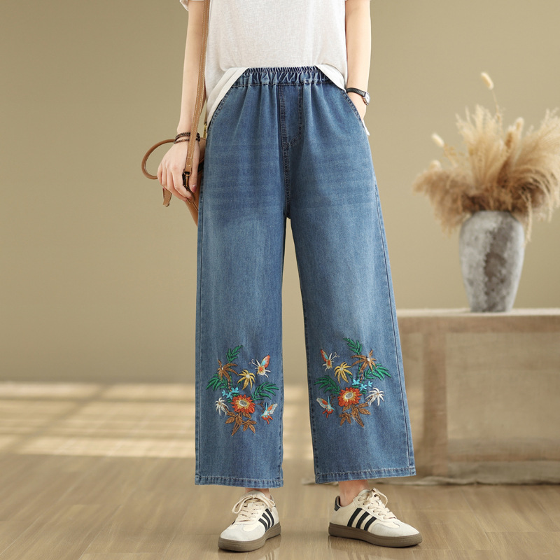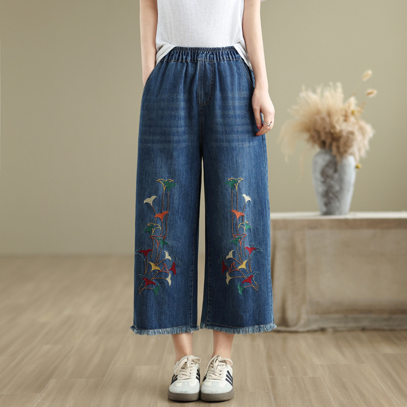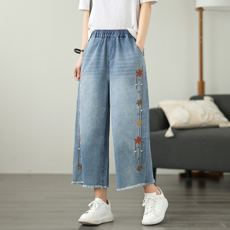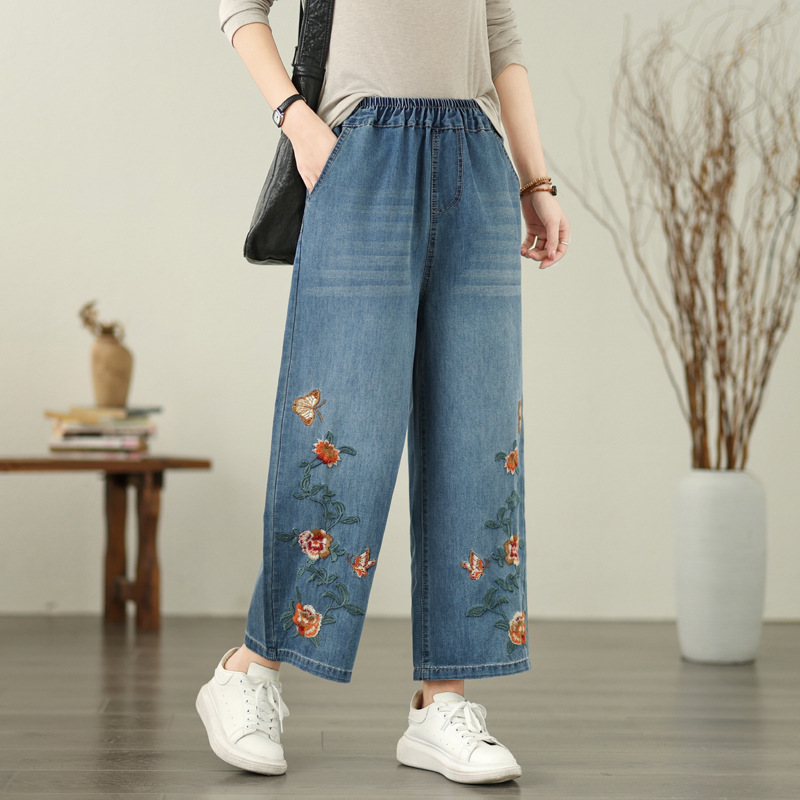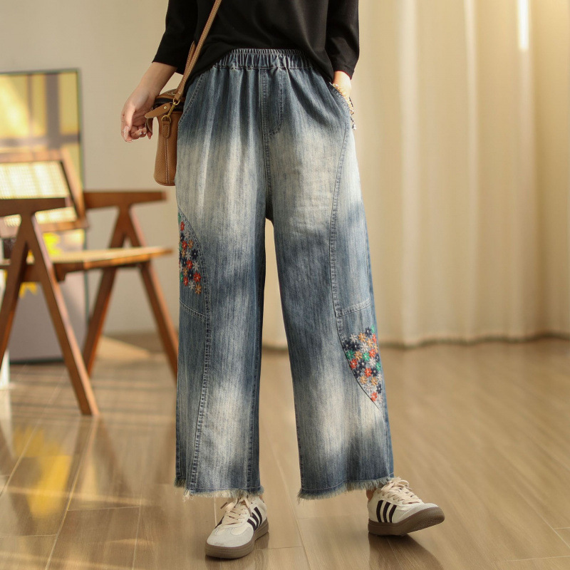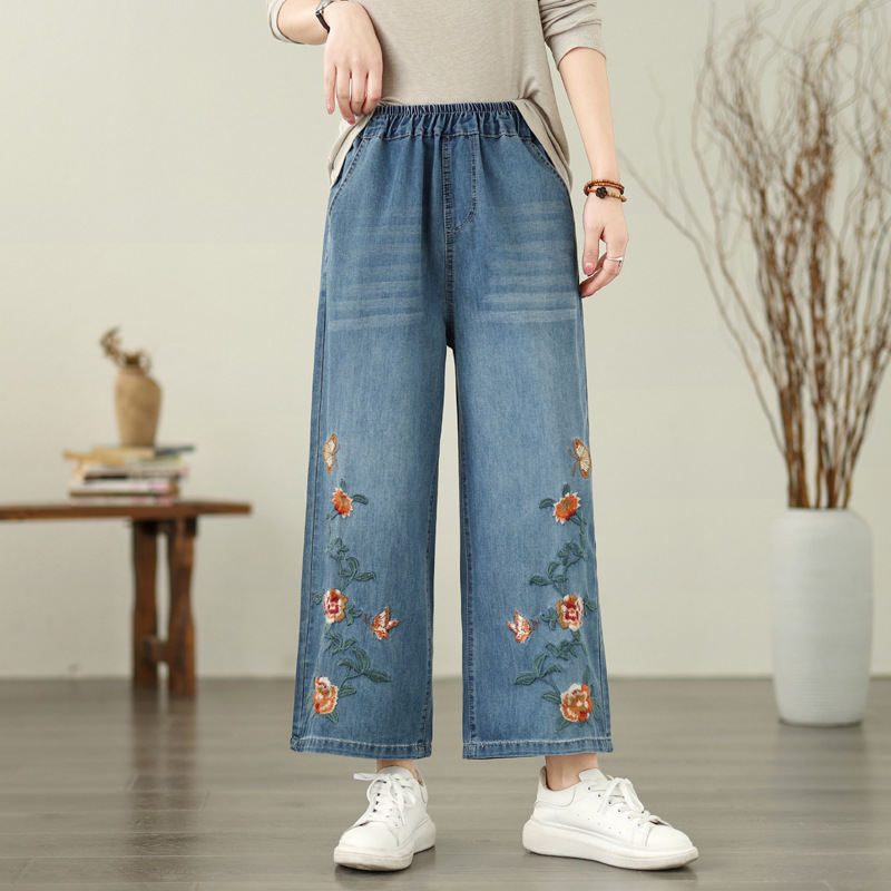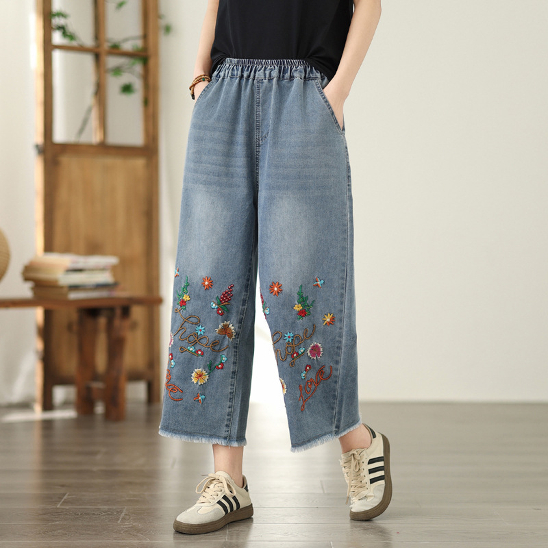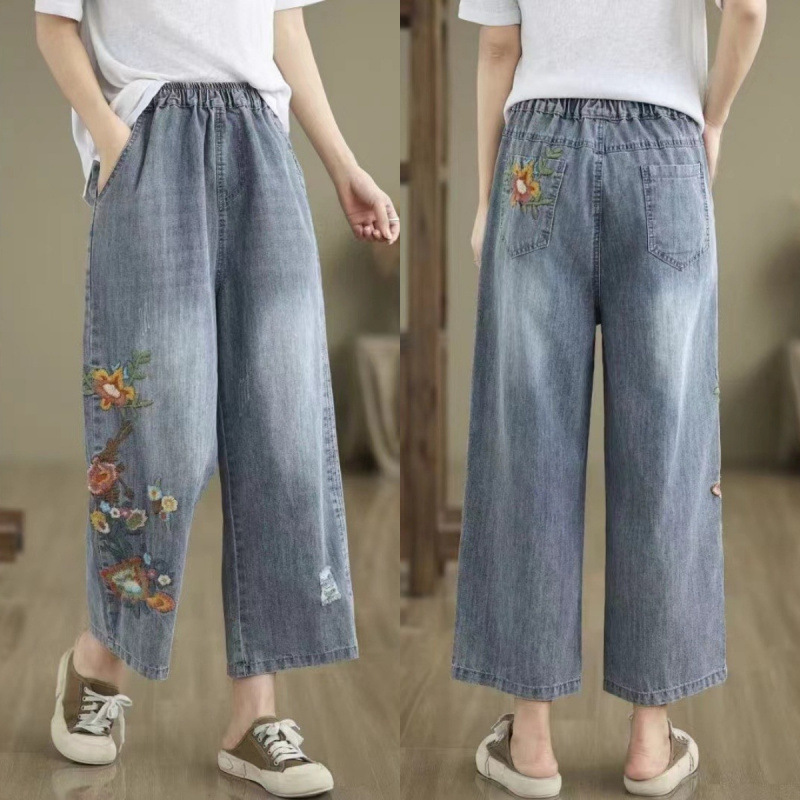 여성용 하이웨이스트 슬림 스트레이트 청바지 봄 여름 워싱 코튼 디스트레스드 자수 와이드 팬츠 9부 캐주얼 팬츠 다용도