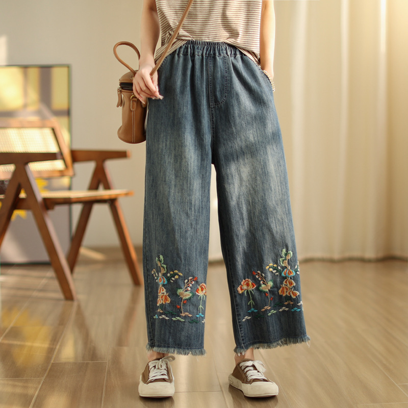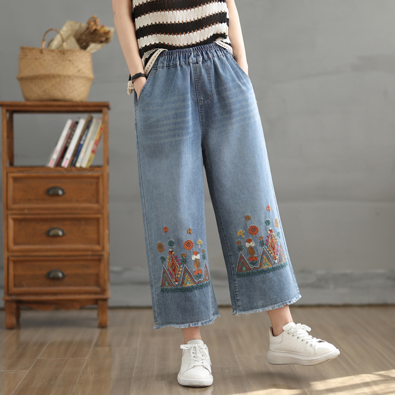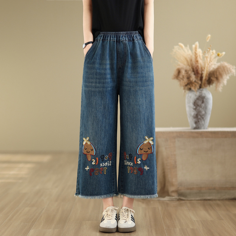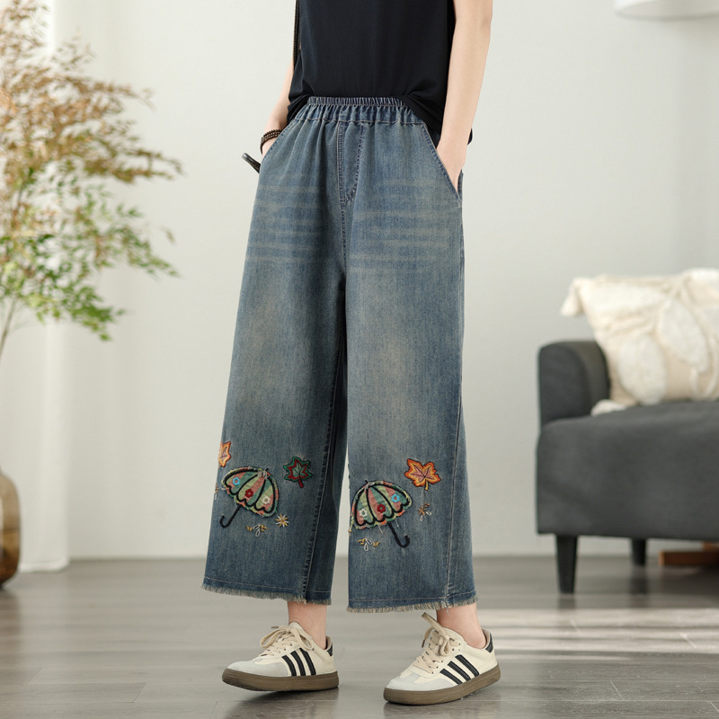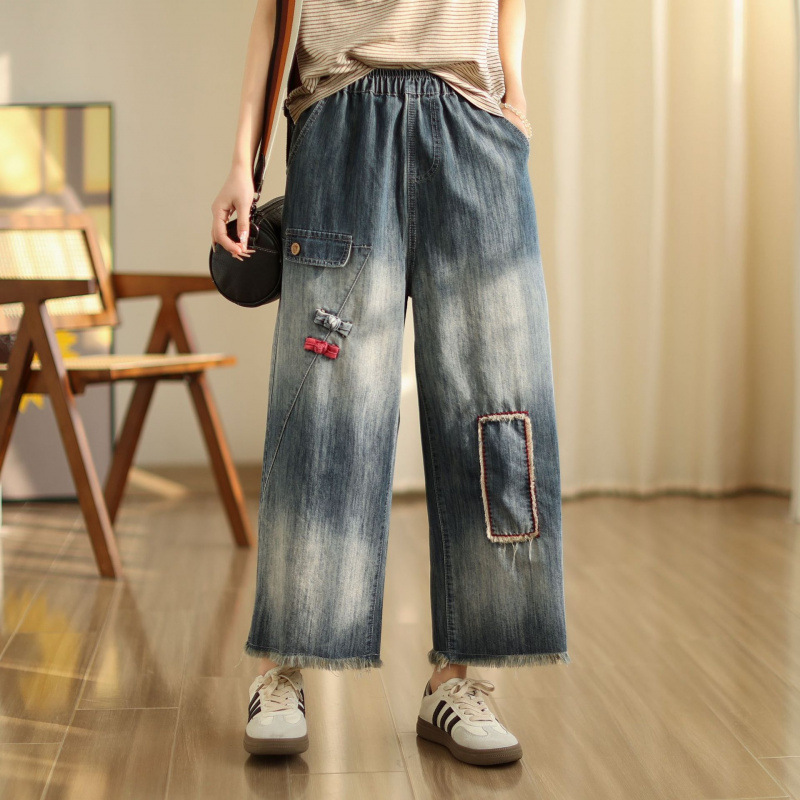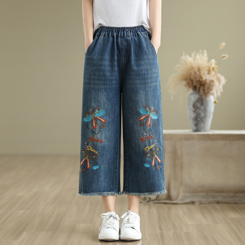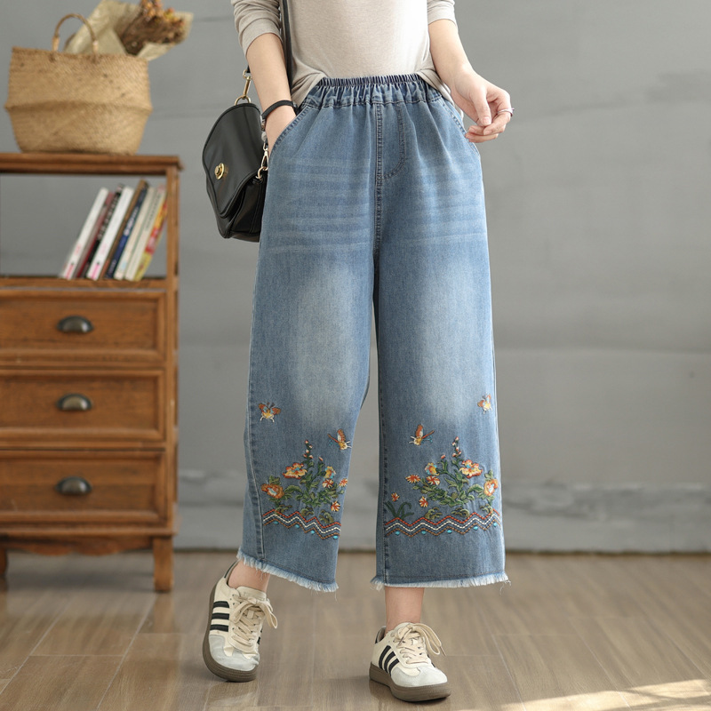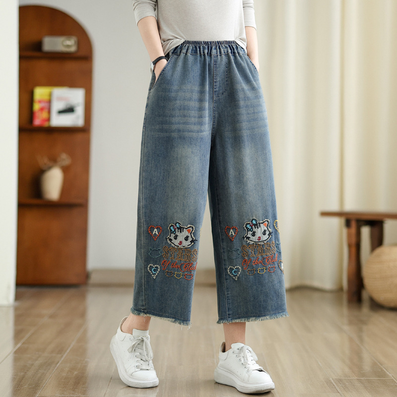 여성용 하이웨이스트 슬림 스트레이트 청바지 봄 여름 워싱 코튼 디스트레스드 자수 와이드 팬츠 9부 캐주얼 팬츠 다용도