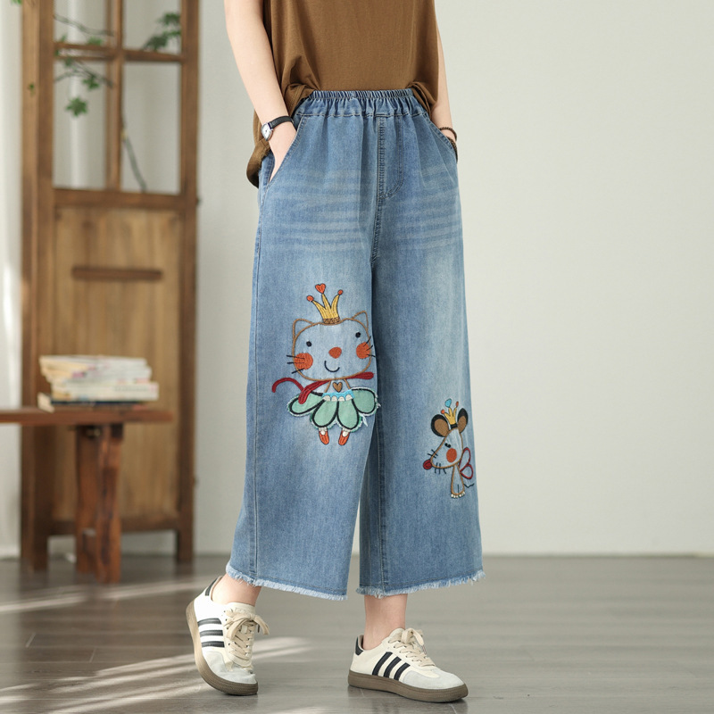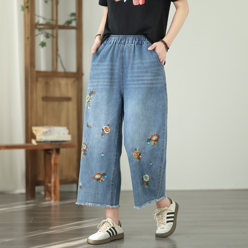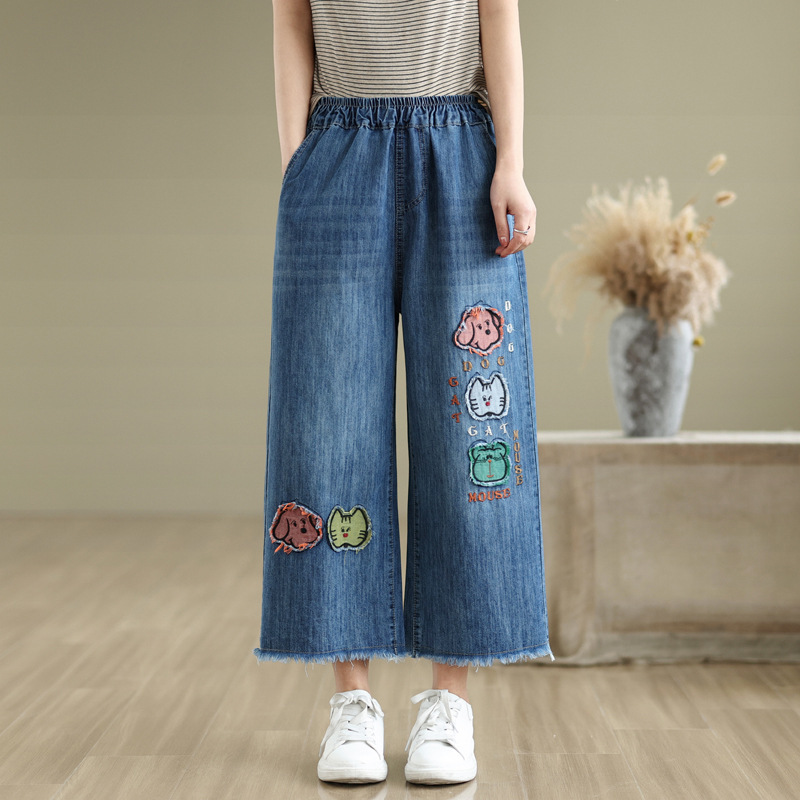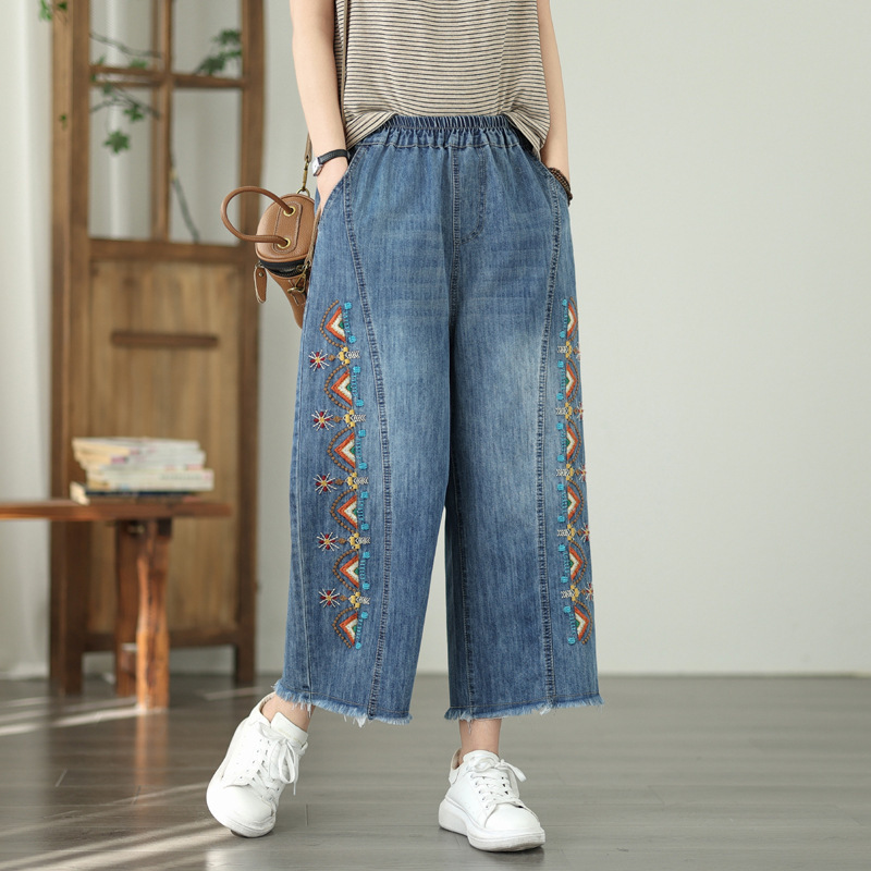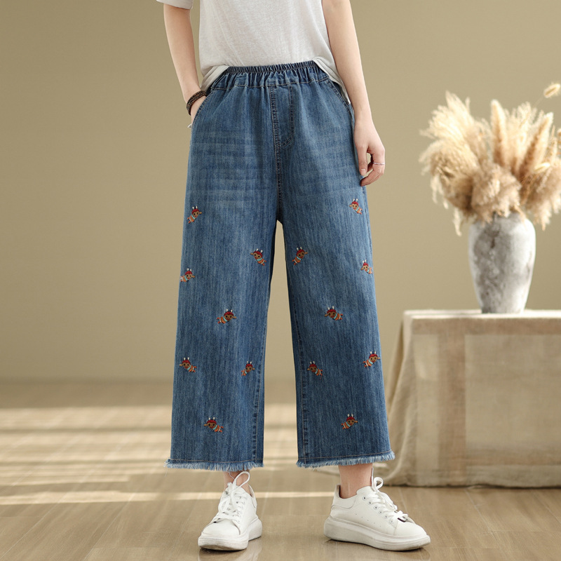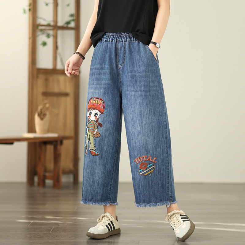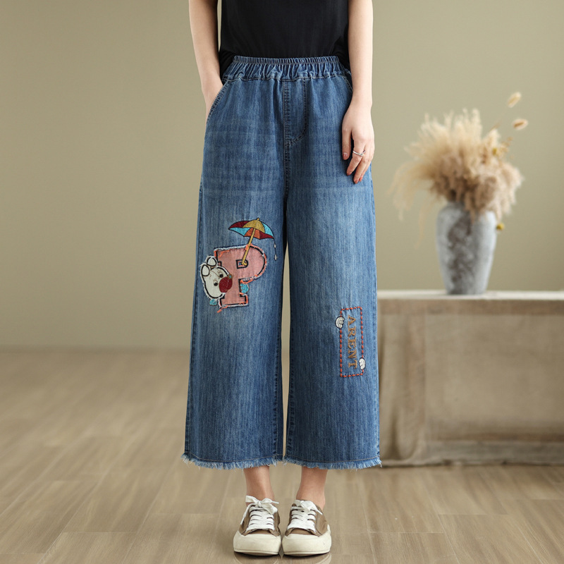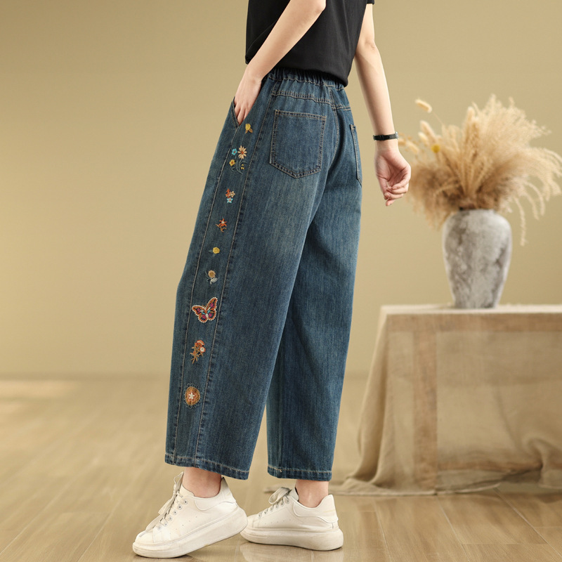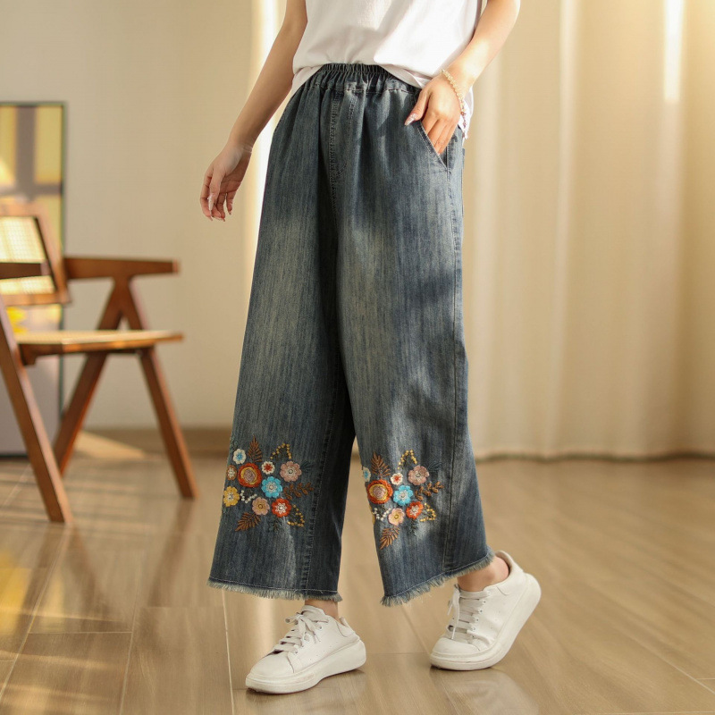 여성용 하이웨이스트 슬림 스트레이트 청바지 봄 여름 워싱 코튼 디스트레스드 자수 와이드 팬츠 9부 캐주얼 팬츠 다용도