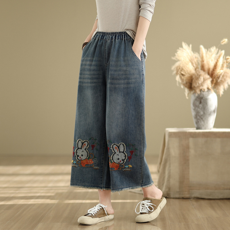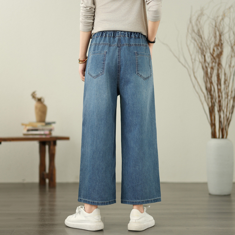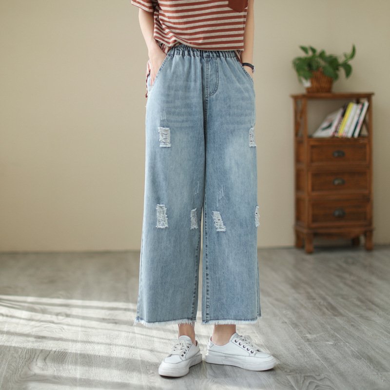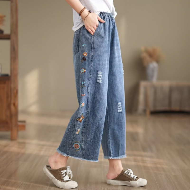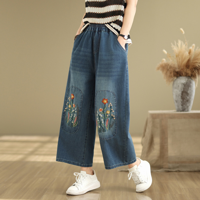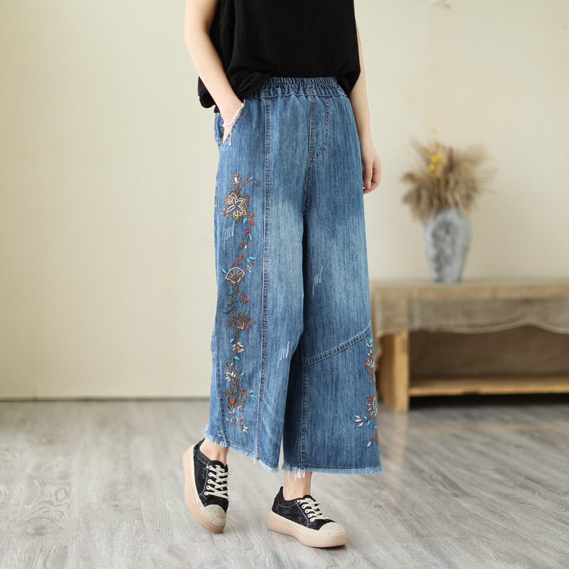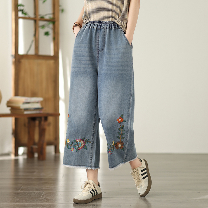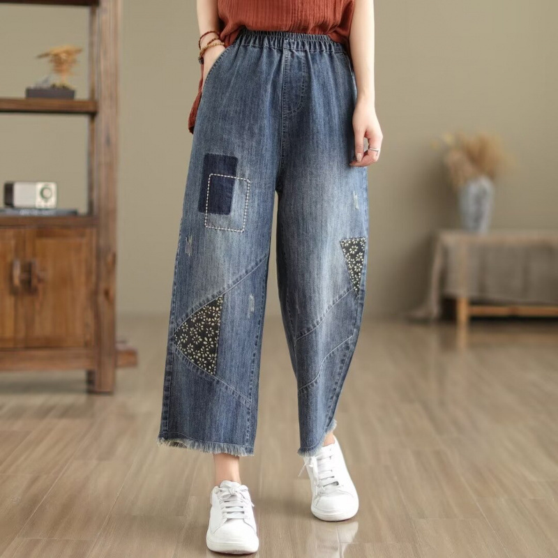 여성용 하이웨이스트 슬림 스트레이트 청바지 봄 여름 워싱 코튼 디스트레스드 자수 와이드 팬츠 9부 캐주얼 팬츠 다용도
