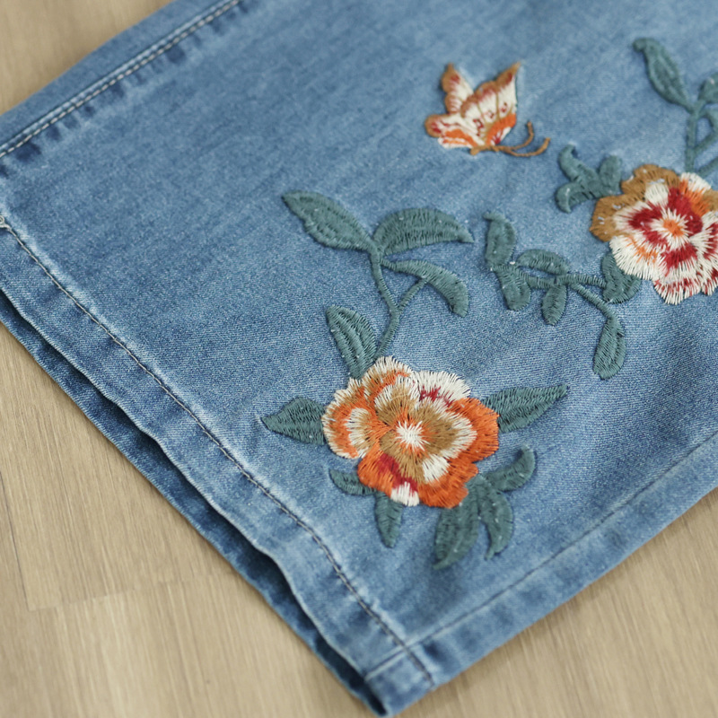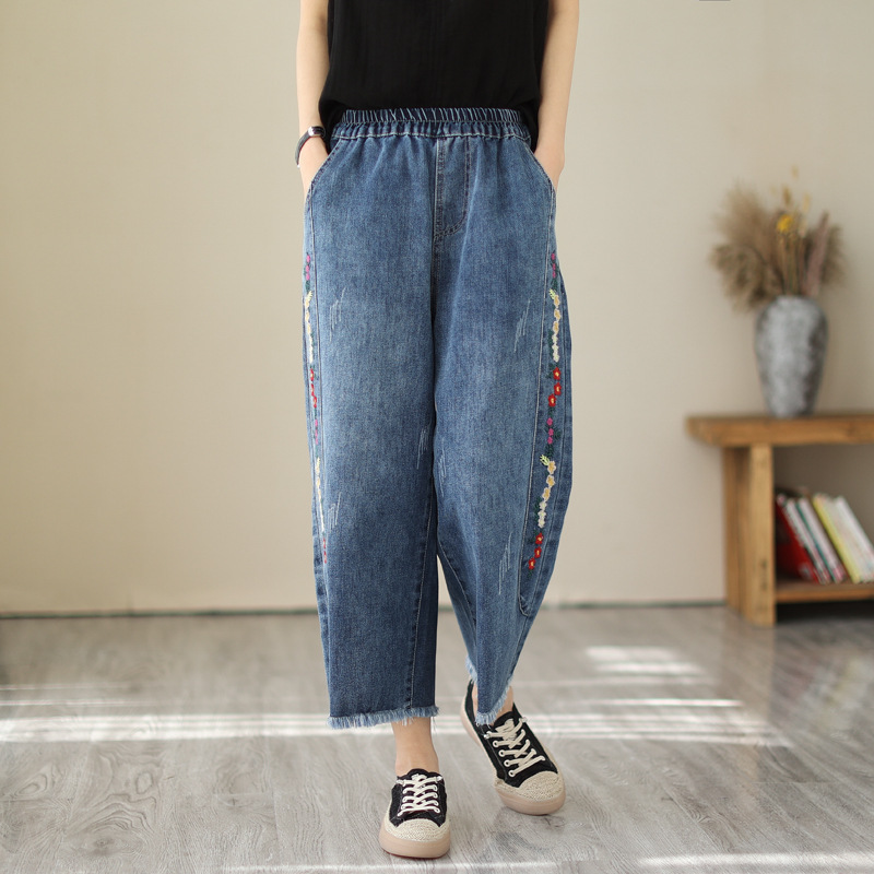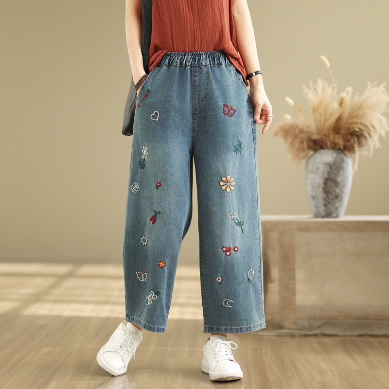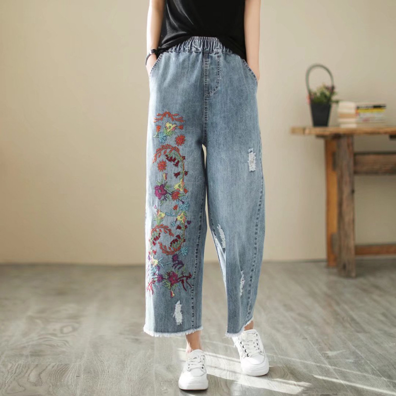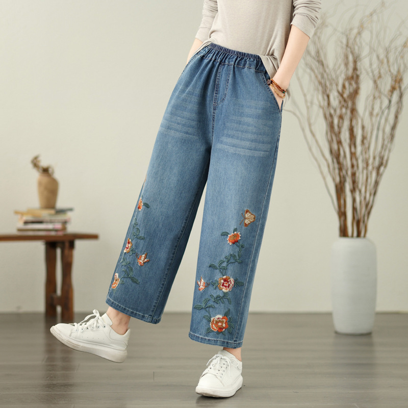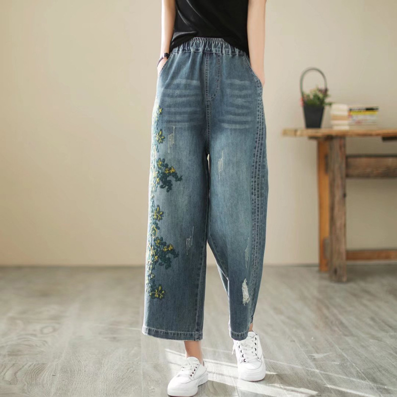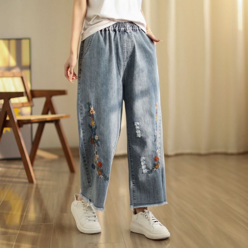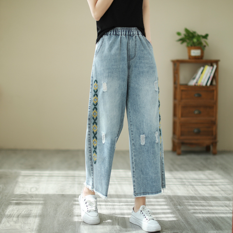 여성용 하이웨이스트 슬림 스트레이트 청바지 봄 여름 워싱 코튼 디스트레스드 자수 와이드 팬츠 9부 캐주얼 팬츠 다용도스토어 가기