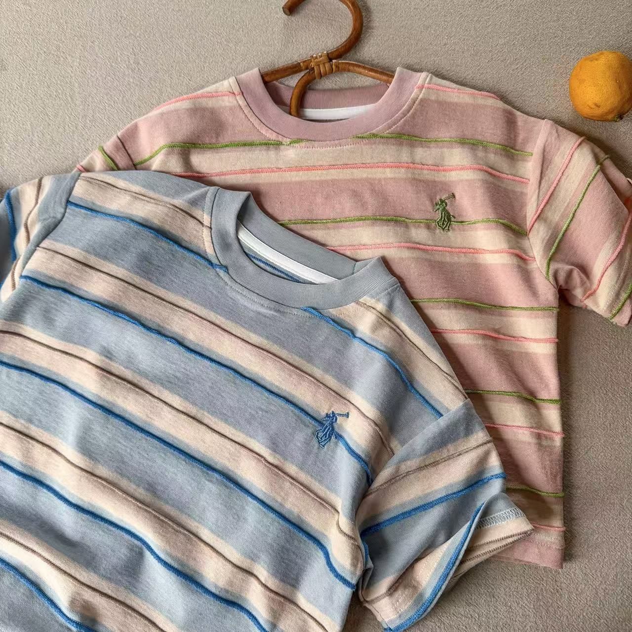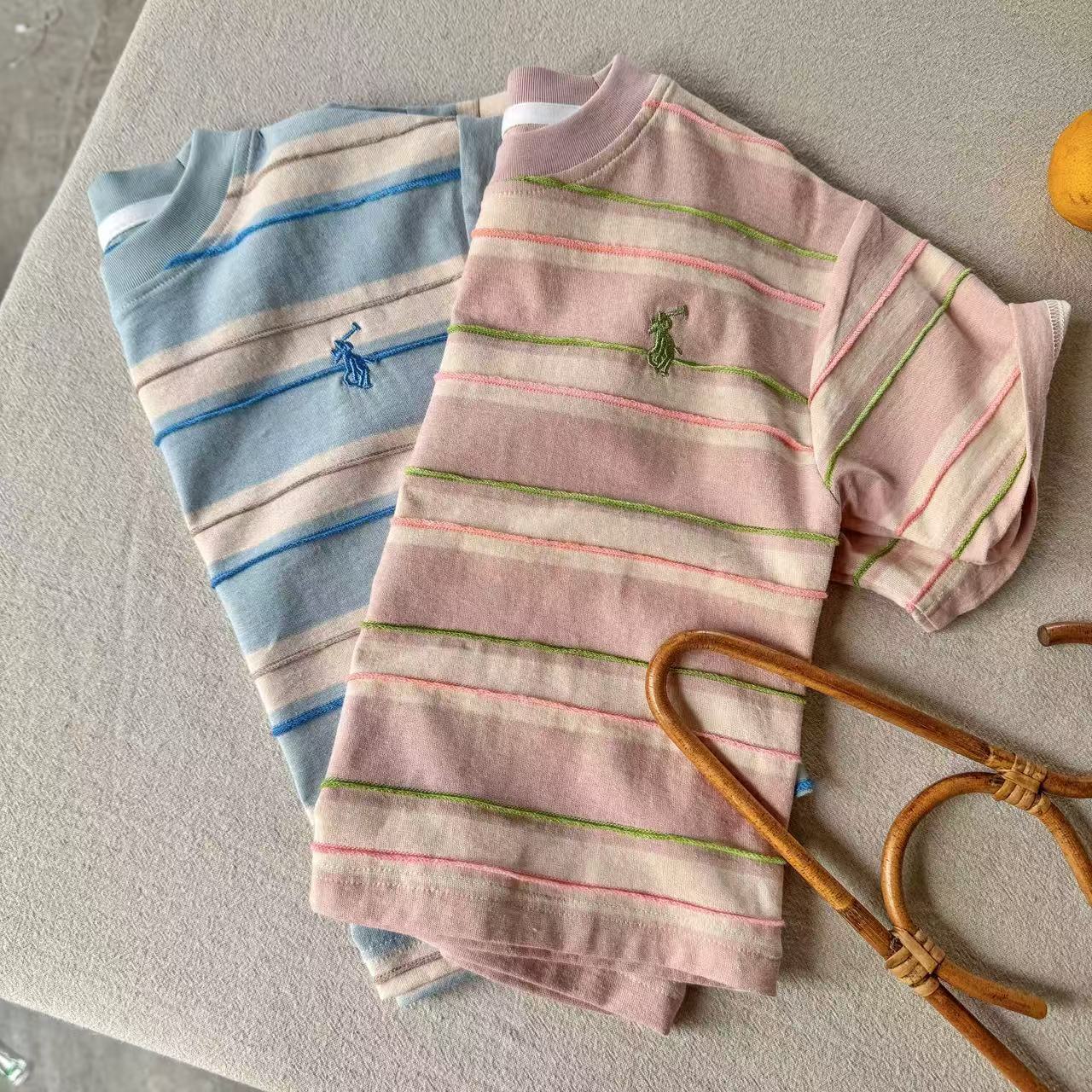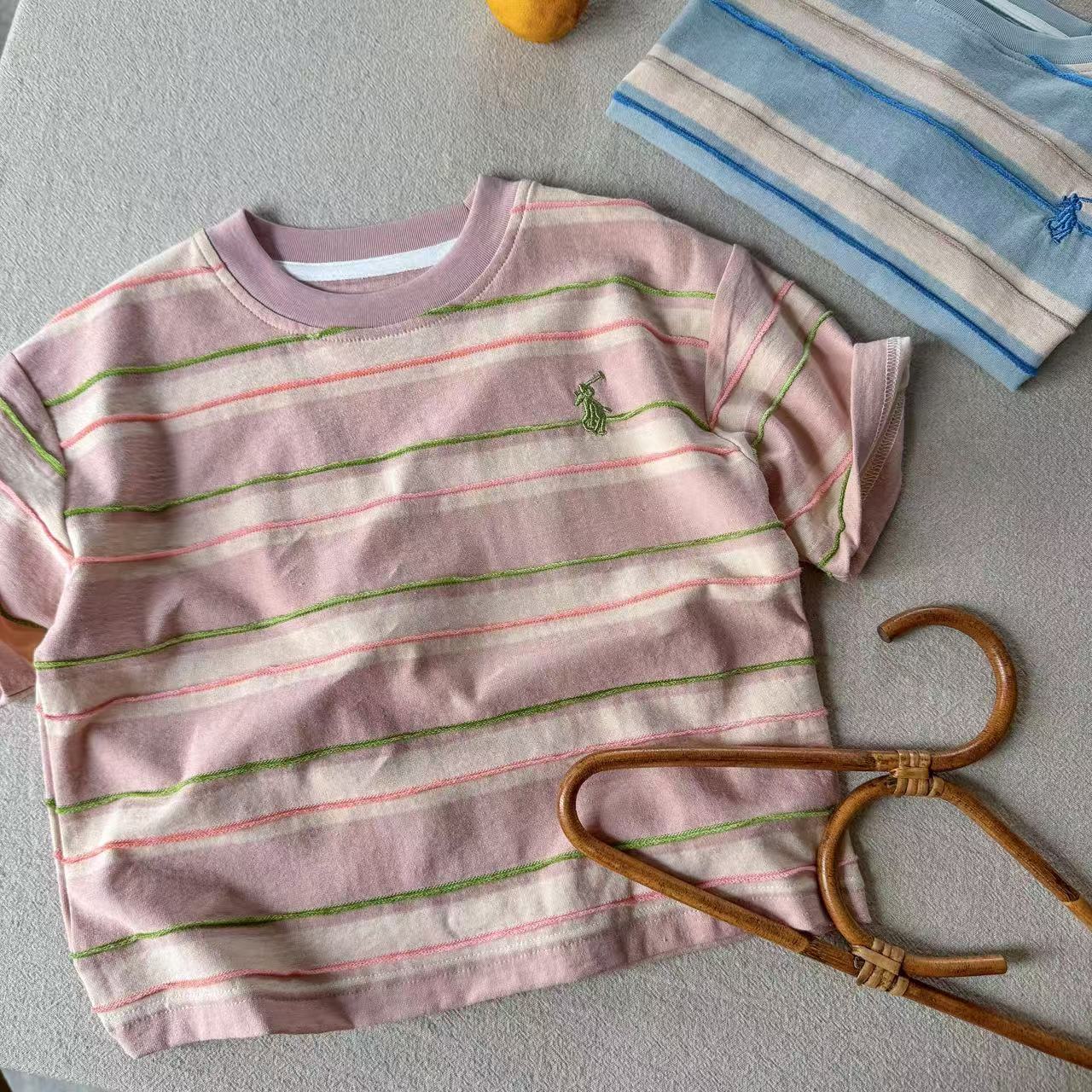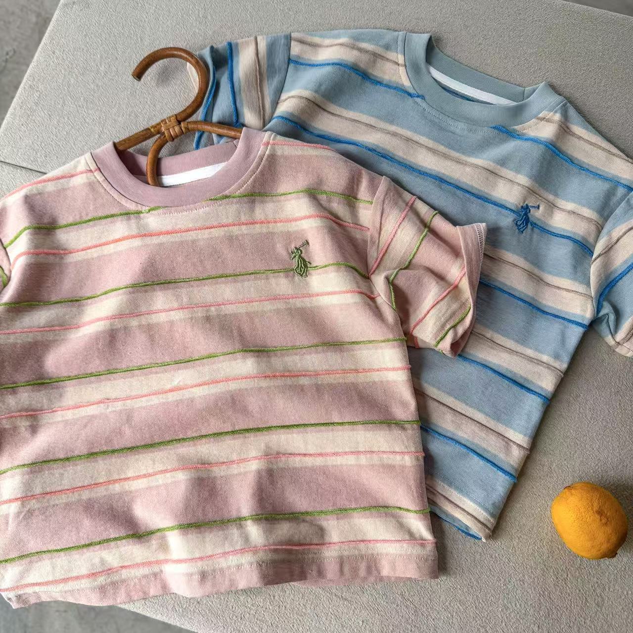 어린이 티셔츠 2025 여름 새로운 도착 소년과 소녀 다채로운 줄무늬 아기 느슨한 캐주얼 탑 트렌디 한 멋진 아동복