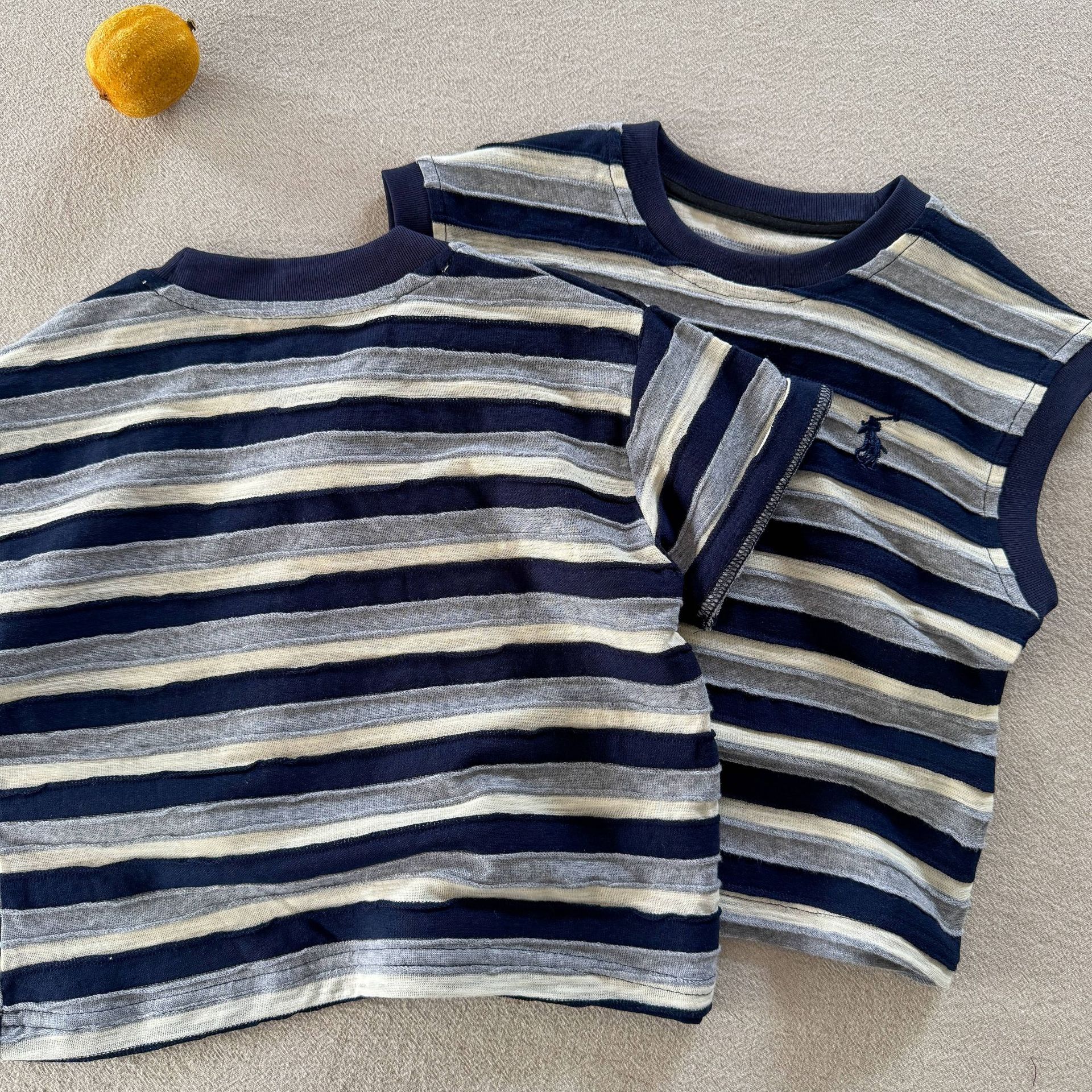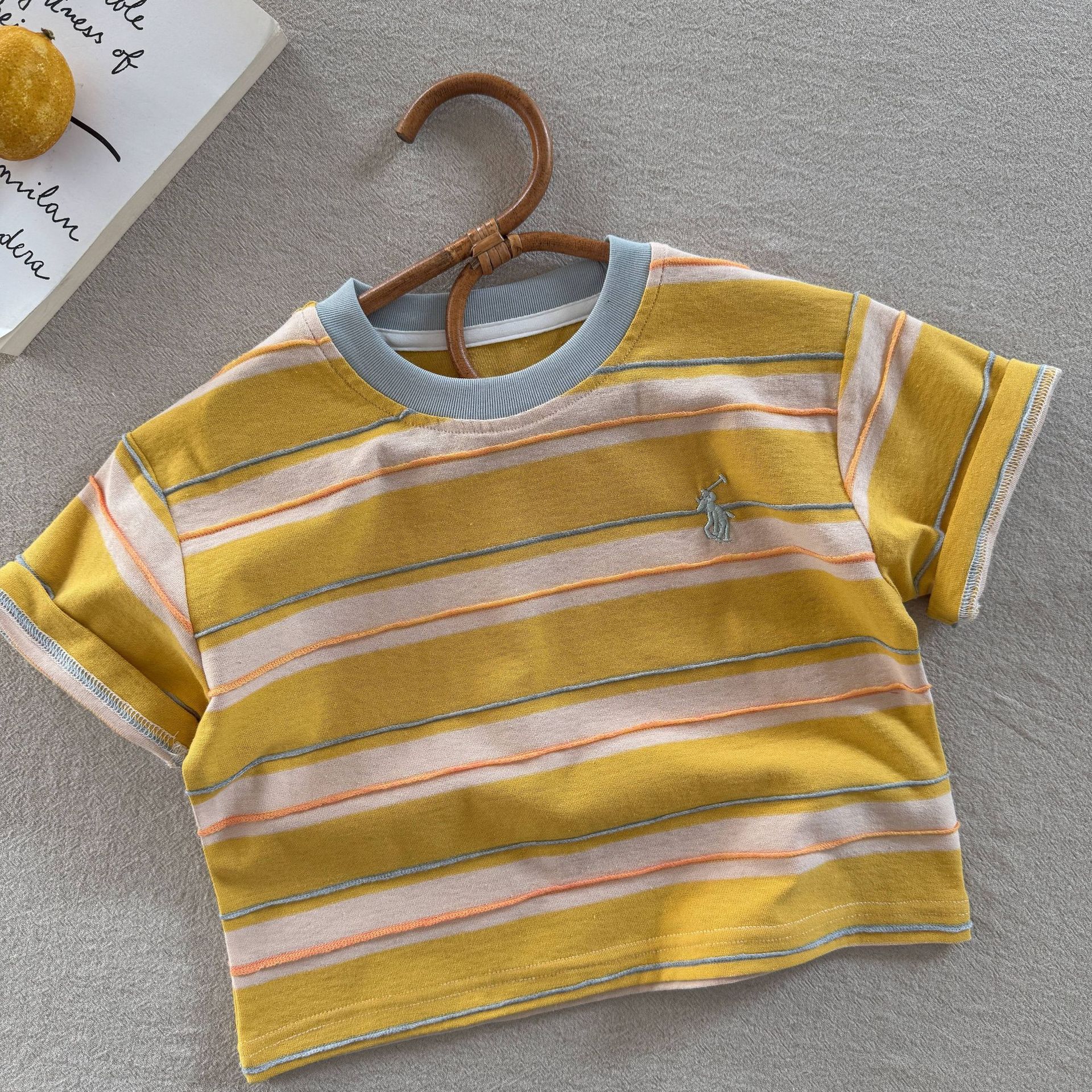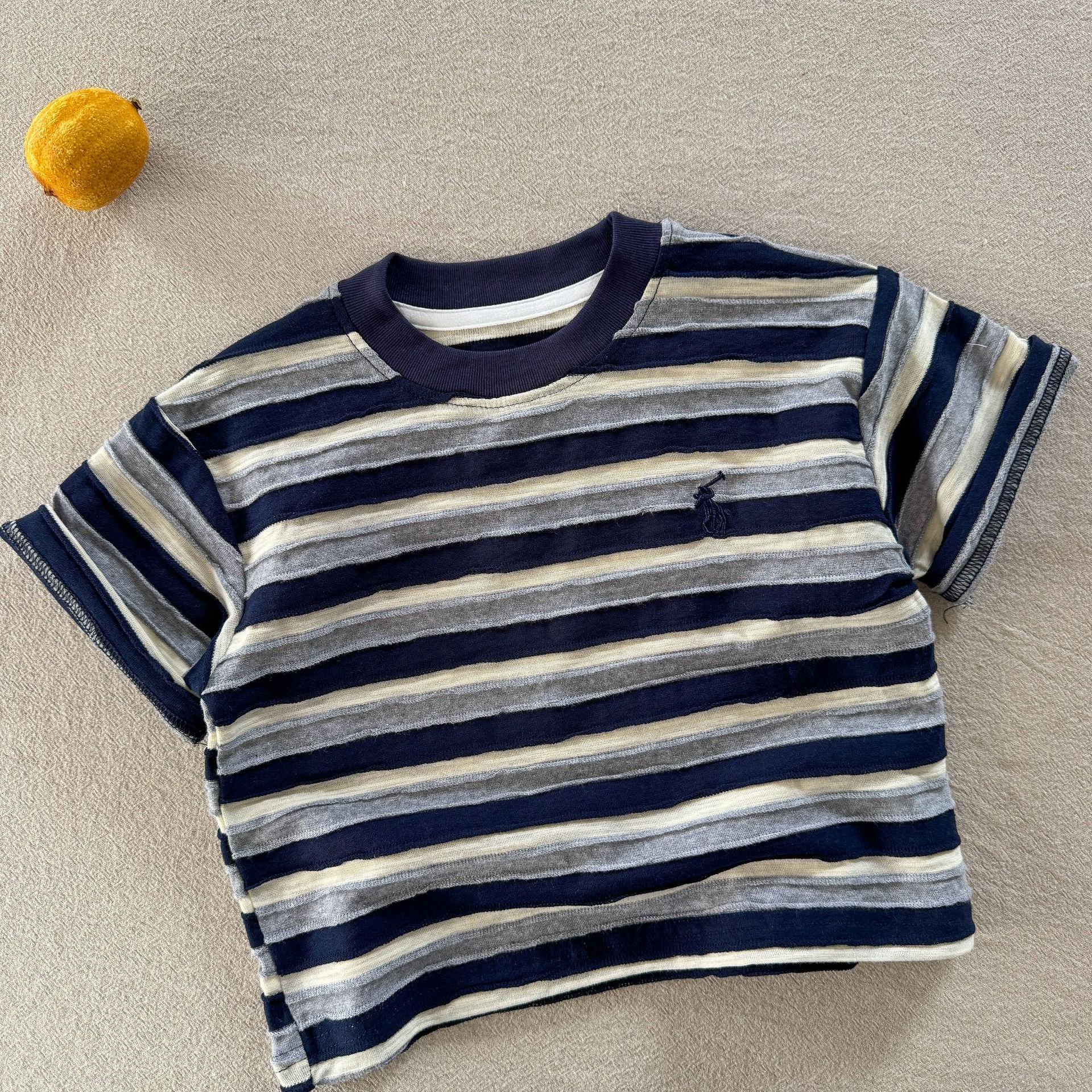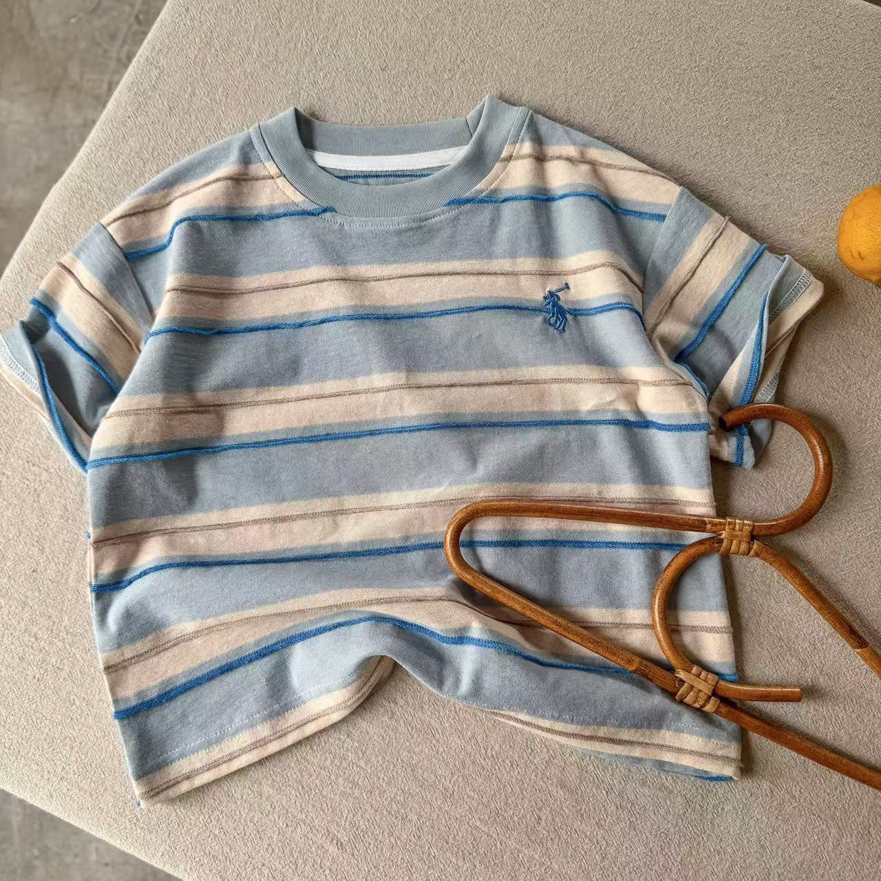 어린이 티셔츠 2025 여름 새로운 도착 소년과 소녀 다채로운 줄무늬 아기 느슨한 캐주얼 탑 트렌디 한 멋진 아동복