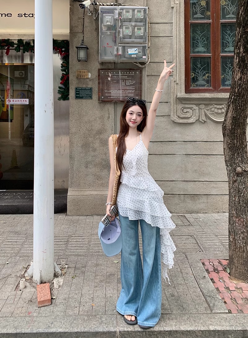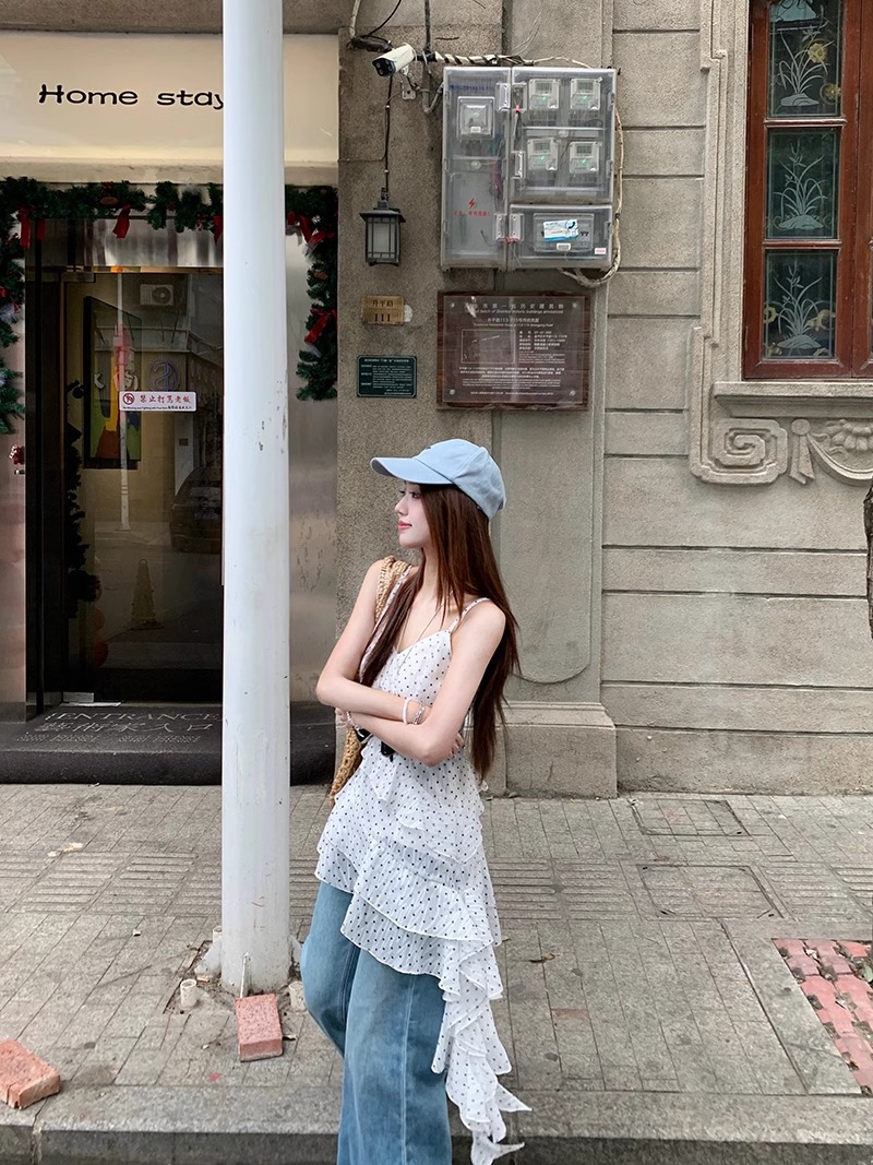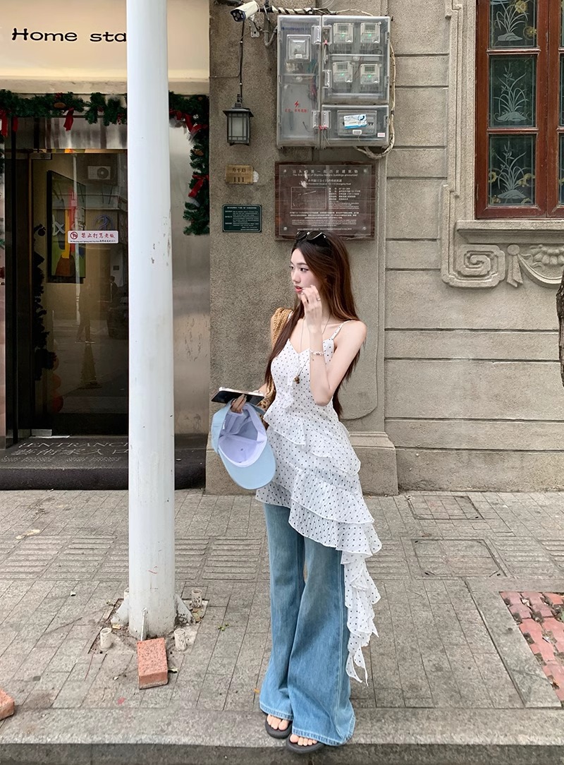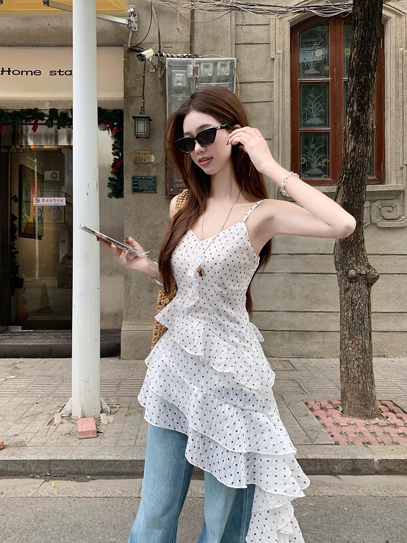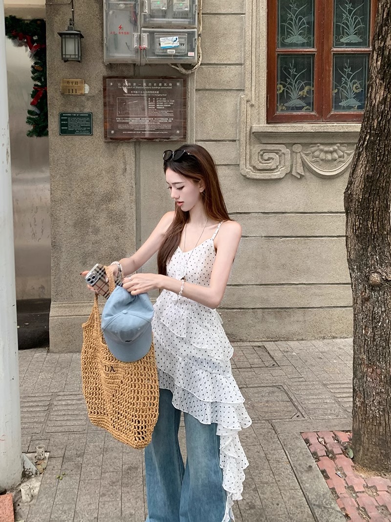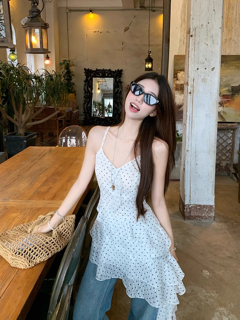 한국 스타일 폴카 도트 러플 스트랩 드레스 여성용 2026년 초봄 신상 해변 휴양 스타일 불규칙 스커트 트렌디스토어 가기