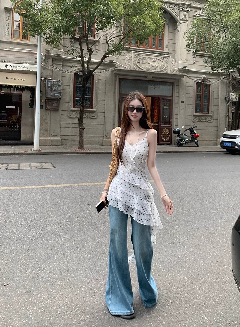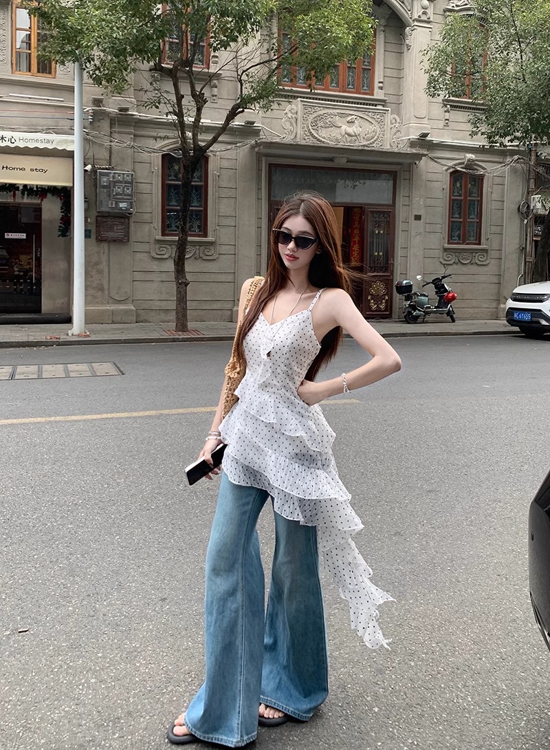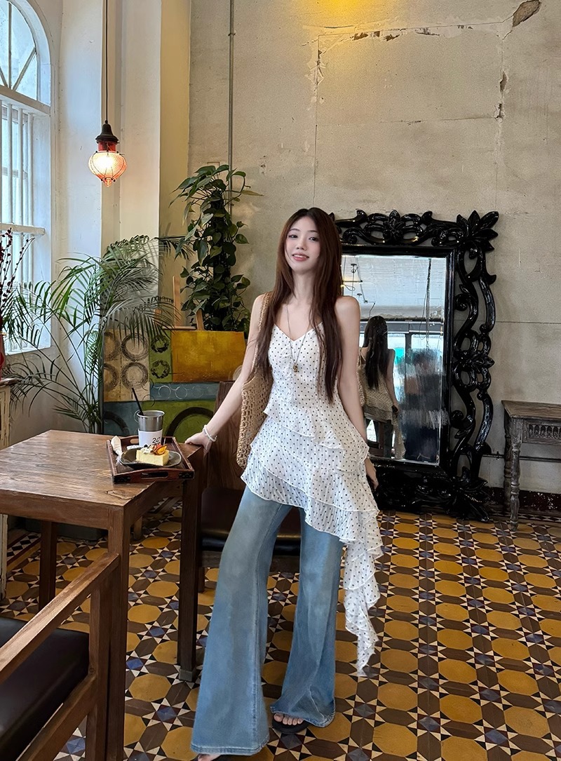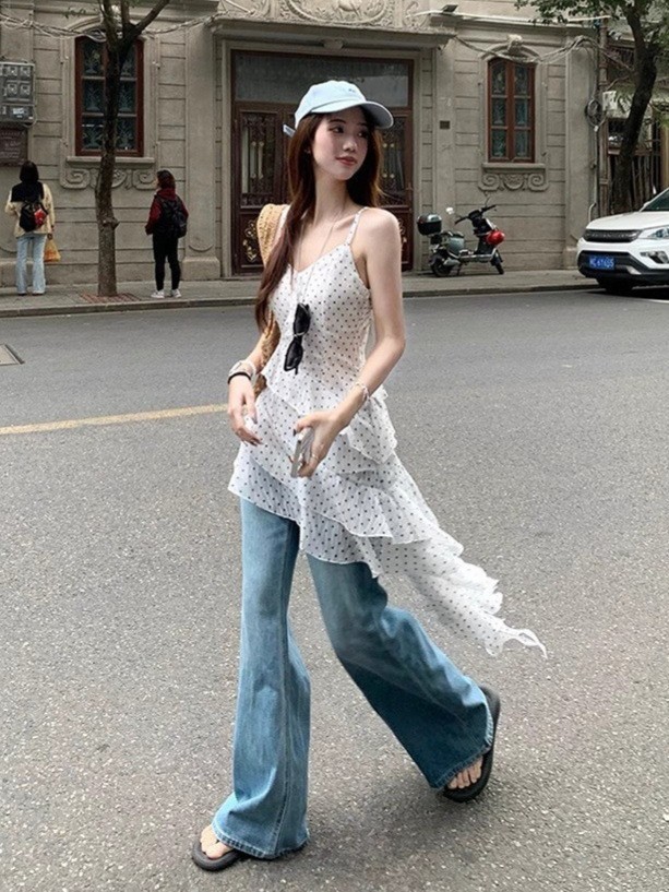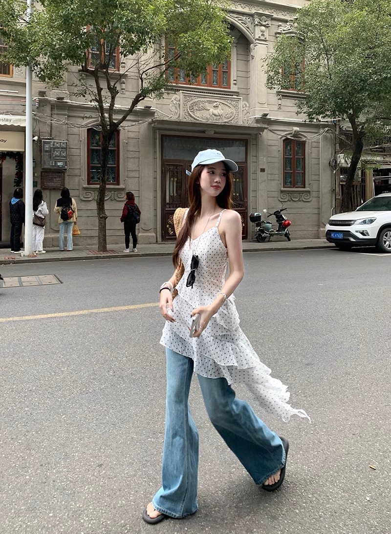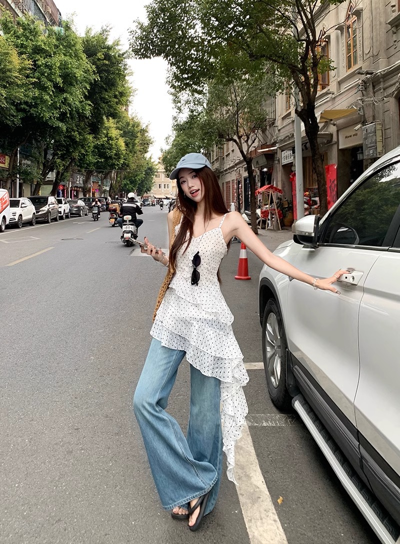 한국 스타일 폴카 도트 러플 스트랩 드레스 여성용 2026년 초봄 신상 해변 휴양 스타일 불규칙 스커트 트렌디스토어 가기