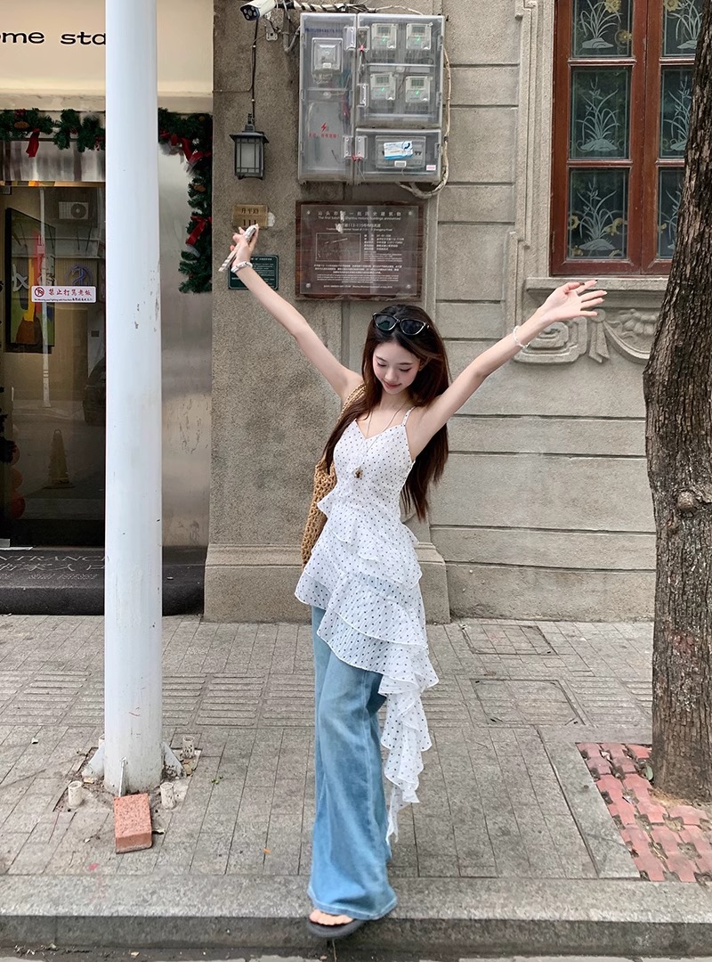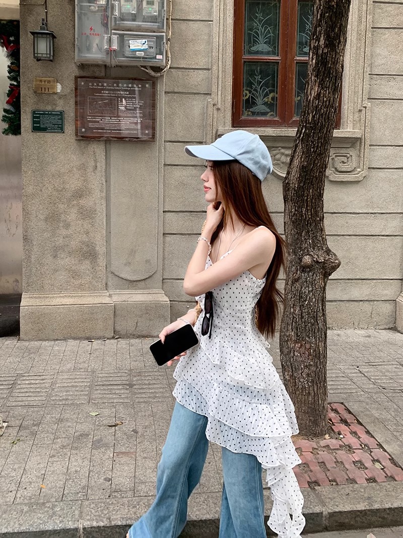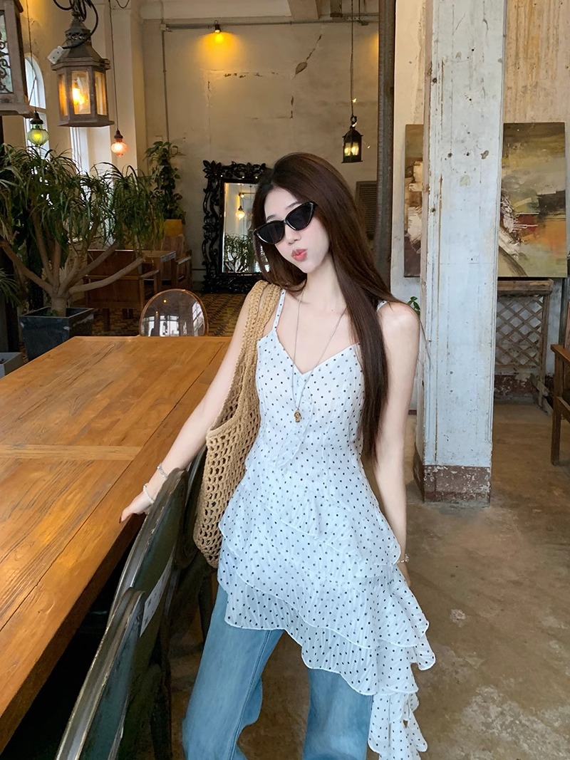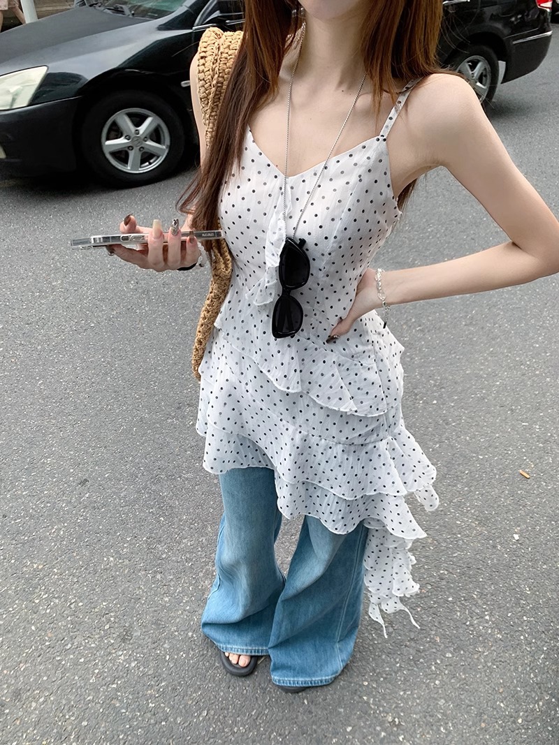 한국 스타일 폴카 도트 러플 스트랩 드레스 여성용 2026년 초봄 신상 해변 휴양 스타일 불규칙 스커트 트렌디