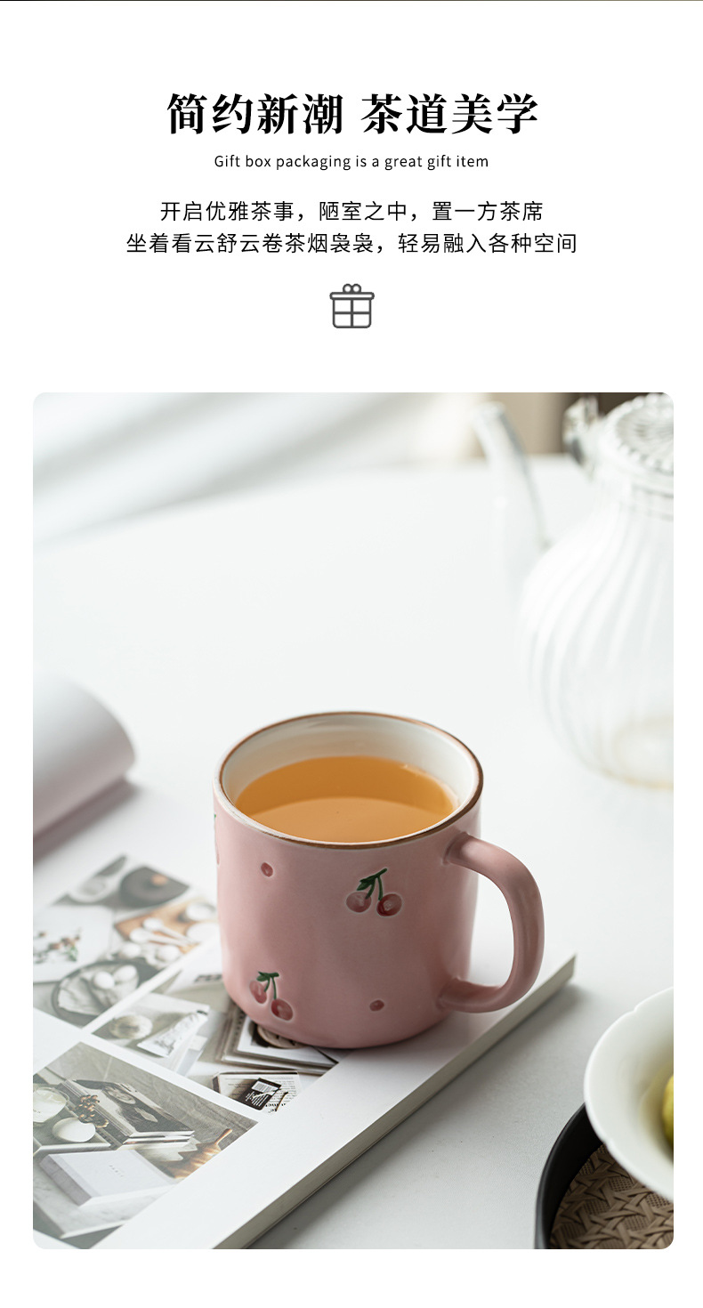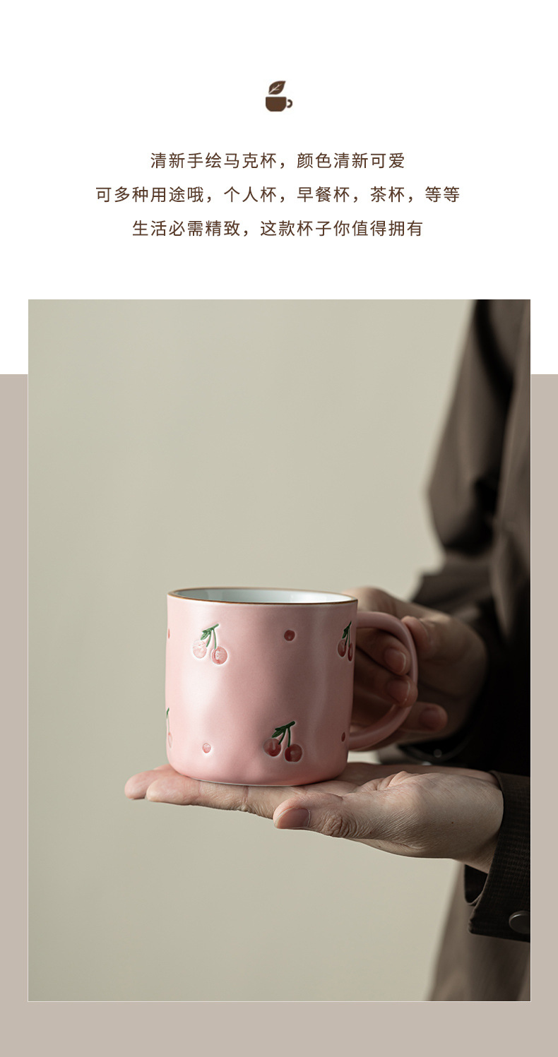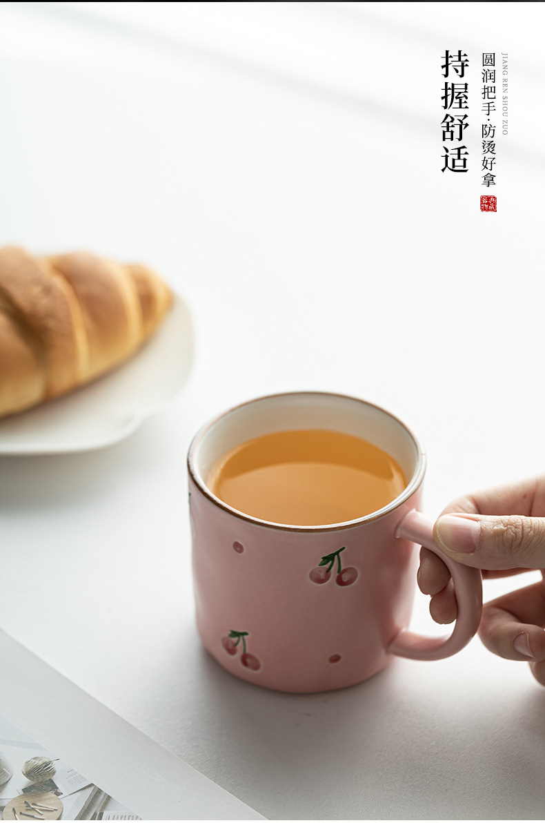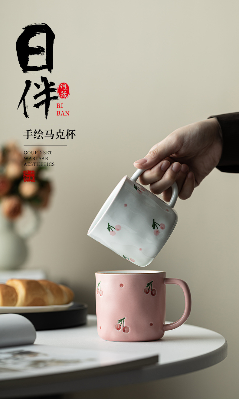 Dehua 손으로 그린 체리 머그컵 세라믹 커플 커피 컵 가정용 간단한 고가치 아침 식사 컵 워터 컵