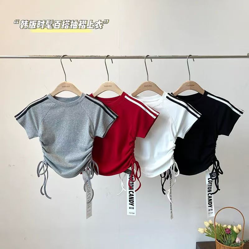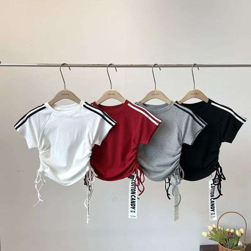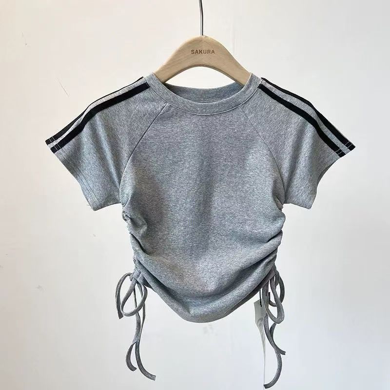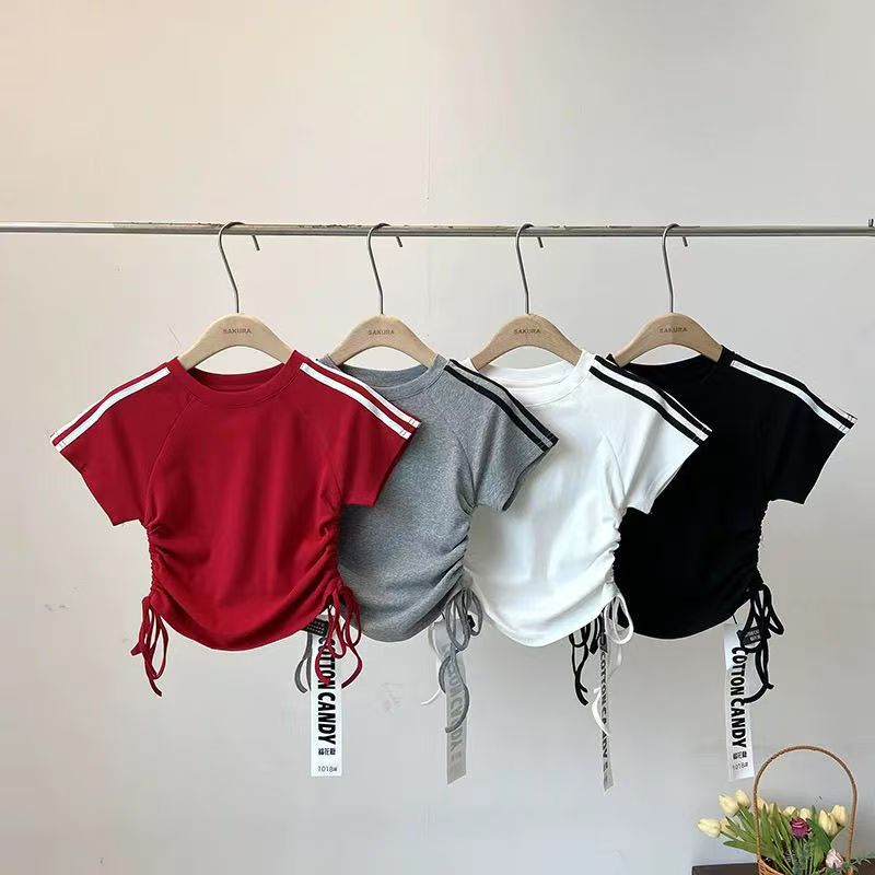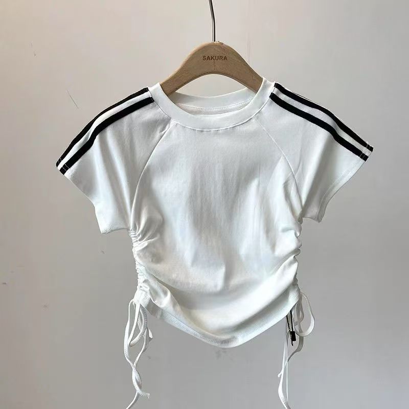 여자 어깨 끈 컬러 매칭 라운드 넥 티셔츠 아메리칸 레트로 새로운 짧은 슬림 핏 반팔 여름 올 매치 탑스토어 가기