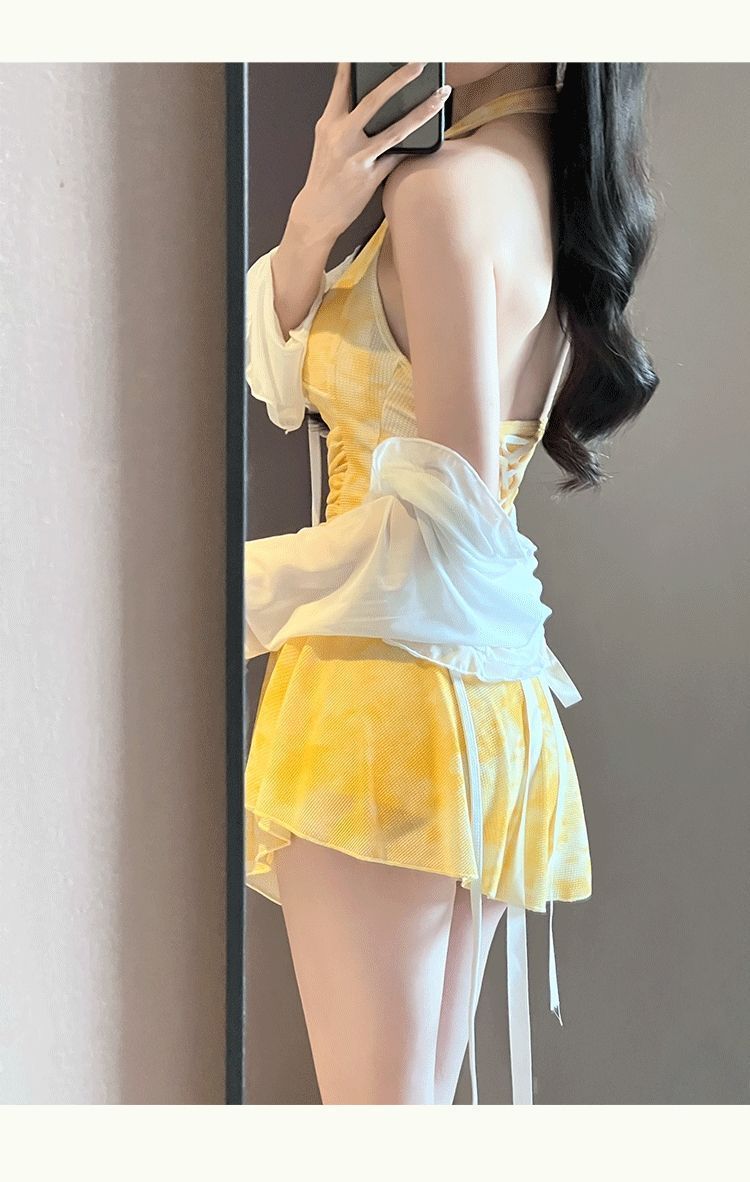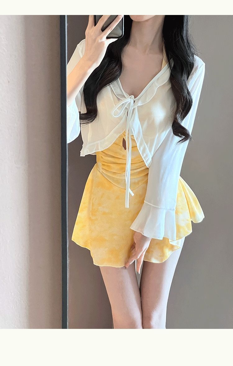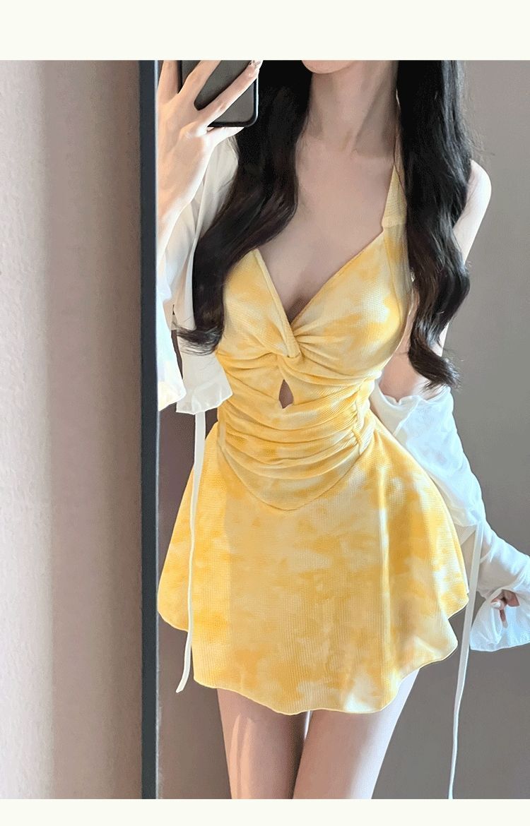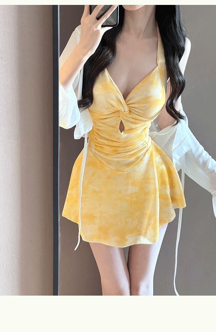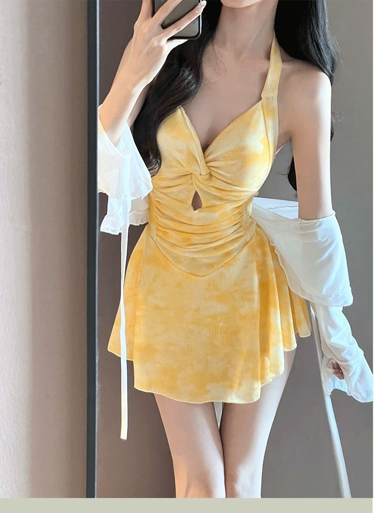 2025년 신작 여성 온천 수영복, 보수적인 작은 가슴 푸쉬업, 순수한 욕망, 슬리밍, 등이 없는 원피스 스커트 수영복, 홀터넥