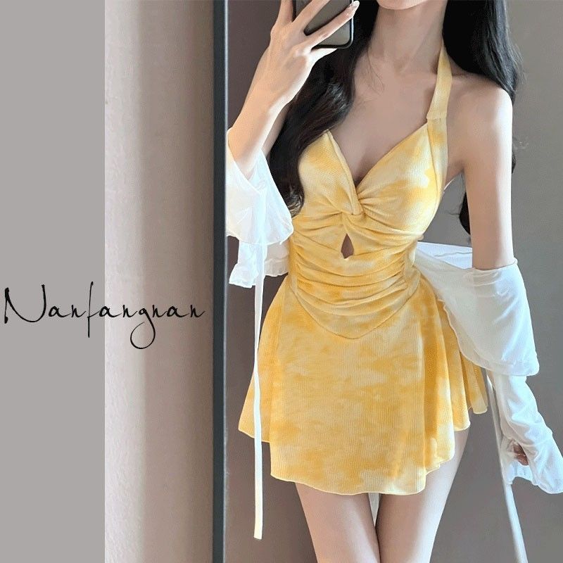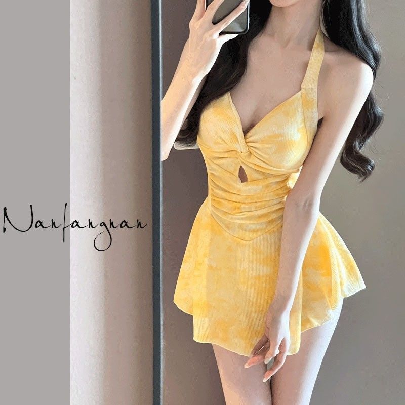 2025년 신작 여성 온천 수영복, 보수적인 작은 가슴 푸쉬업, 순수한 욕망, 슬리밍, 등이 없는 원피스 스커트 수영복, 홀터넥스토어 가기