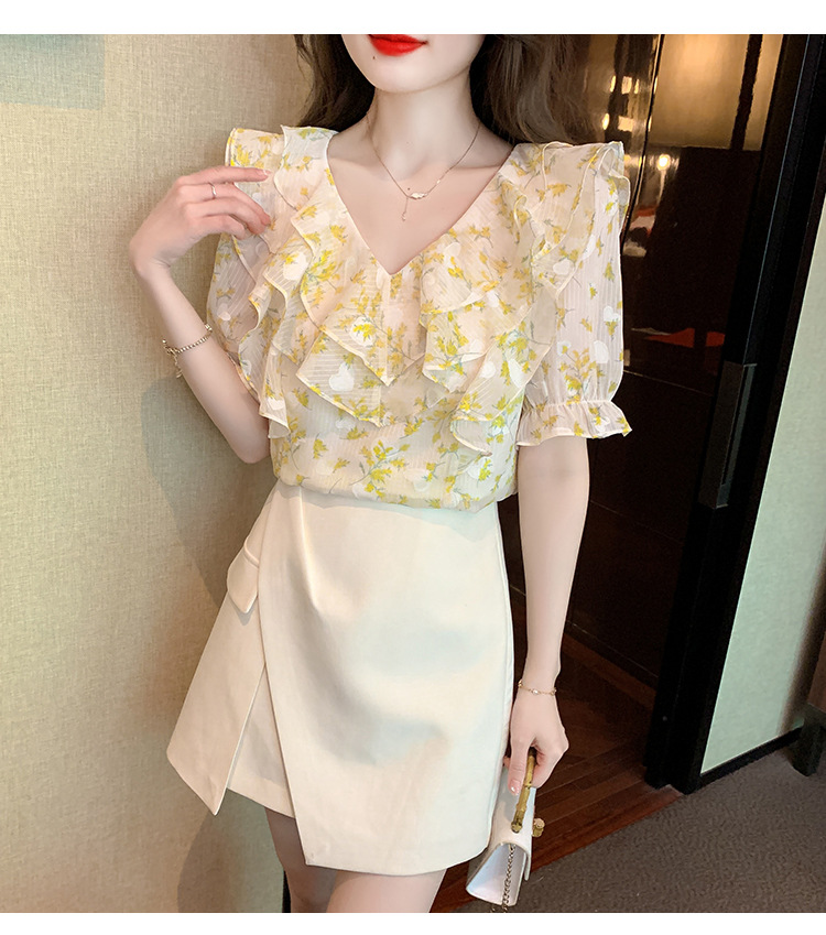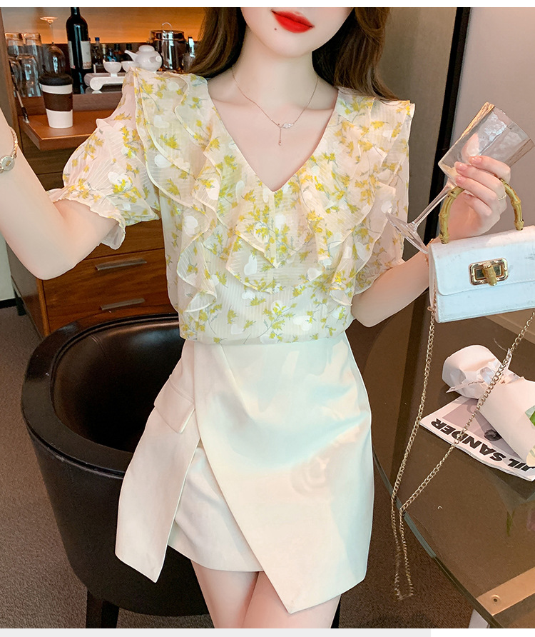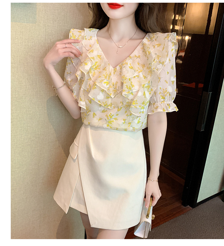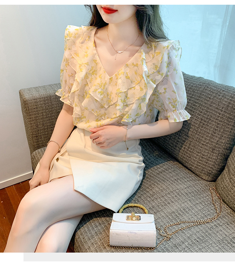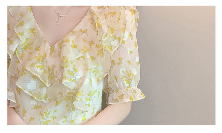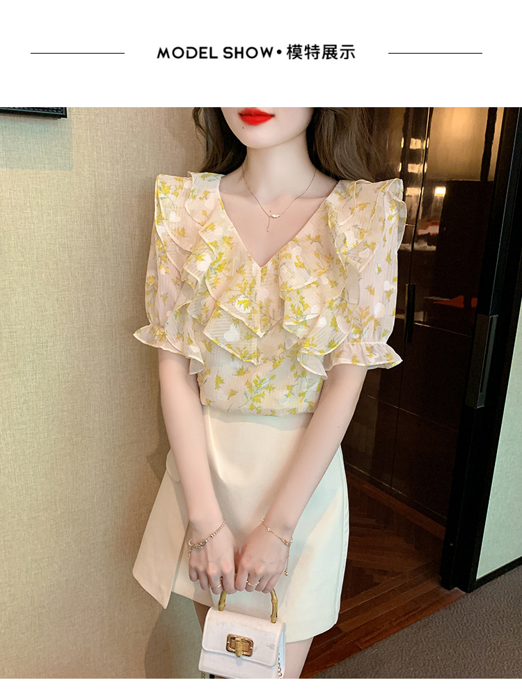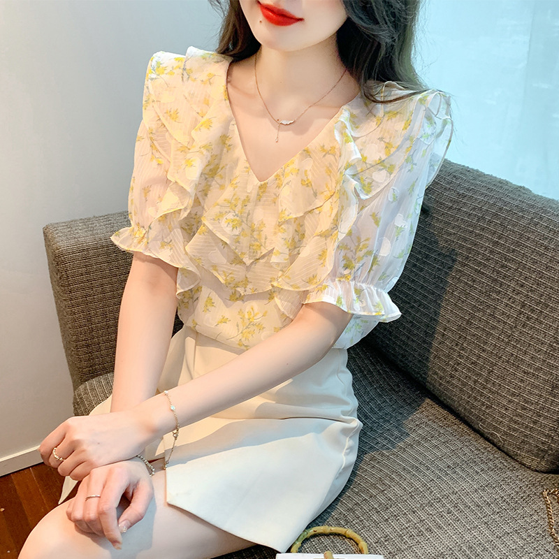 여성을위한 V 넥 쉬폰 셔츠 2025 여름 새로운 패션 달콤한 프릴 꽃 탑 반팔 유행 셔츠