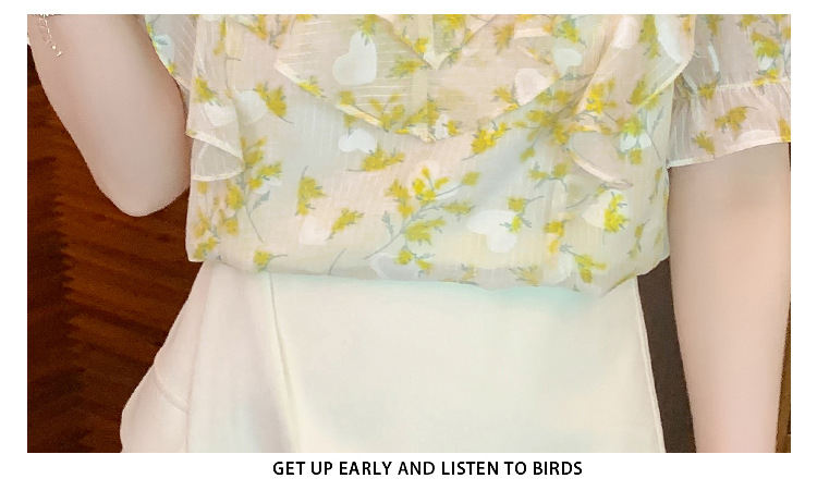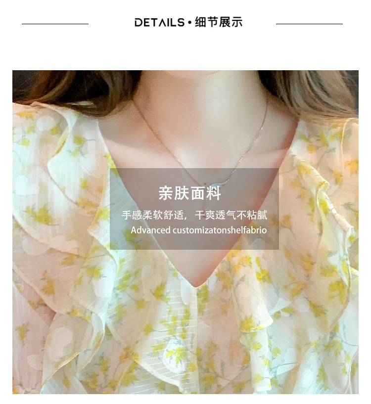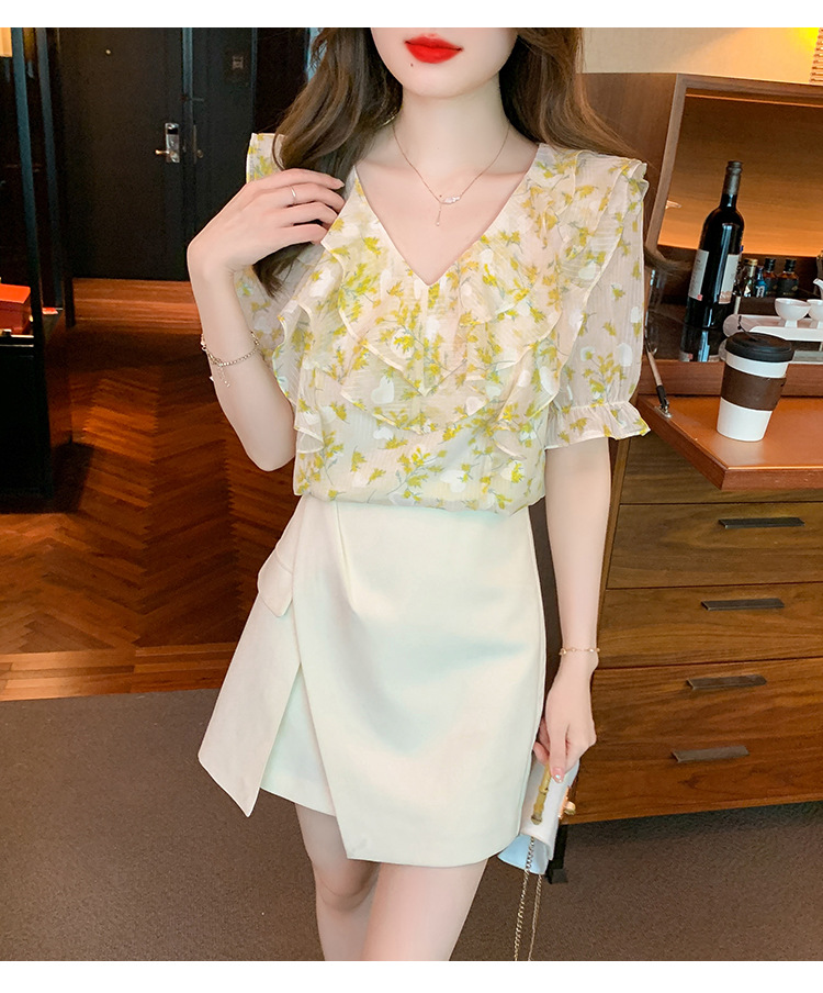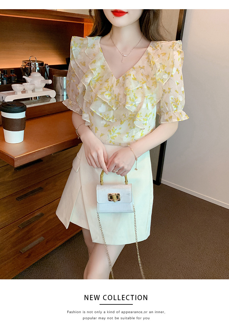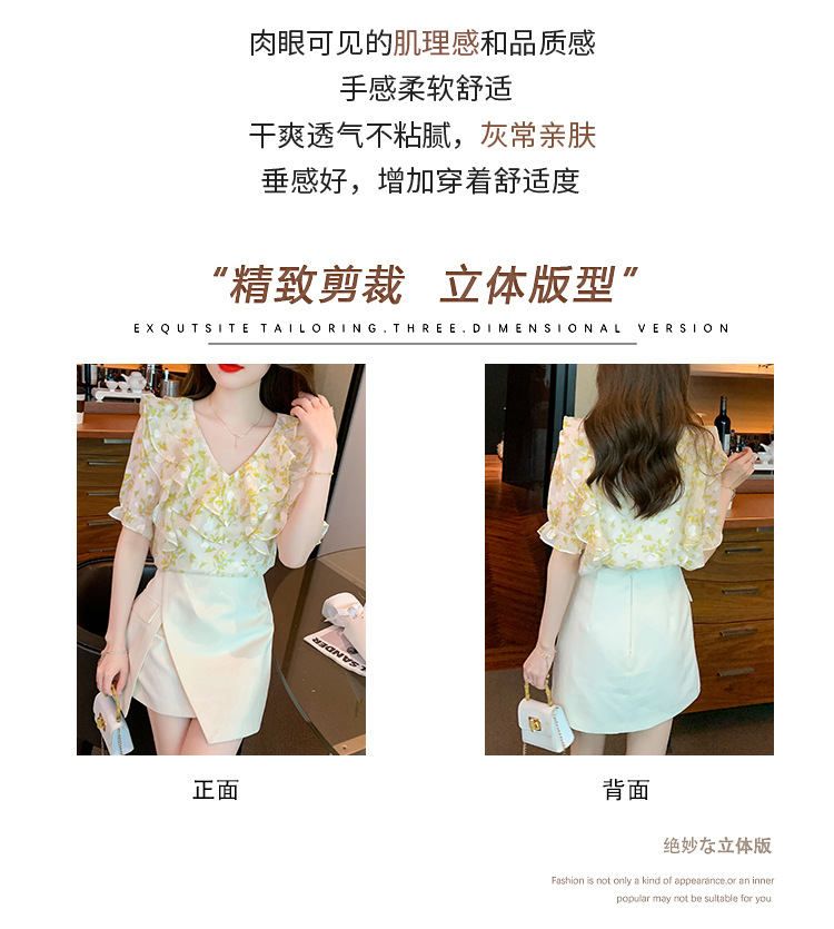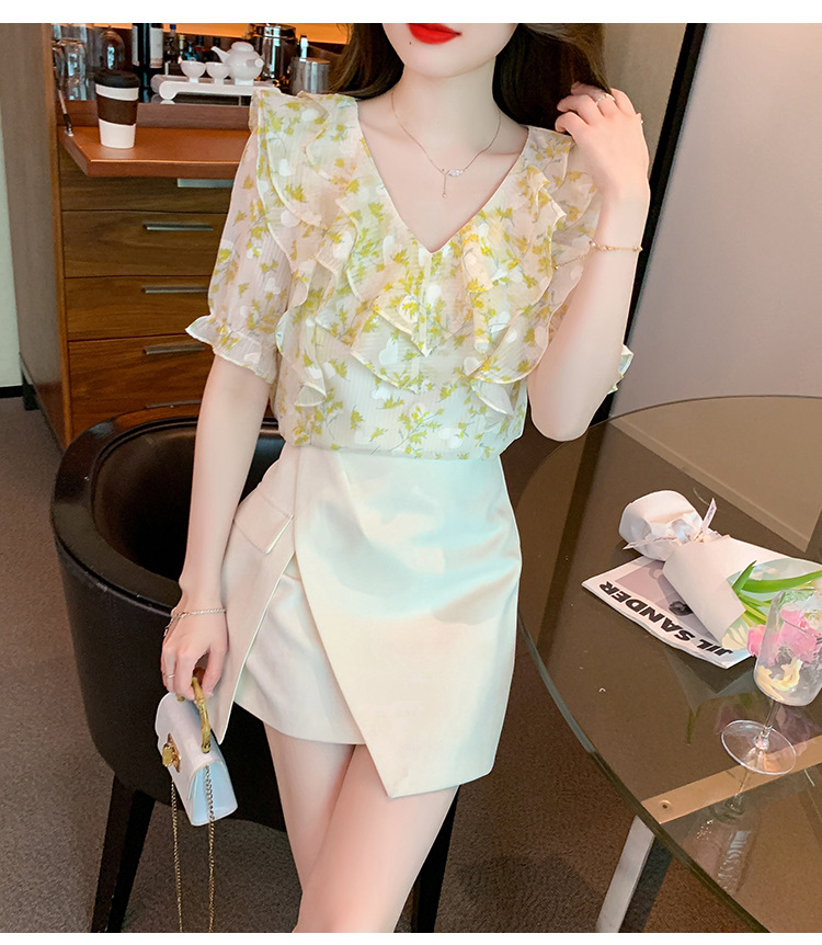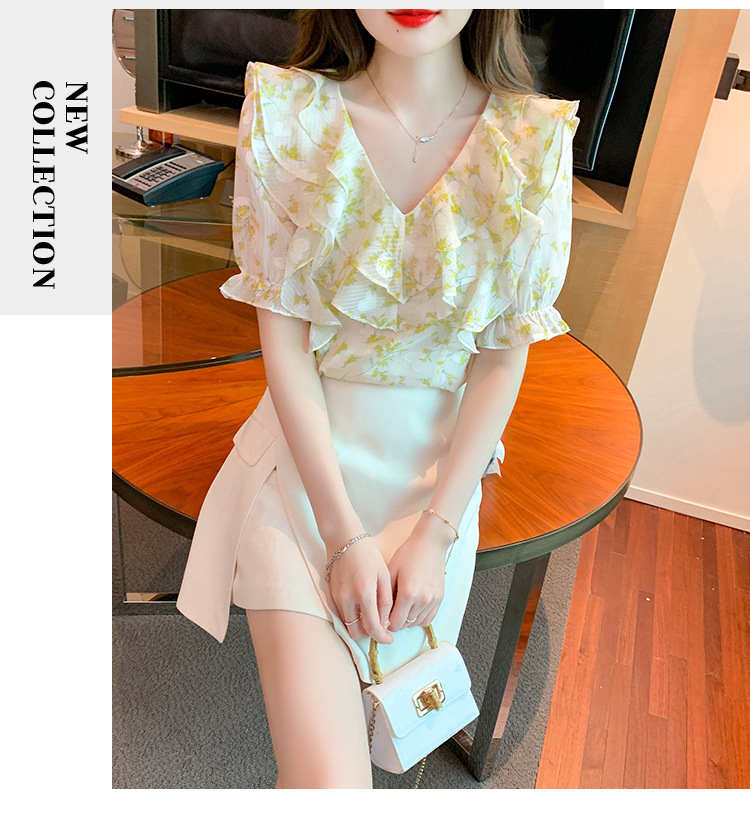 여성을위한 V 넥 쉬폰 셔츠 2025 여름 새로운 패션 달콤한 프릴 꽃 탑 반팔 유행 셔츠