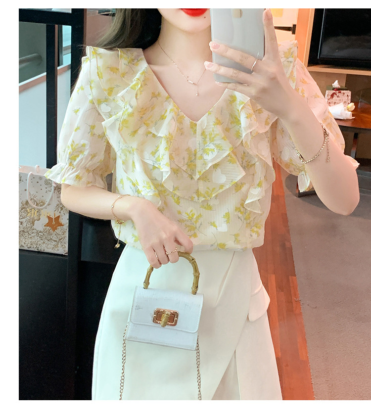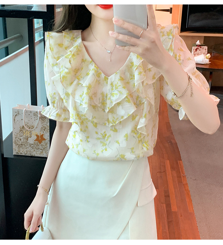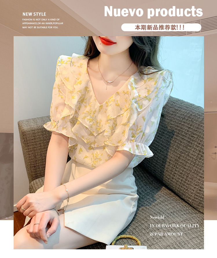 여성을위한 V 넥 쉬폰 셔츠 2025 여름 새로운 패션 달콤한 프릴 꽃 탑 반팔 유행 셔츠스토어 가기