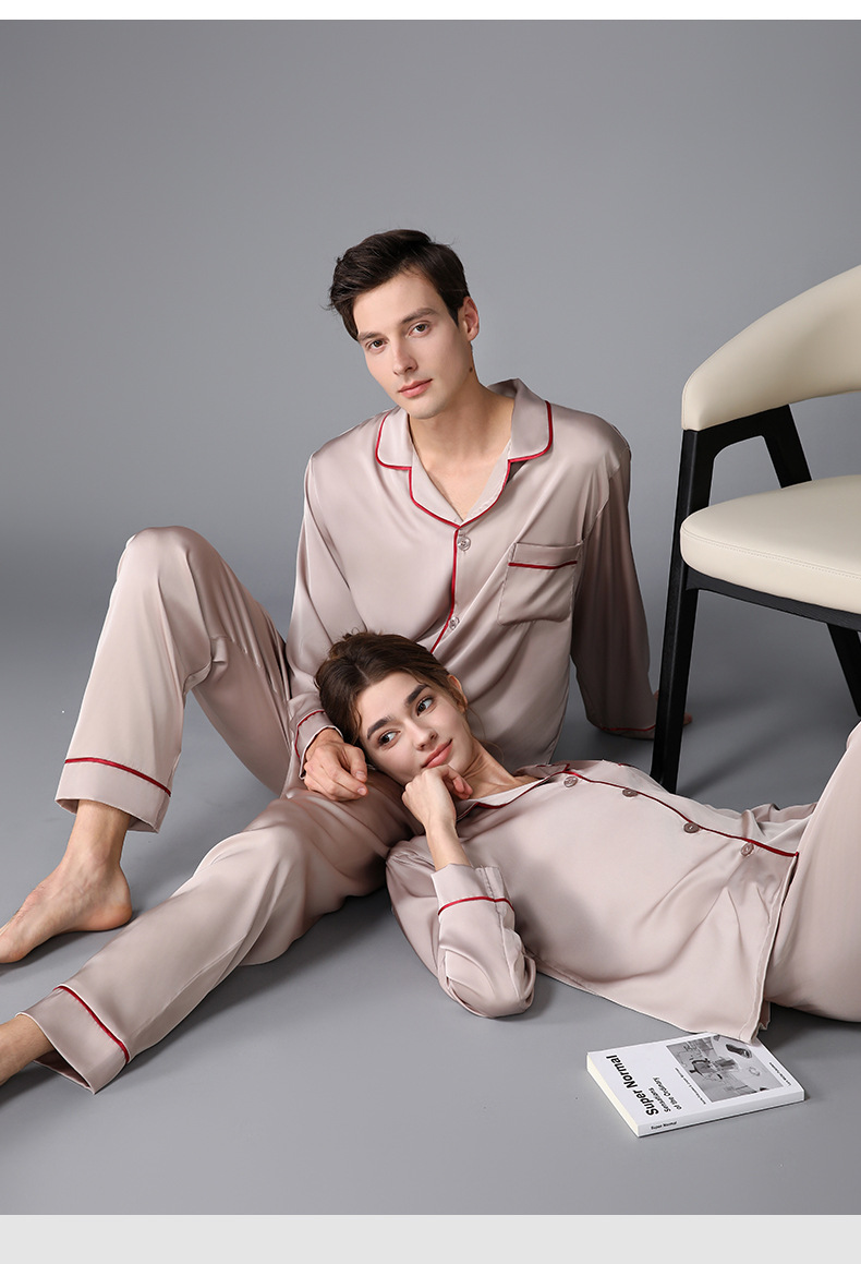 25년 새로운 커플 솔리드 컬러 하이 엔드 긴팔 바지 실크 잠옷 아이스 실크 남성 플러스 사이즈 여성 홈웨어스토어 가기