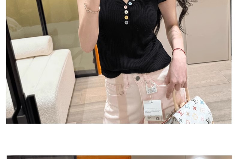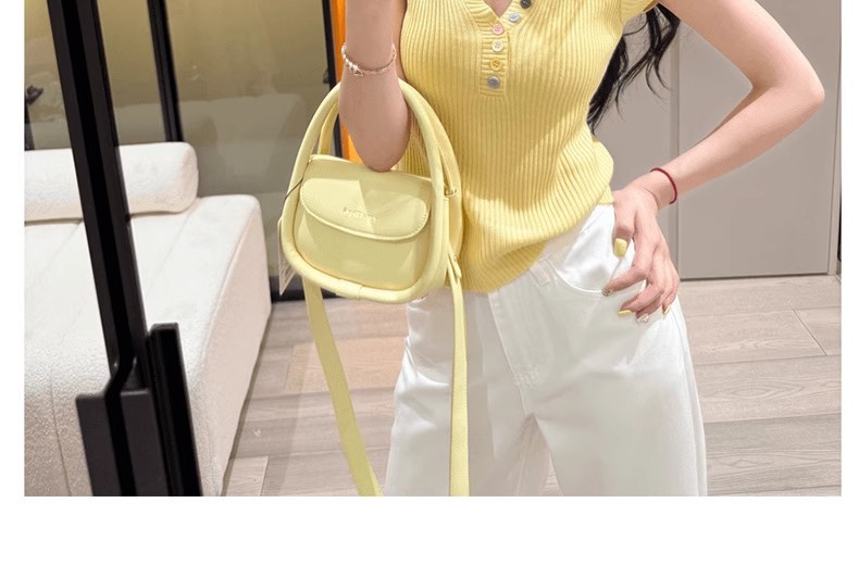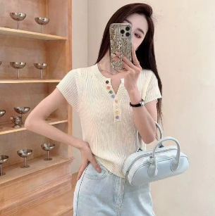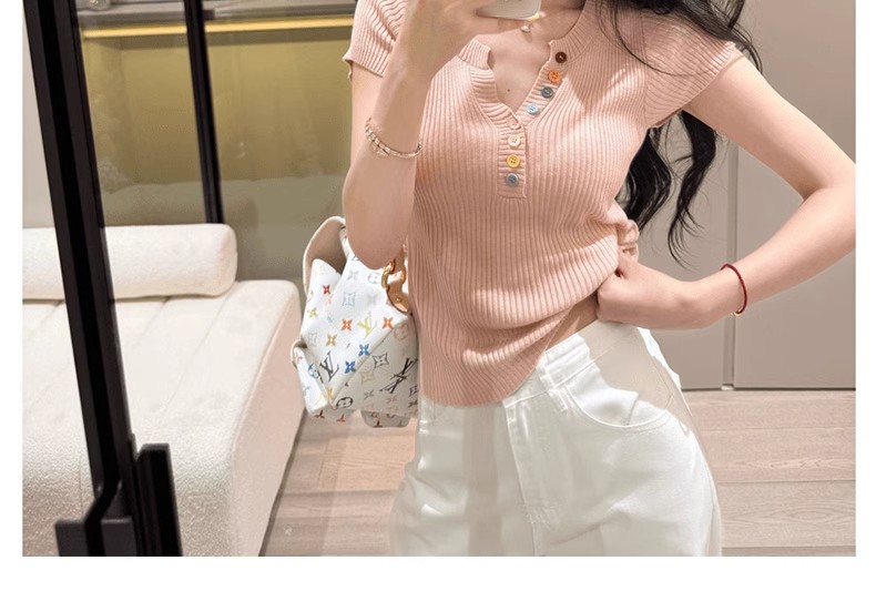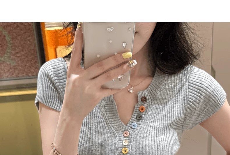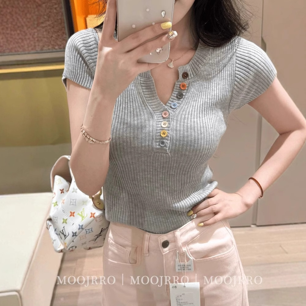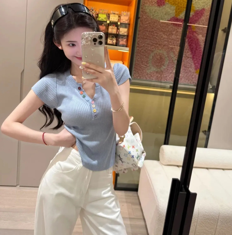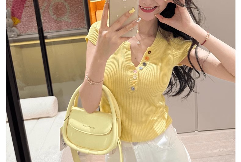 노란색 V 넥 반팔 스웨터 여성 여름 순수한 기질 순수한 허리 핀치 얇은 짧은 탑스토어 가기