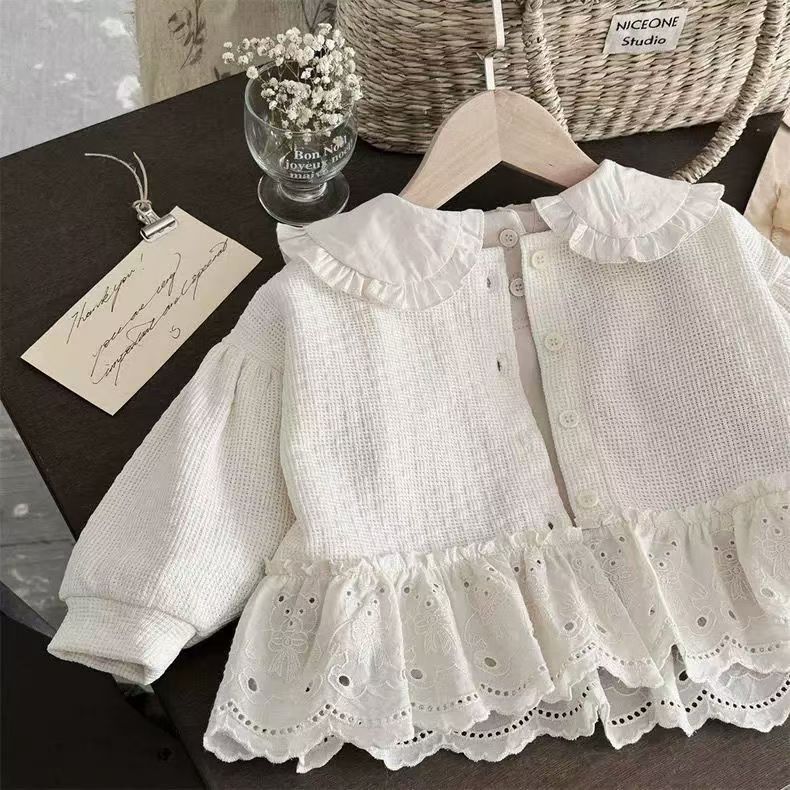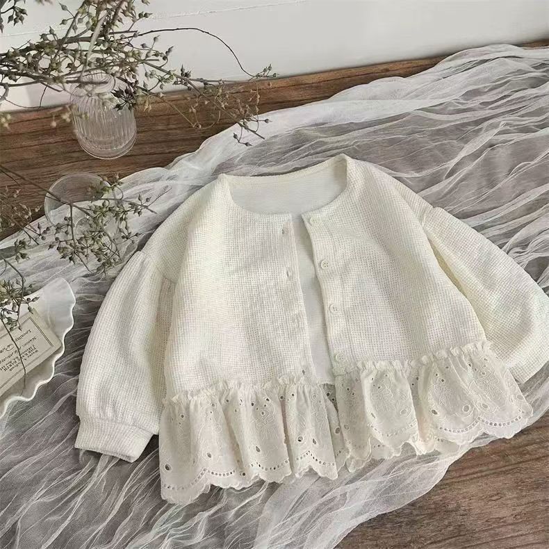 한국 스타일 여성의 보물 봄 코트 서양식 아기의 작은 광장 버블 긴 소매 카디건 소녀의 공주 바느질 탑스토어 가기