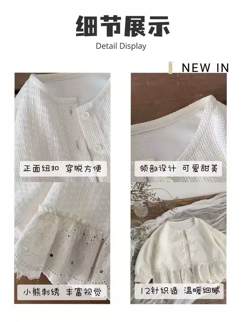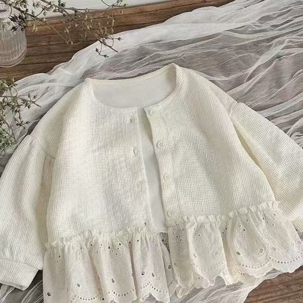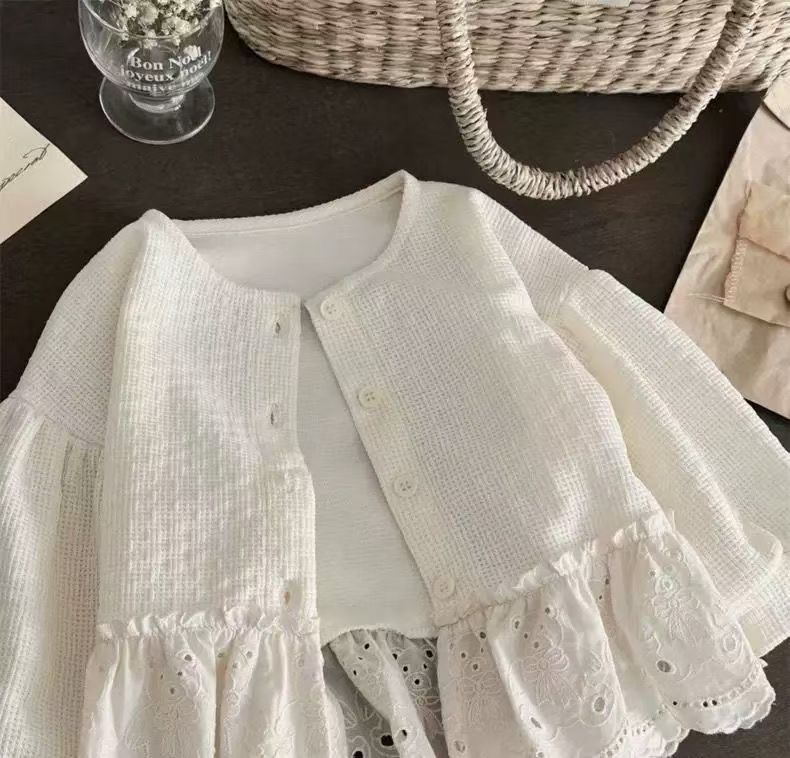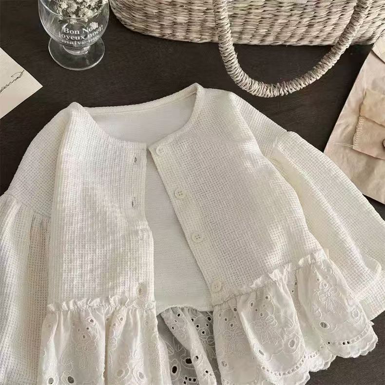 한국 스타일 여성의 보물 봄 코트 서양식 아기의 작은 광장 버블 긴 소매 카디건 소녀의 공주 바느질 탑