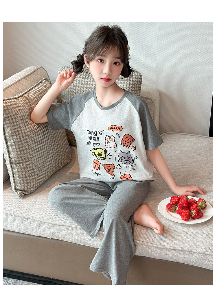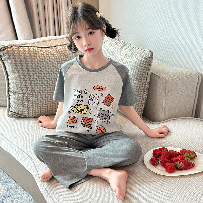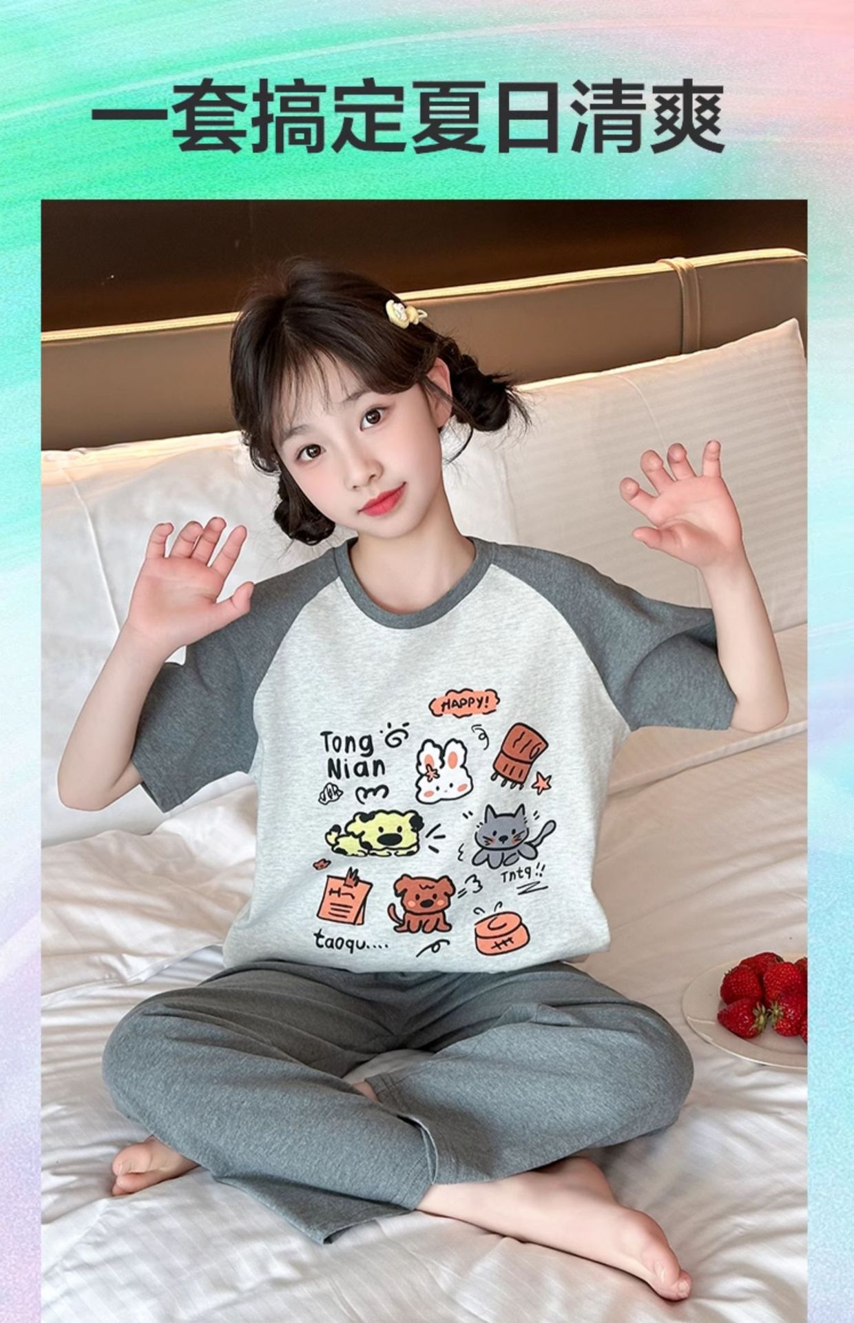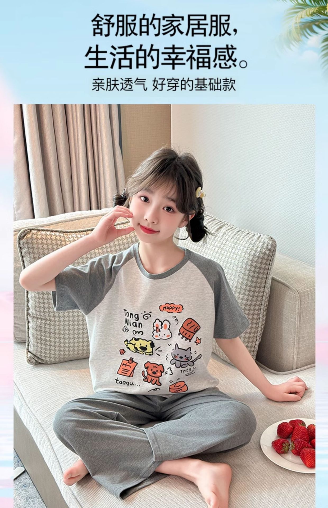 어린이 잠옷 소녀 여름 2025 새로운 스타일 소녀 순면 반팔 양복 인터넷 연예인 핫 스타일 얇은 가정 의류 여름스토어 가기