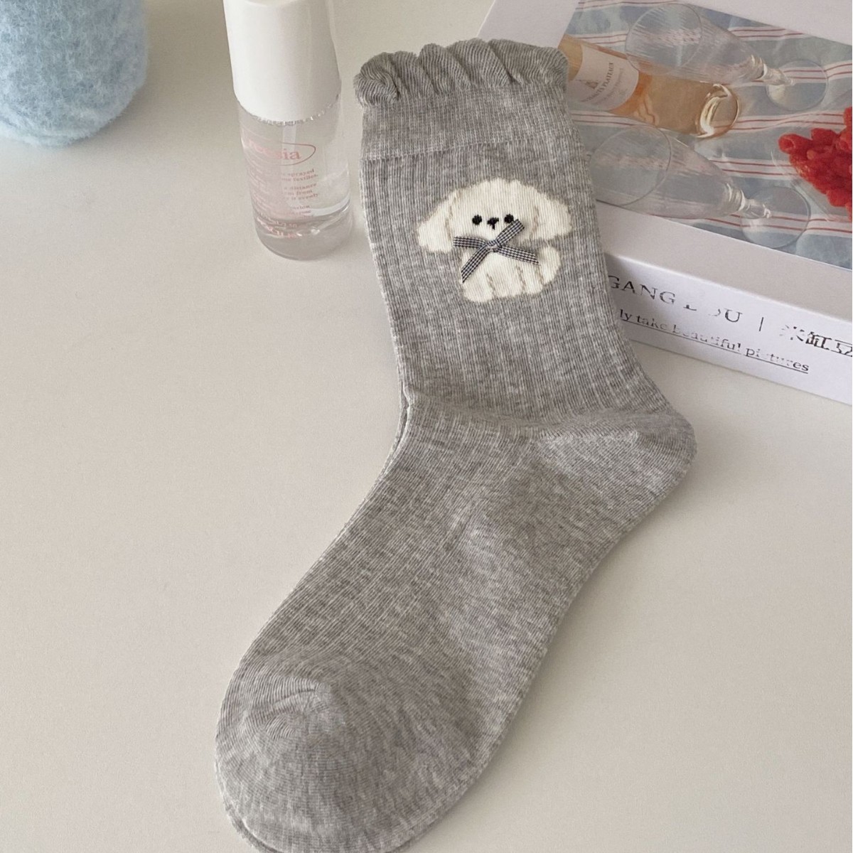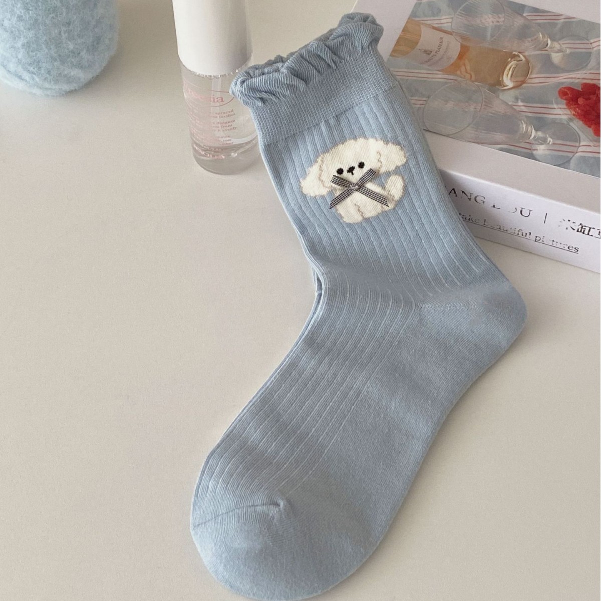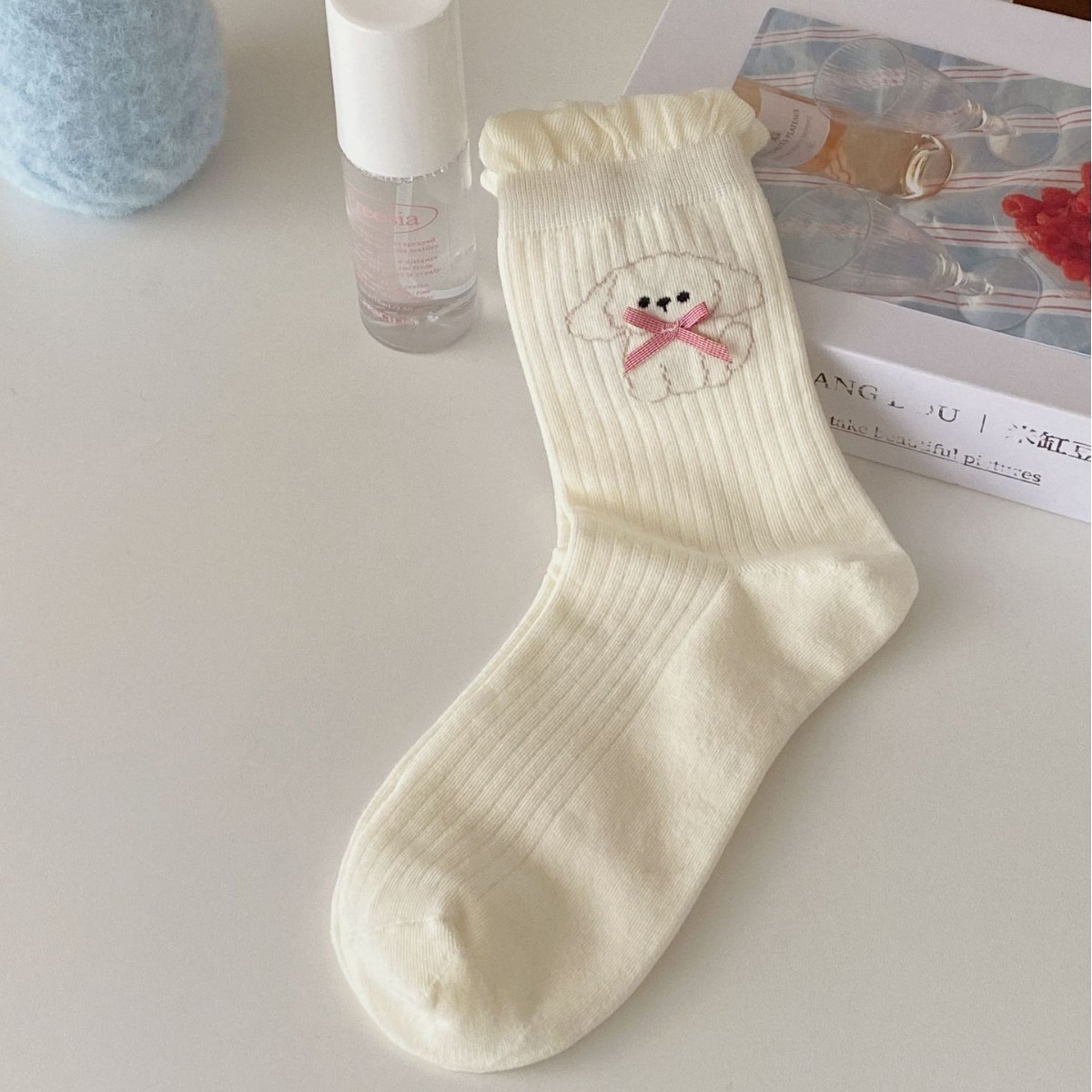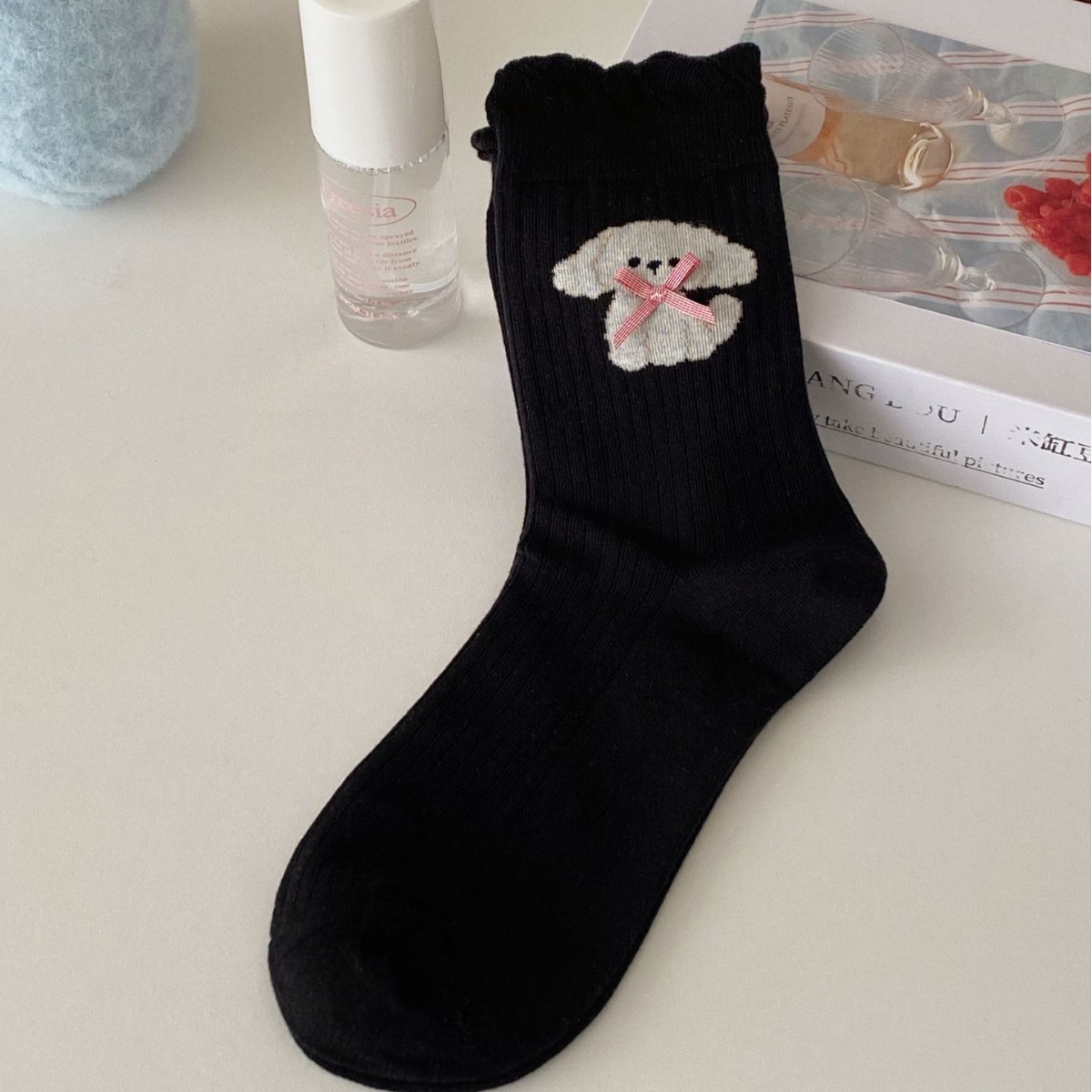 강아지 Bowknot 양말 여성 미드 튜브 양말 봄과 여름 얇은 버블 입 레이스 인 한국식 일본식 귀여운 코튼 양말
