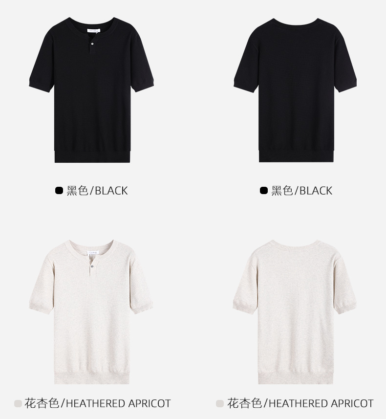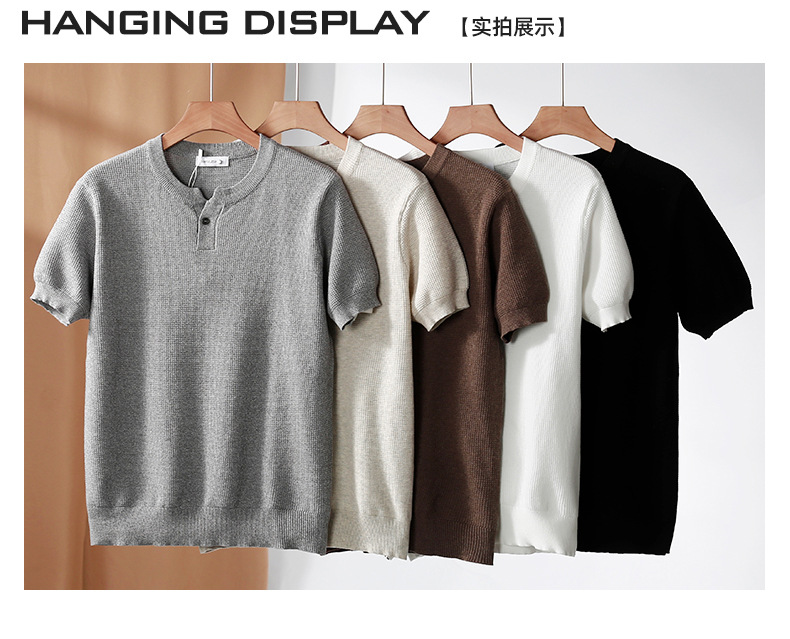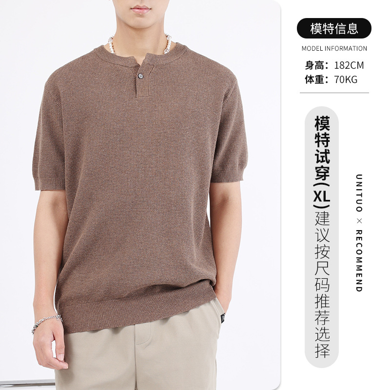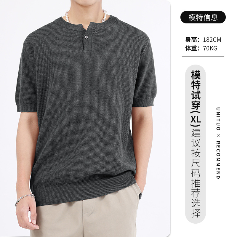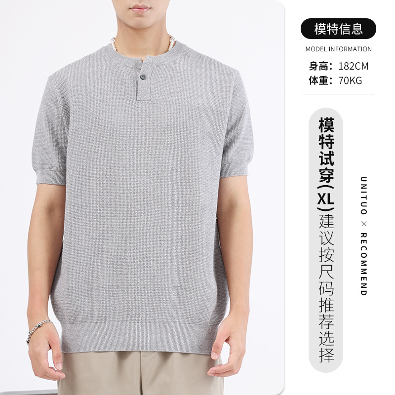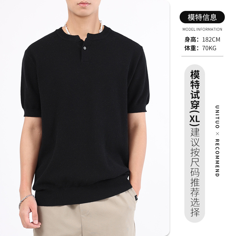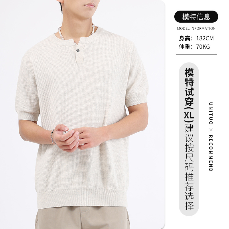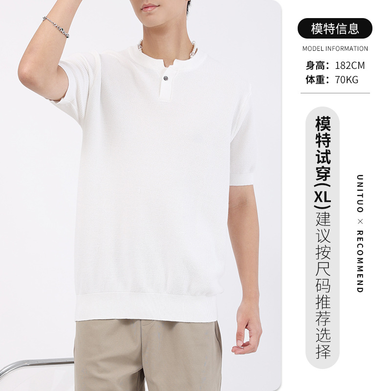 헨리 칼라 니트 아이스 실크 반팔 남성용 트렌디 하이 엔드 센스 티셔츠베이스 셔츠 라이트 럭셔리 남성복 티셔츠 남성용