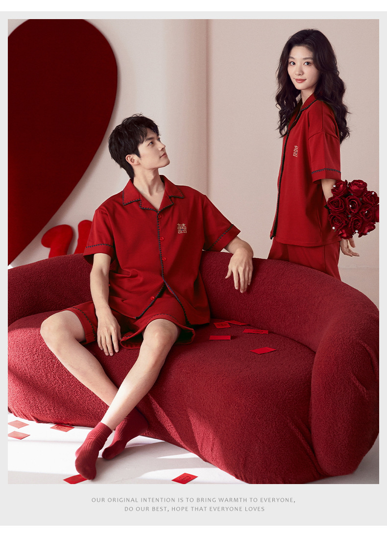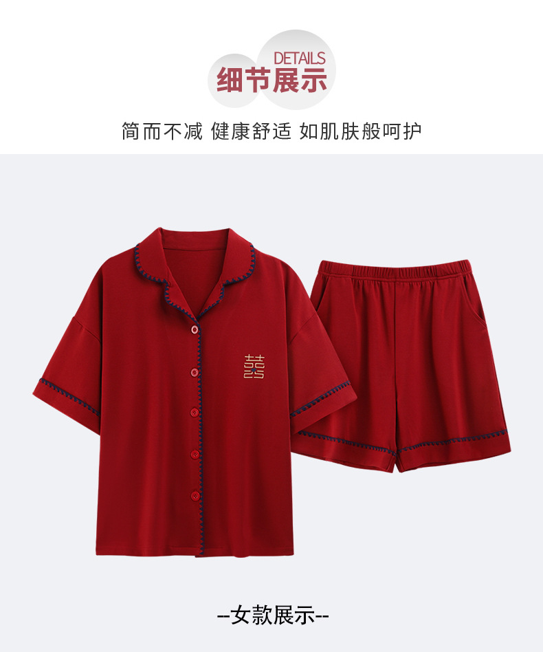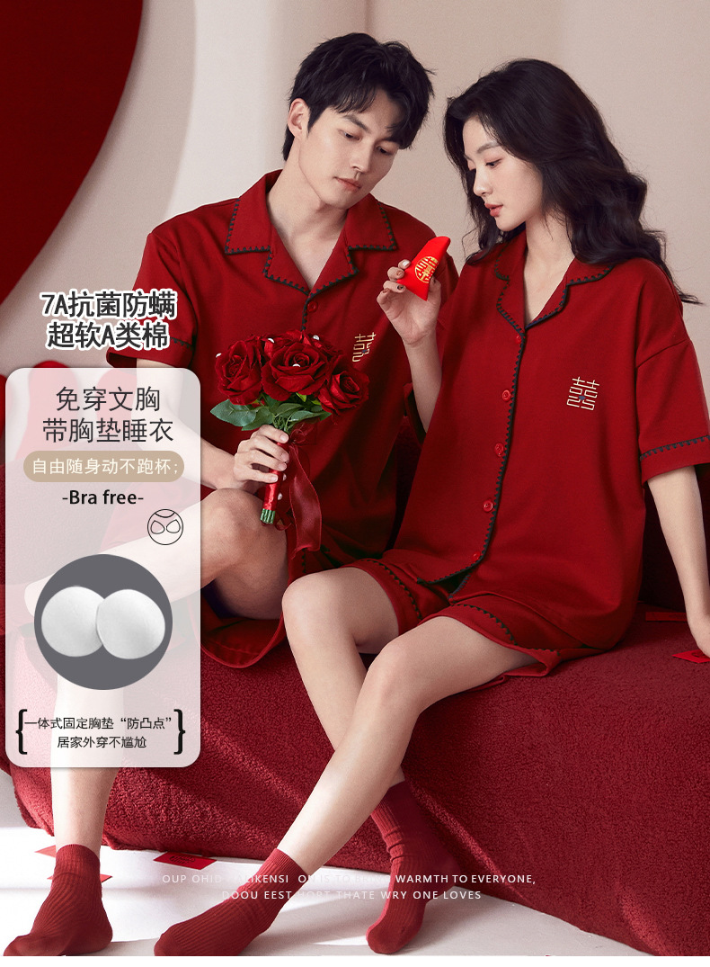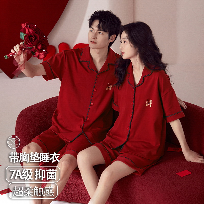 [7A 박테리오스타] 웨딩 커플 파자마 여성 여름 가슴 패드 붉은 세트 남성 웨딩 홈 의류 순면