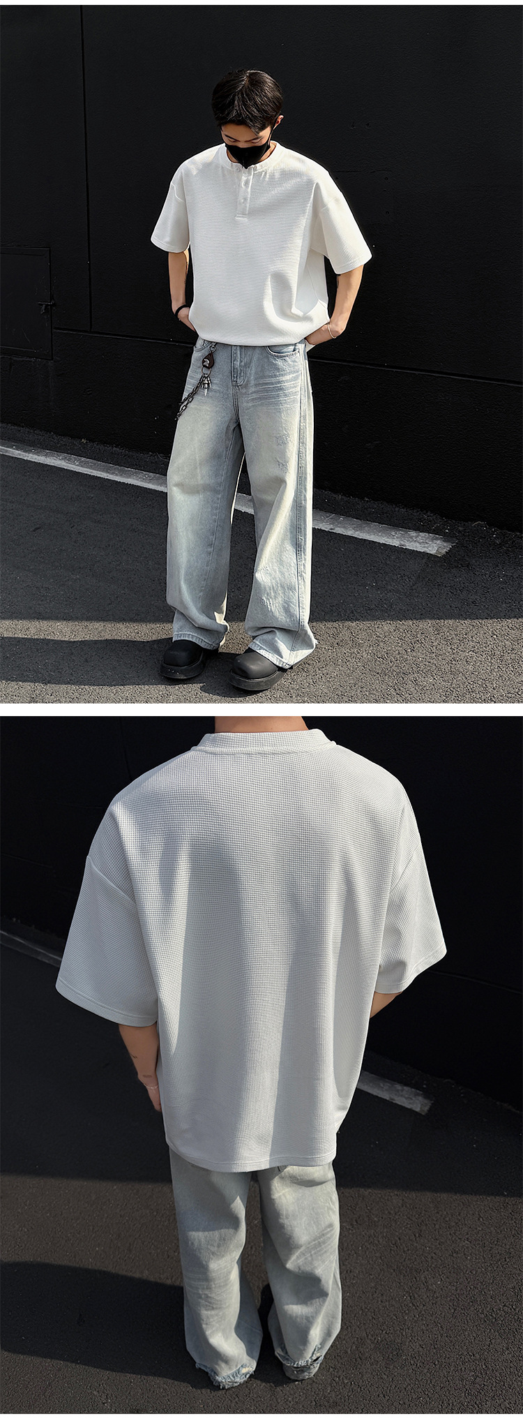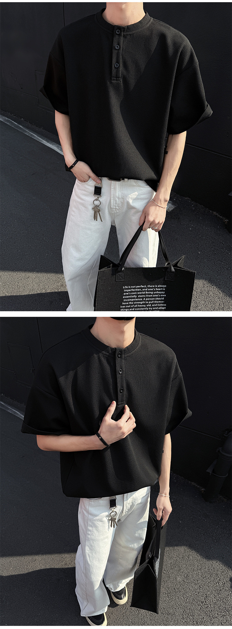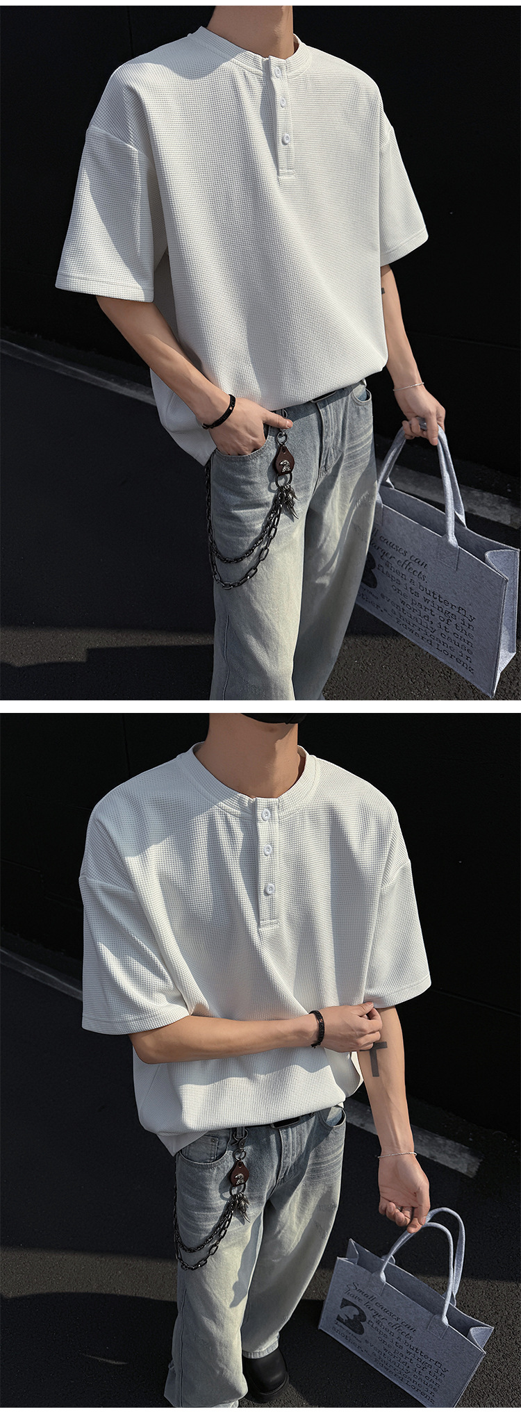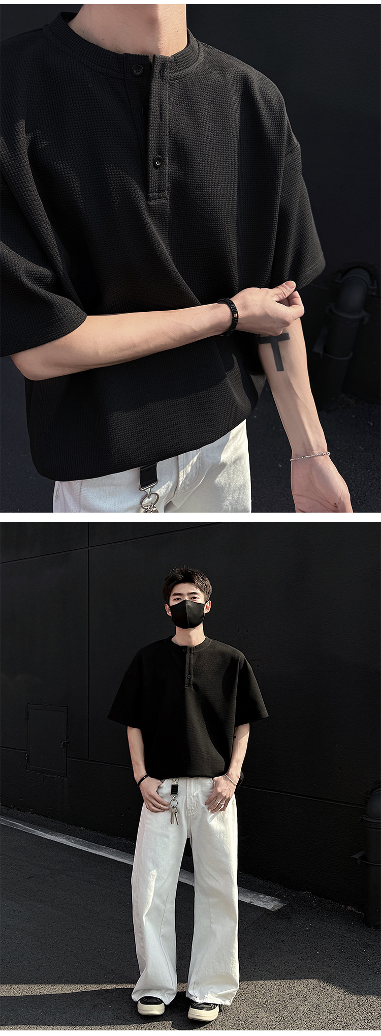 와플 반 지퍼 티셔츠 남자의 반소매 여름 유행과 잘 생긴 남자의 여름 미국 헨리 셔츠 반소매 티셔츠스토어 가기