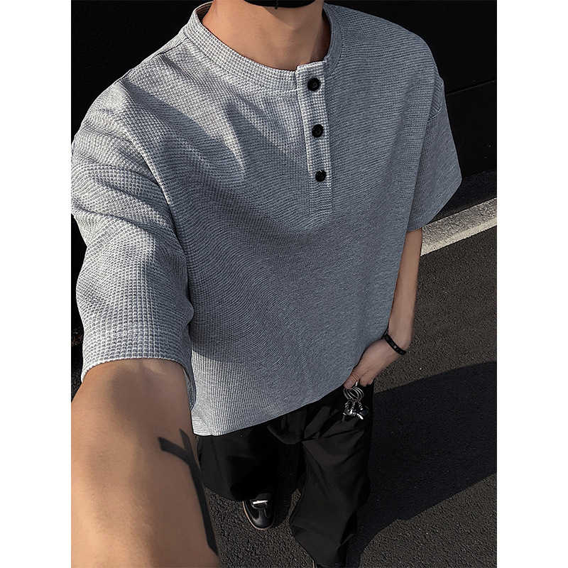 와플 반 지퍼 티셔츠 남자의 반소매 여름 유행과 잘 생긴 남자의 여름 미국 헨리 셔츠 반소매 티셔츠