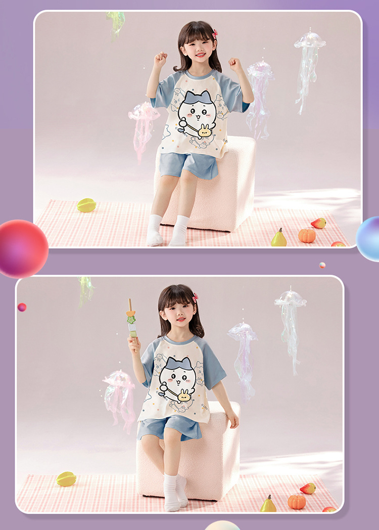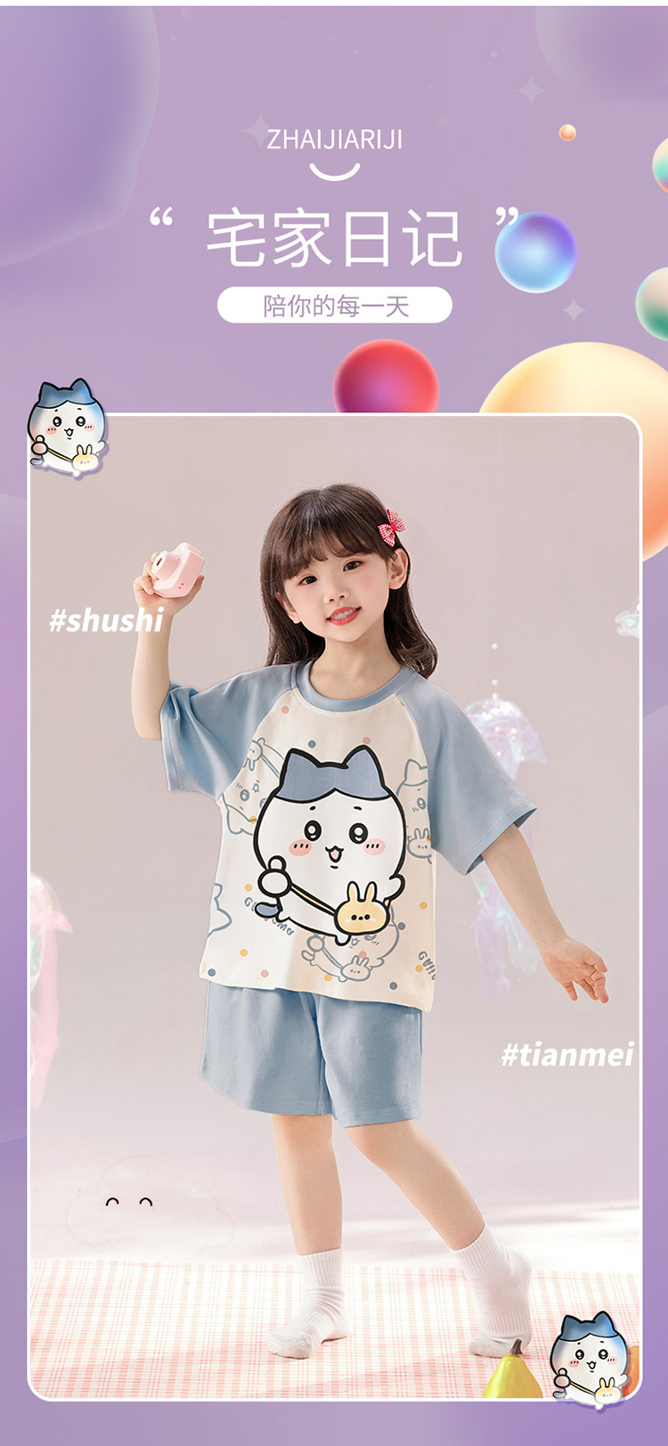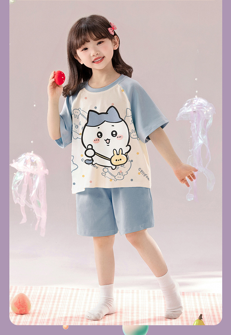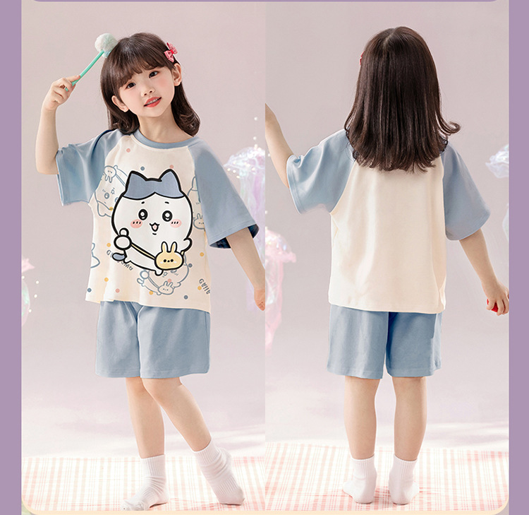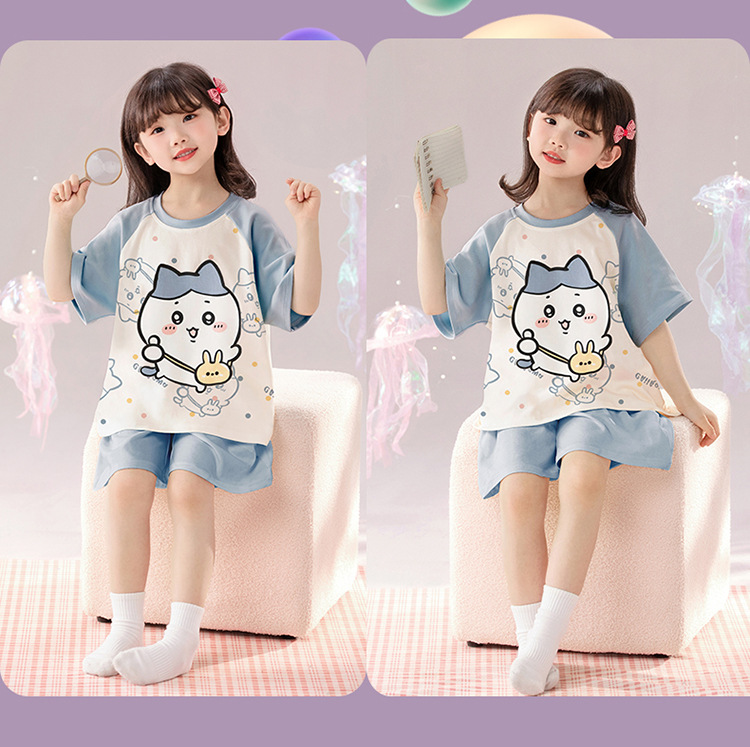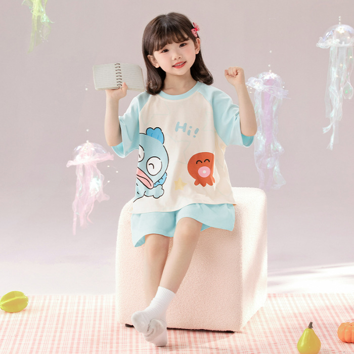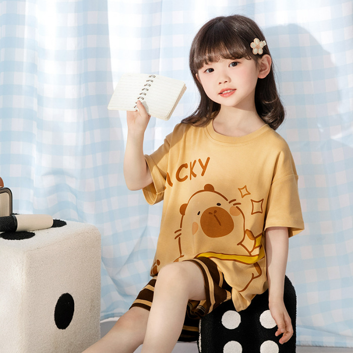귀여운 만화 순면 소녀 잠옷 한국 스타일 여름 둥근 목 짧은 소매 반바지 큰 소년 소녀 홈 의류 세트