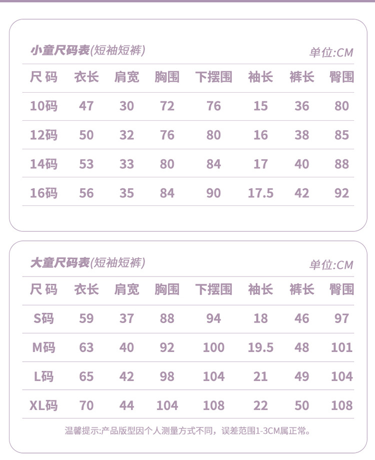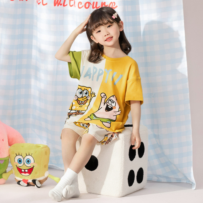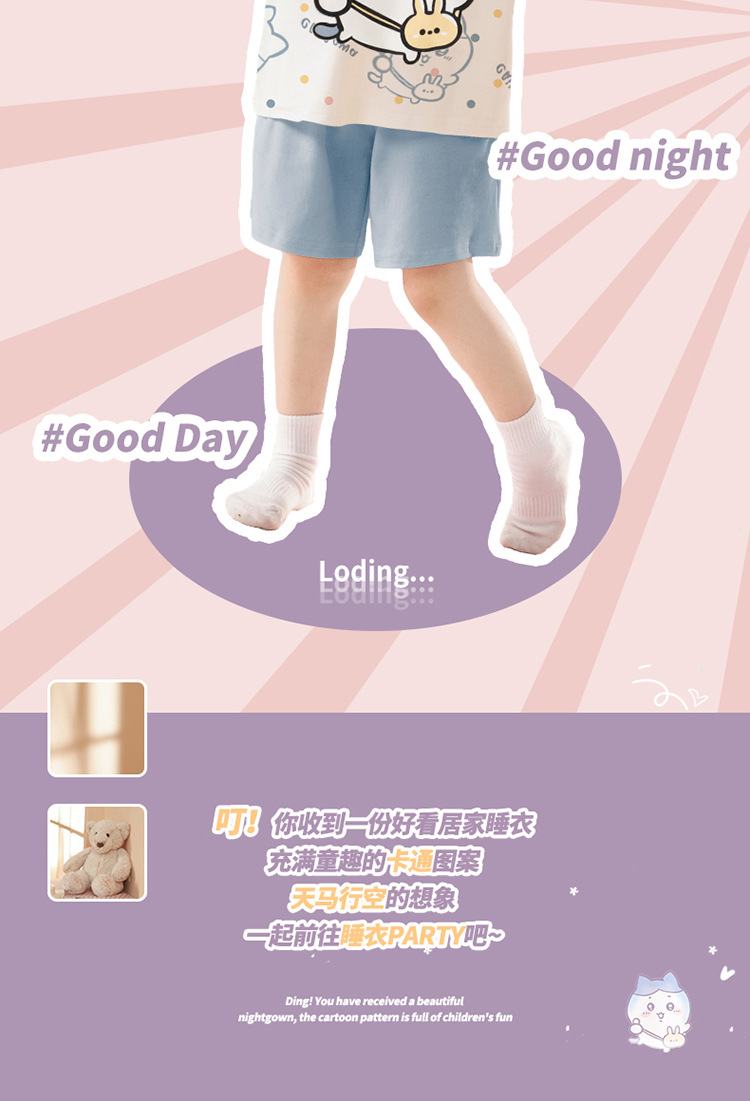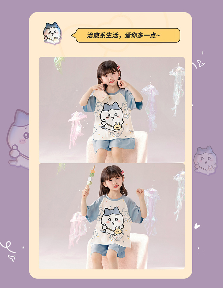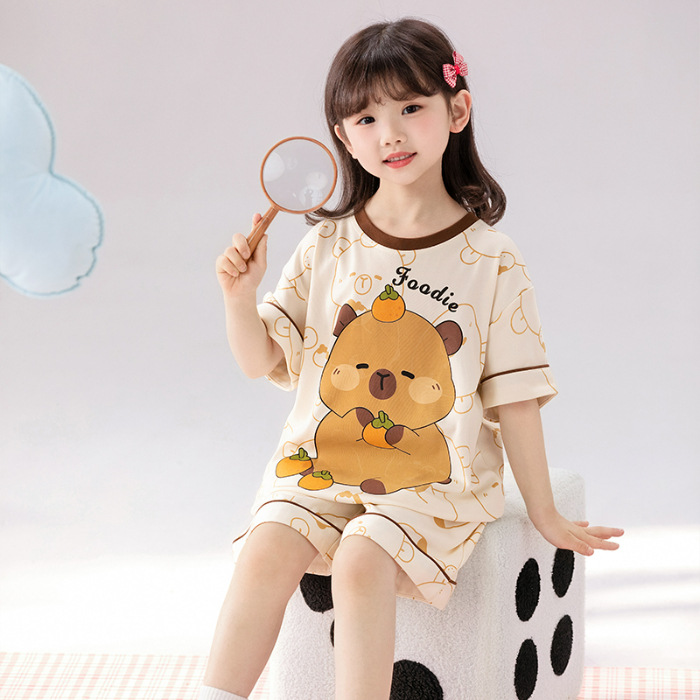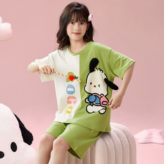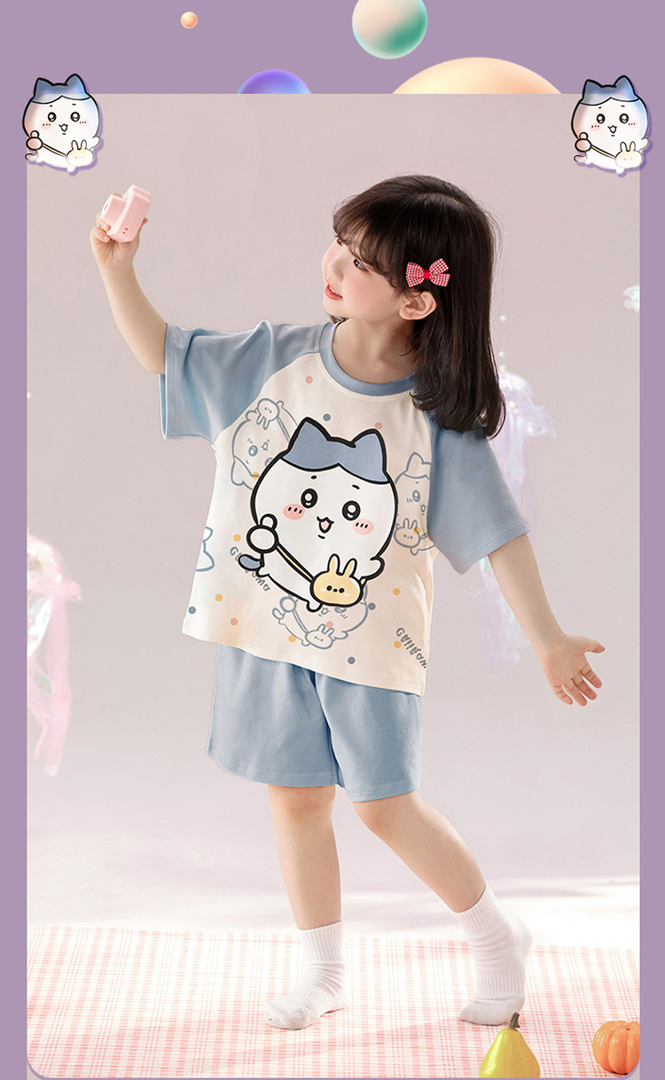 귀여운 만화 순면 소녀 잠옷 한국 스타일 여름 둥근 목 짧은 소매 반바지 큰 소년 소녀 홈 의류 세트