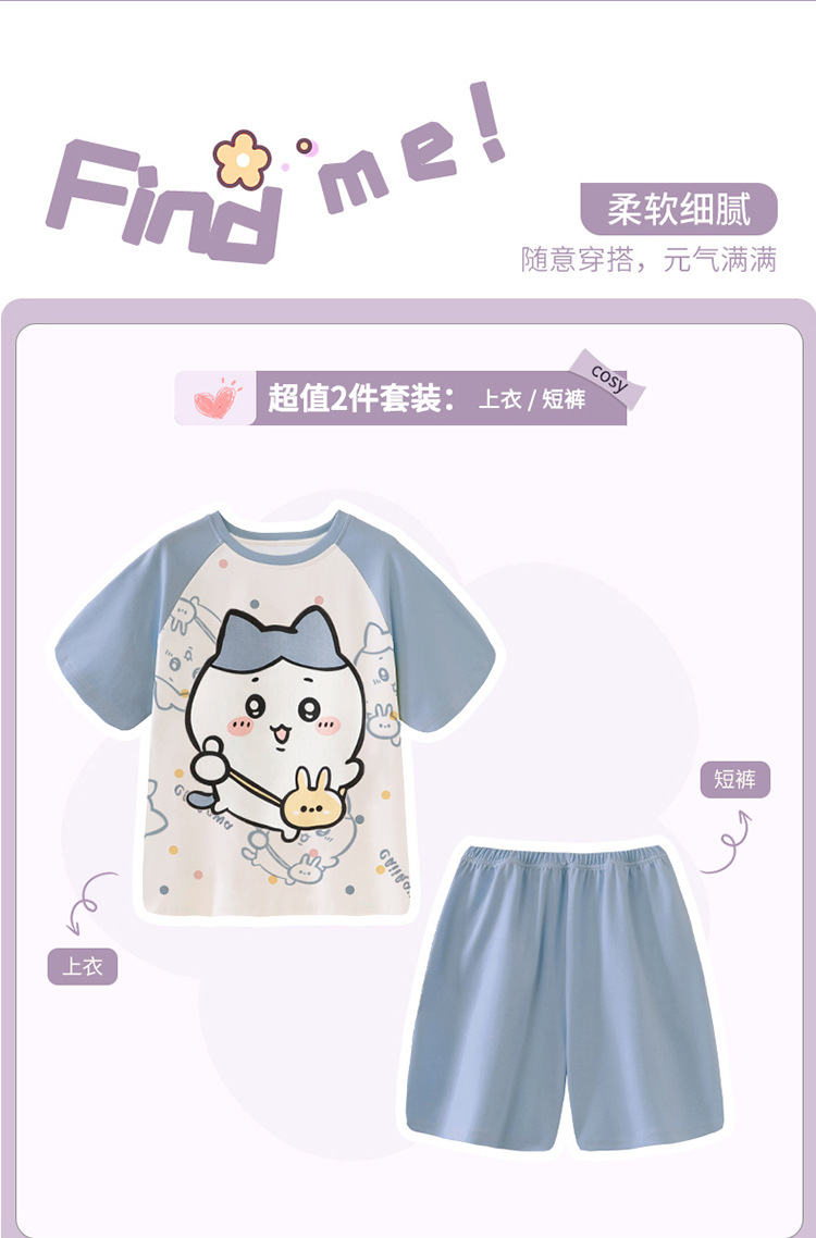 귀여운 만화 순면 소녀 잠옷 한국 스타일 여름 둥근 목 짧은 소매 반바지 큰 소년 소녀 홈 의류 세트스토어 가기