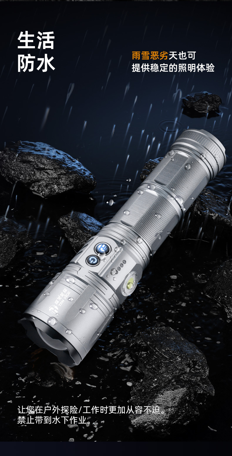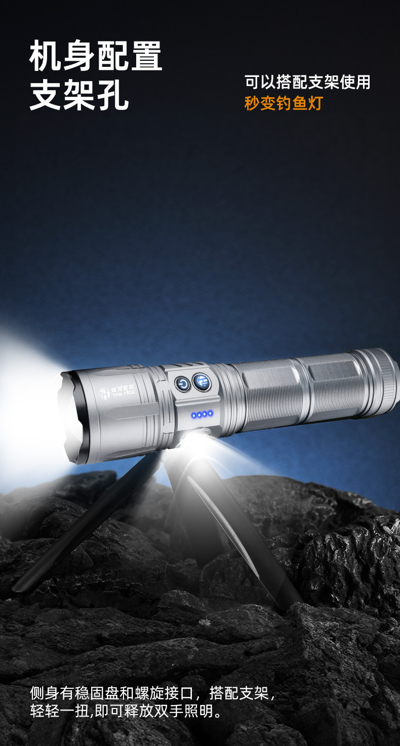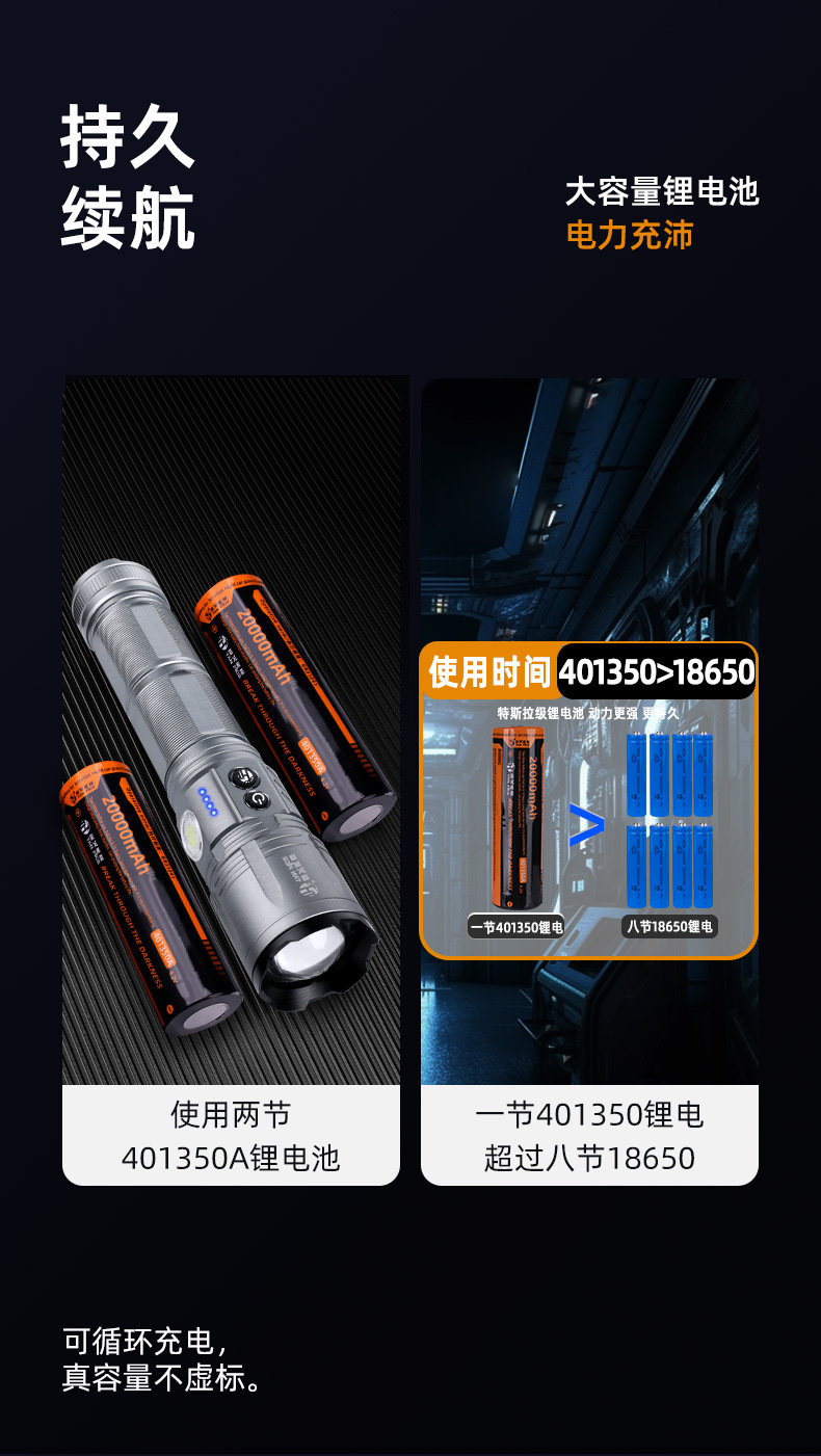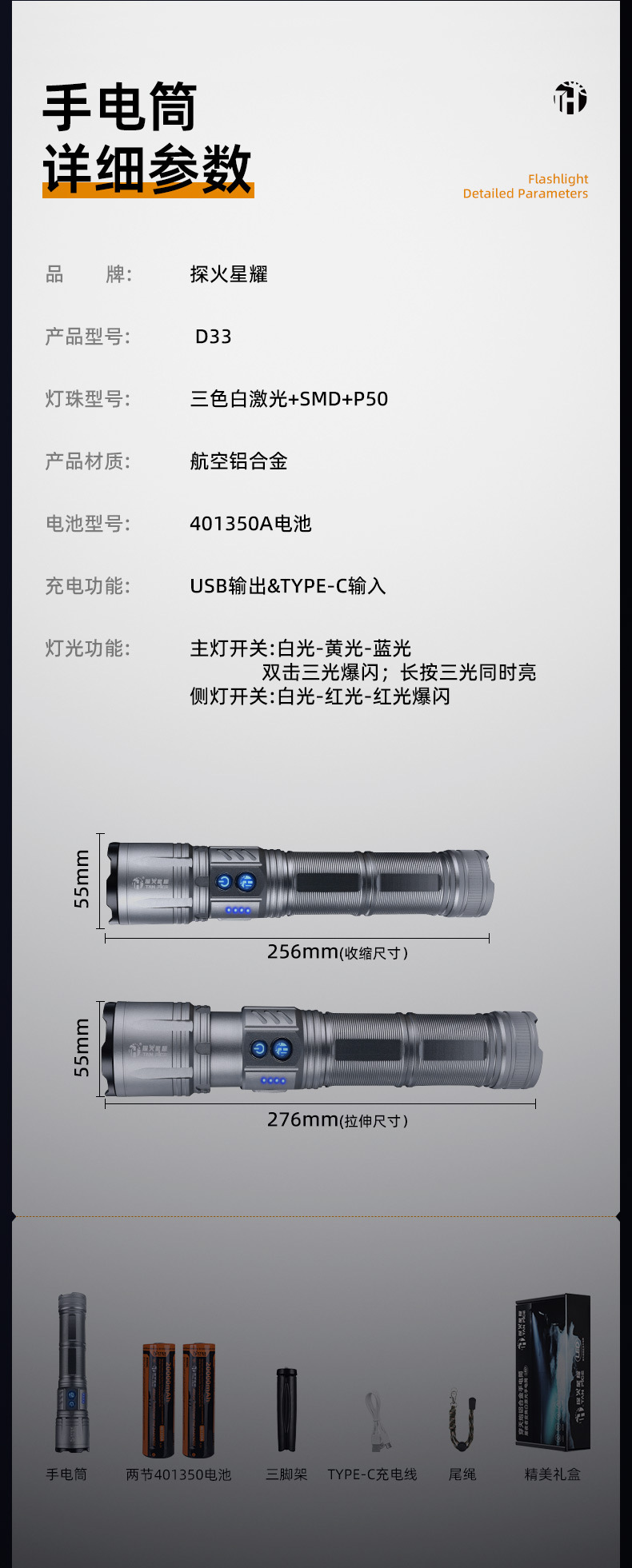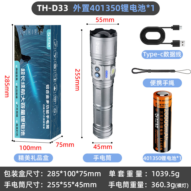 • D33 단일 손전등 + 두 섹션401350배터리 + 브래킷 + 테일 로프 + 충전 케이블