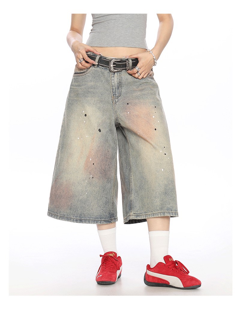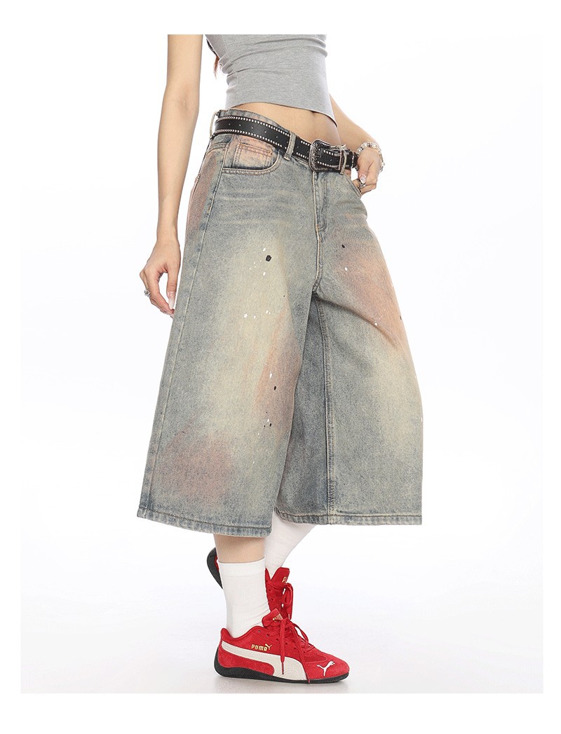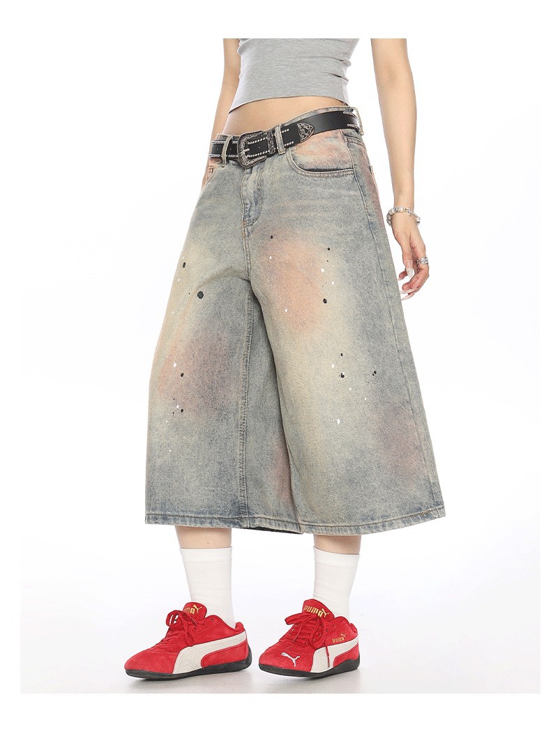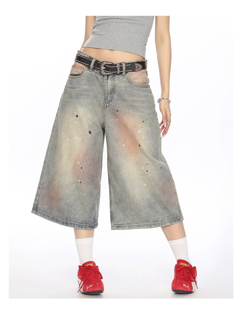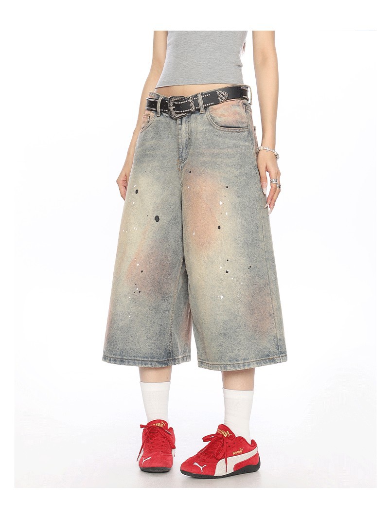 2025 여름 새로운 청바지 여성 미국 스타일 거리 더러운 염료 세탁 오래 된 디자인 느슨한 캐주얼 자른 유행 바지
