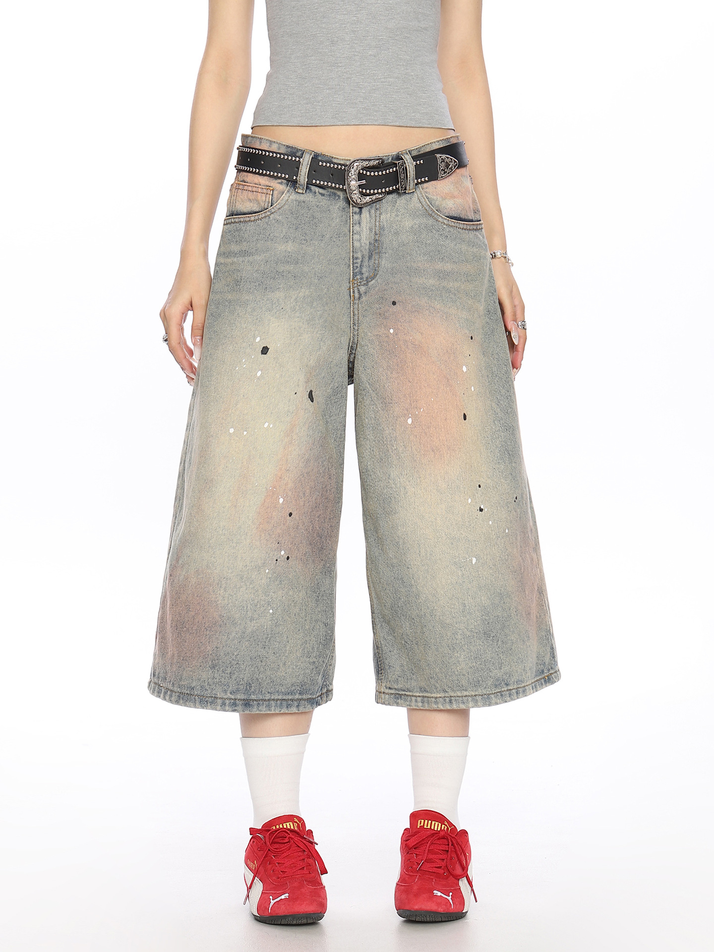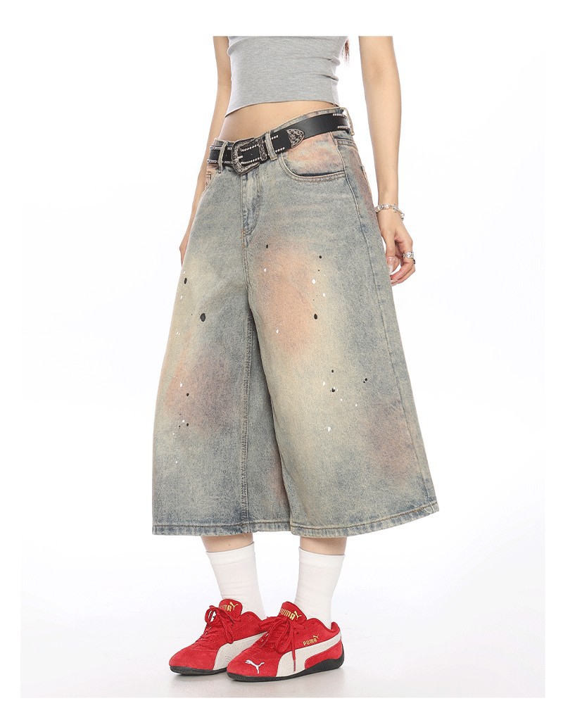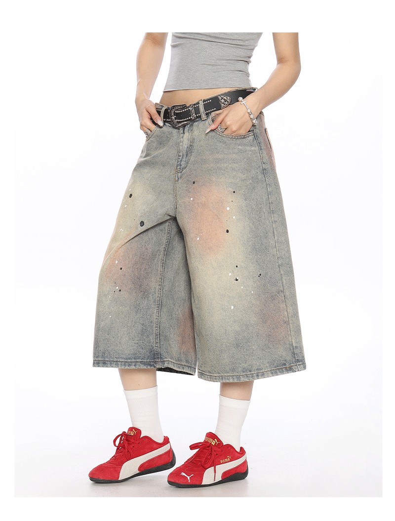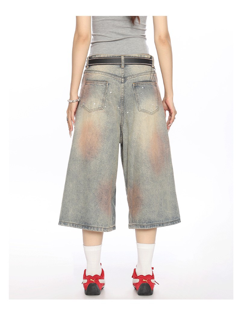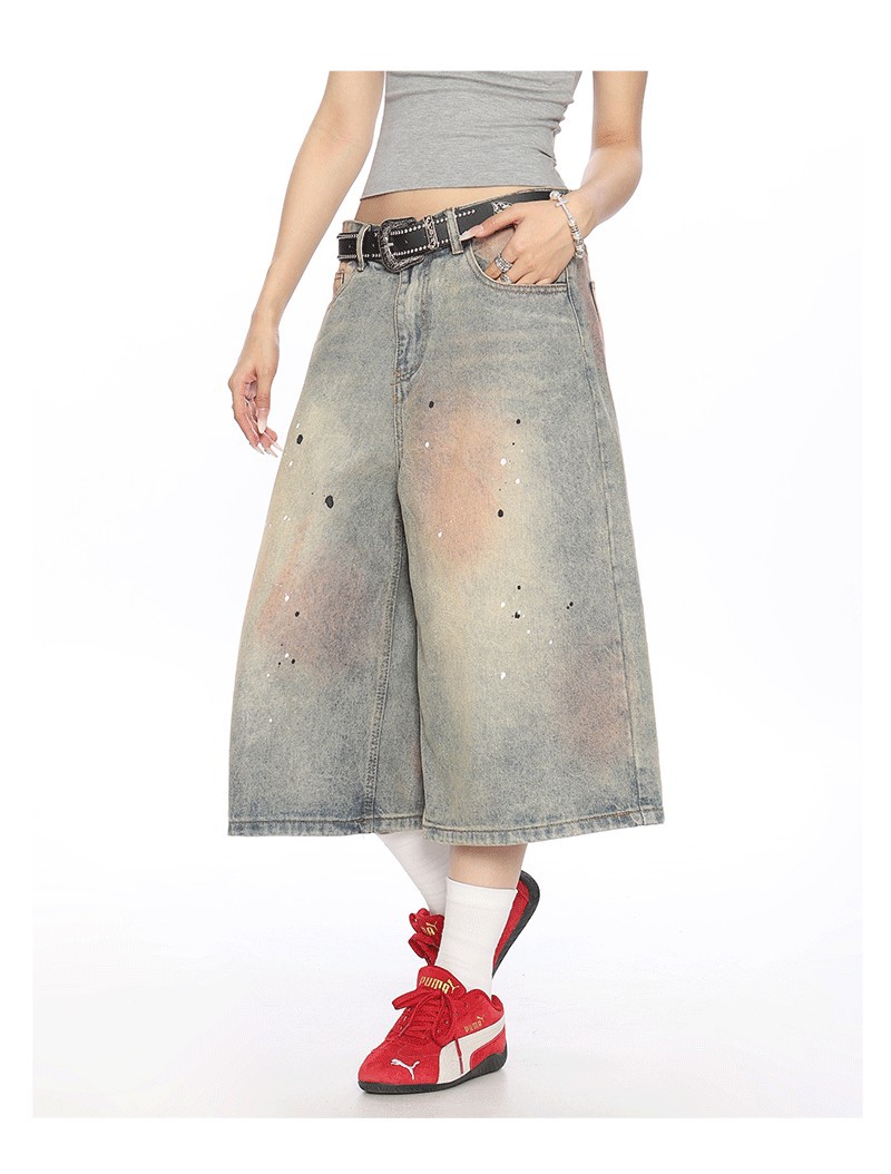 2025 여름 새로운 청바지 여성 미국 스타일 거리 더러운 염료 세탁 오래 된 디자인 느슨한 캐주얼 자른 유행 바지