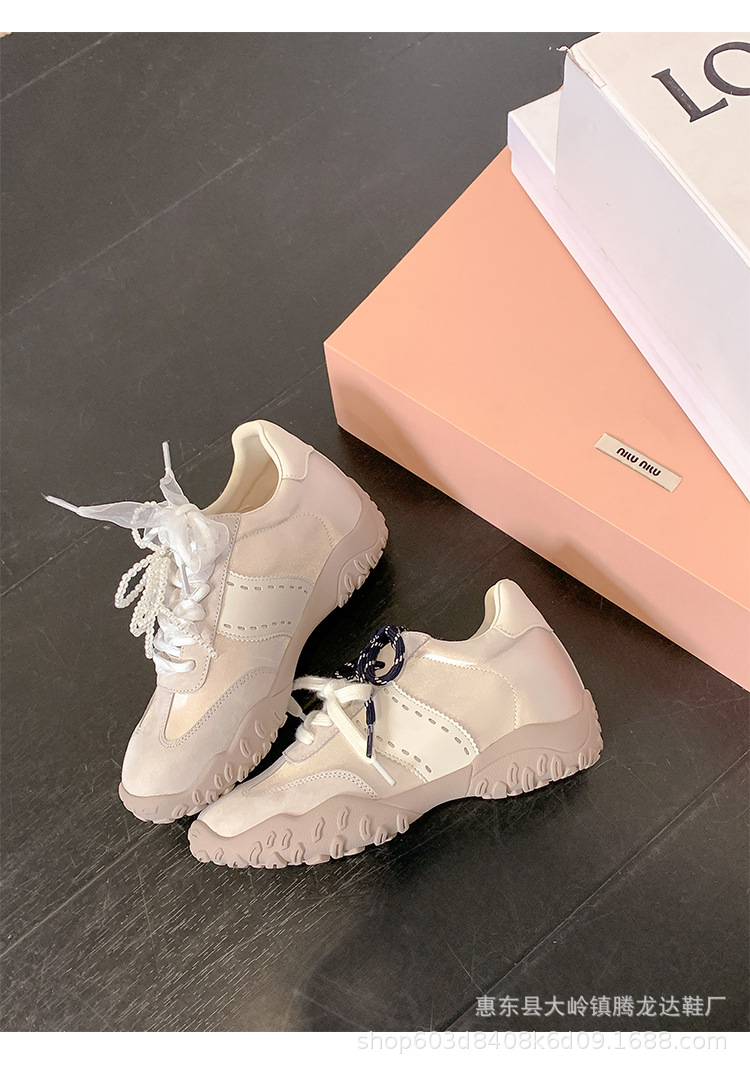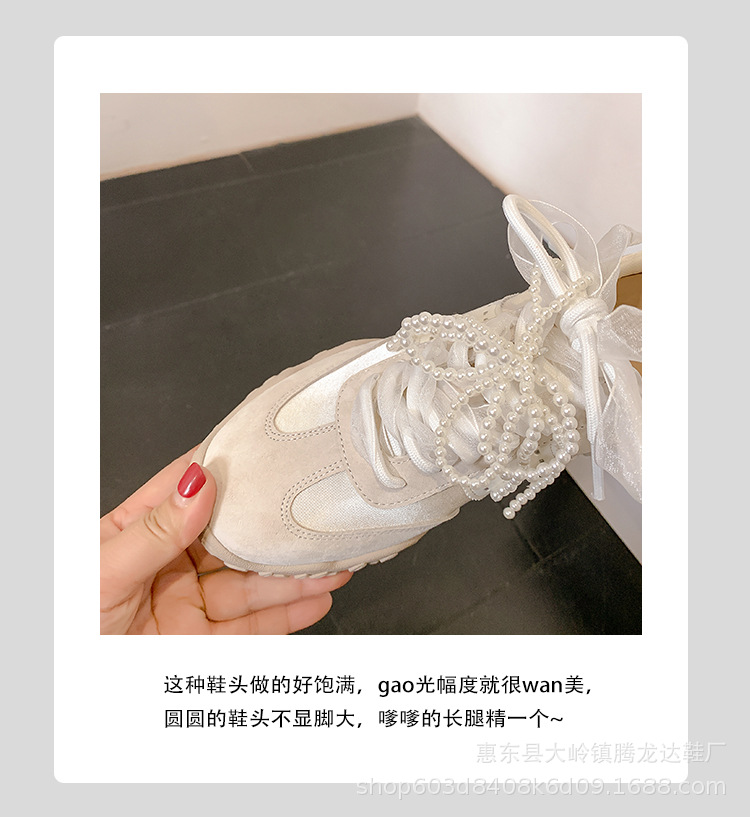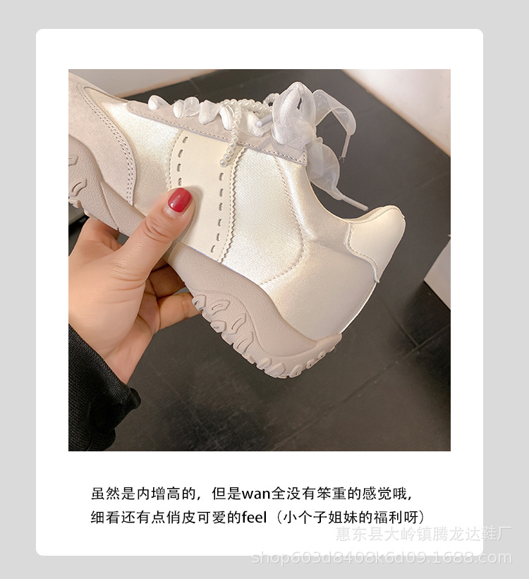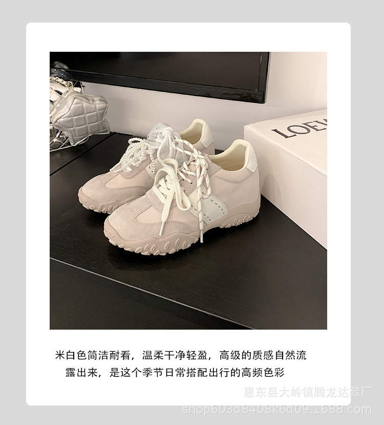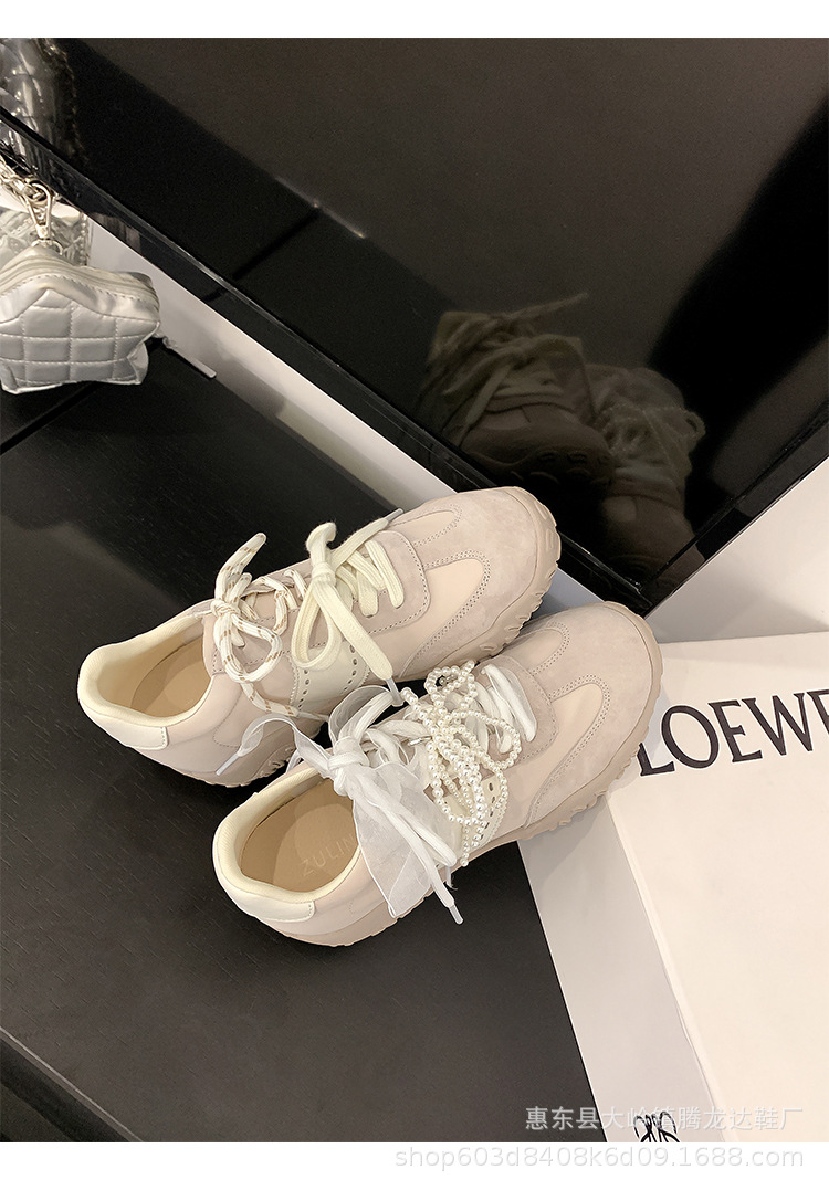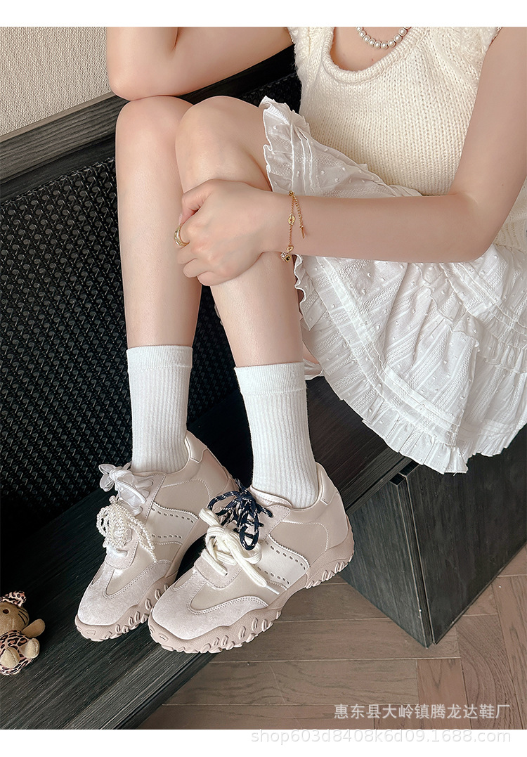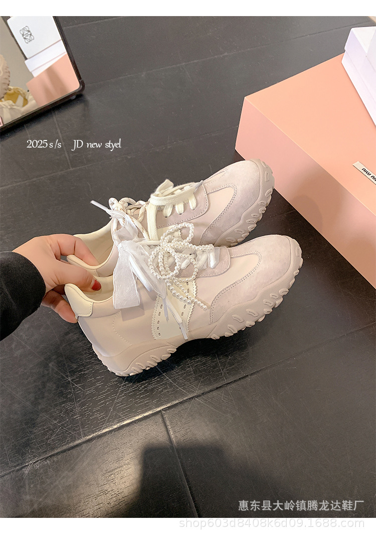 8cm 키높이 가죽 데트린 슈즈 여성용 2025 신상 진주 레이스 신발끈 스포츠 캐주얼 아가니 슈즈 여성용스토어 가기