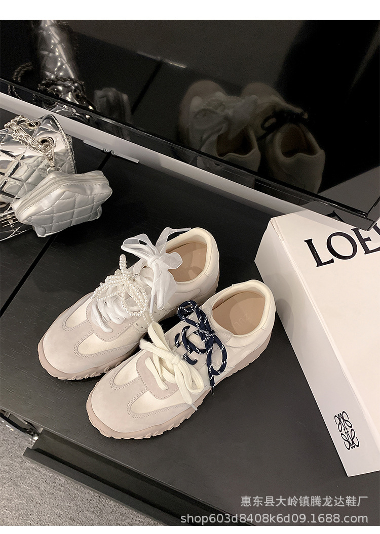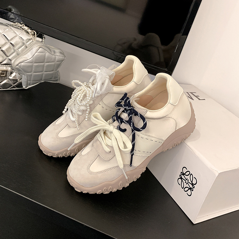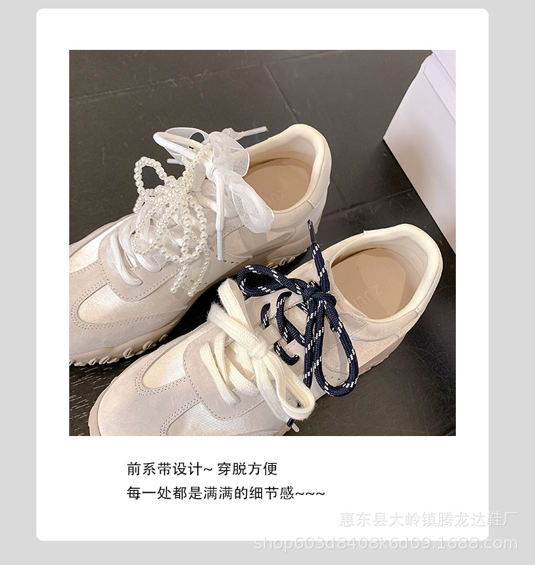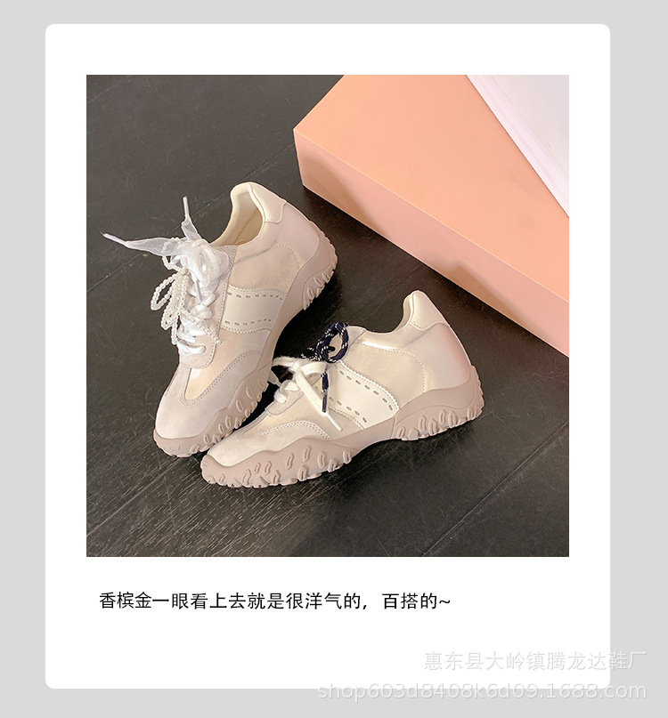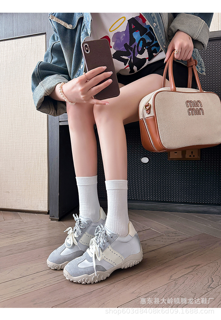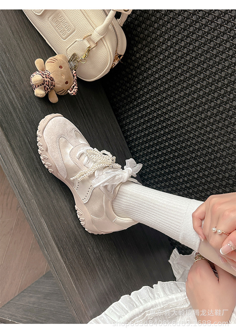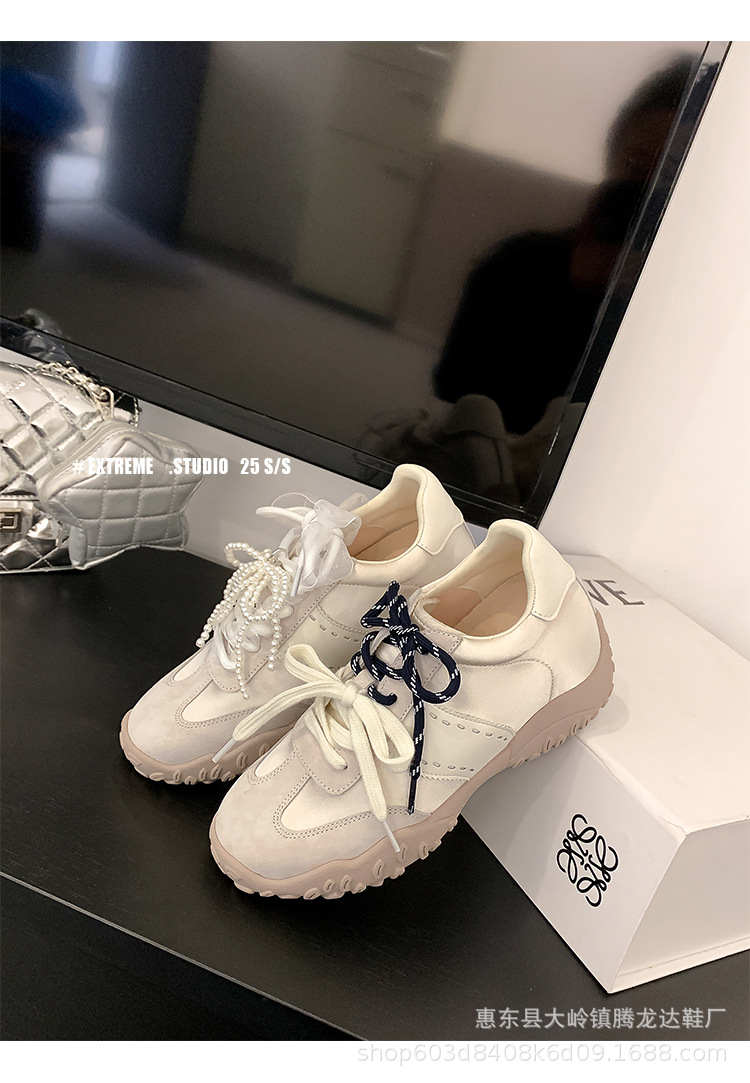 8cm 키높이 가죽 데트린 슈즈 여성용 2025 신상 진주 레이스 신발끈 스포츠 캐주얼 아가니 슈즈 여성용스토어 가기