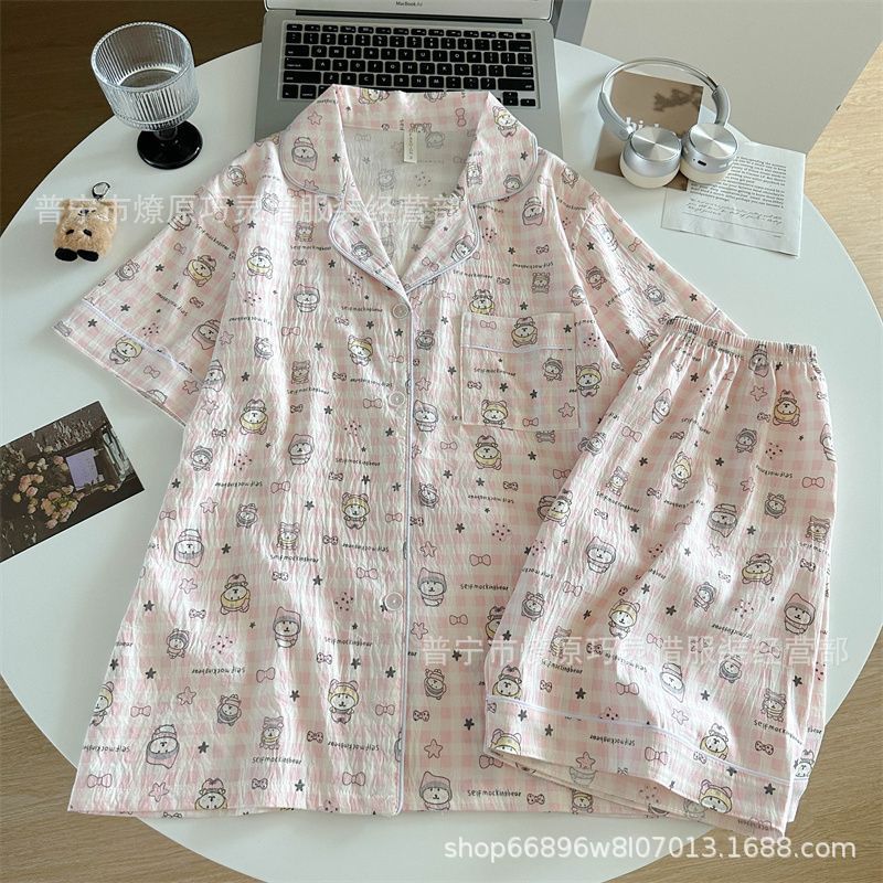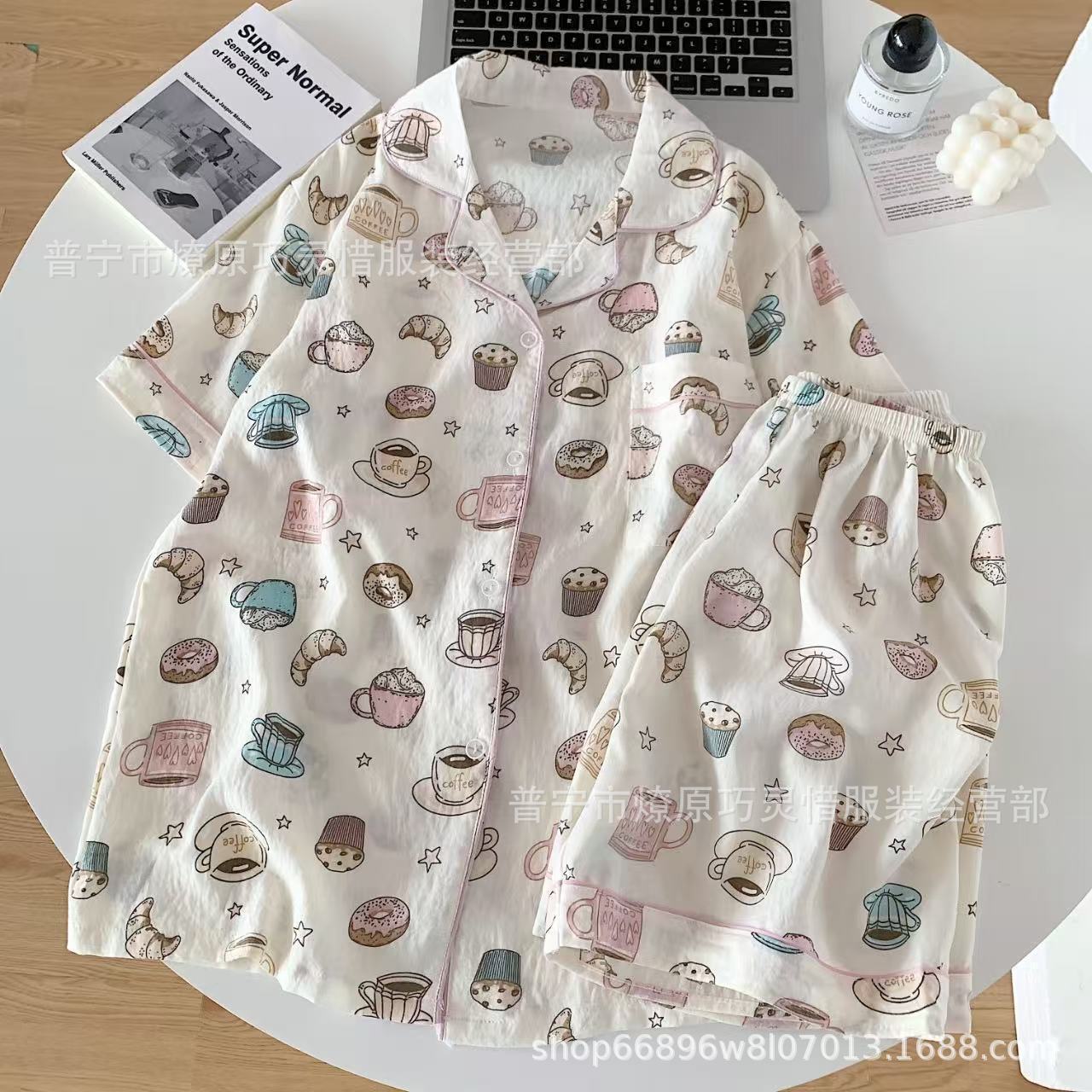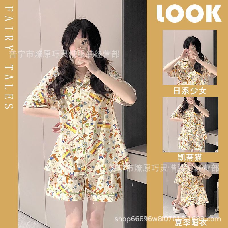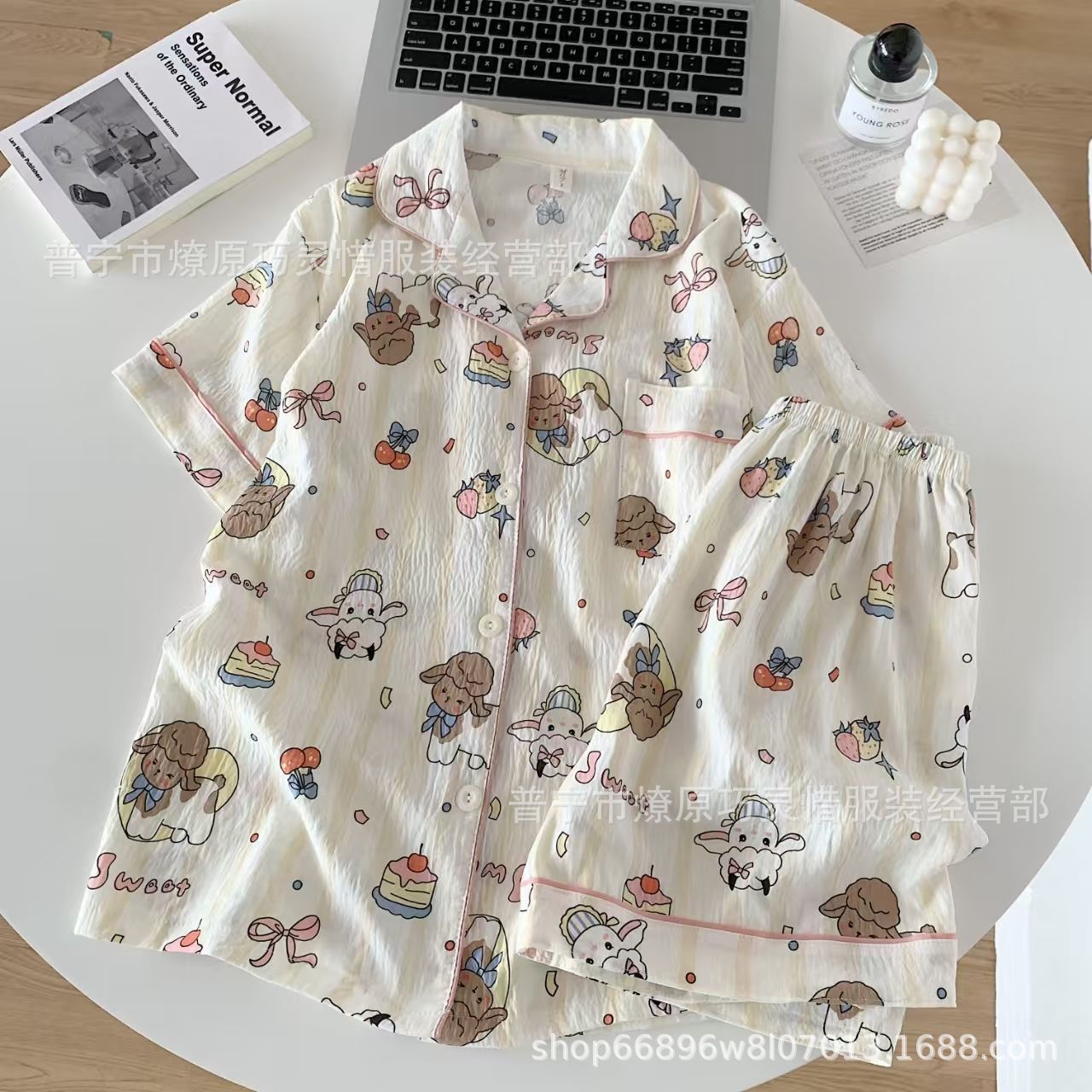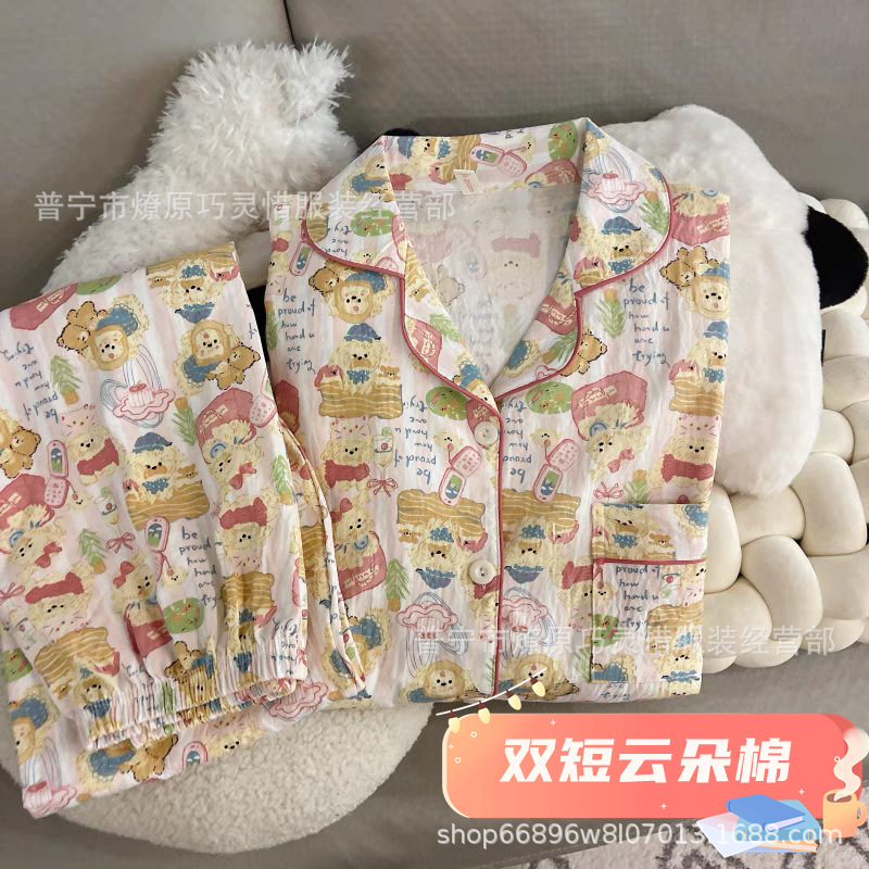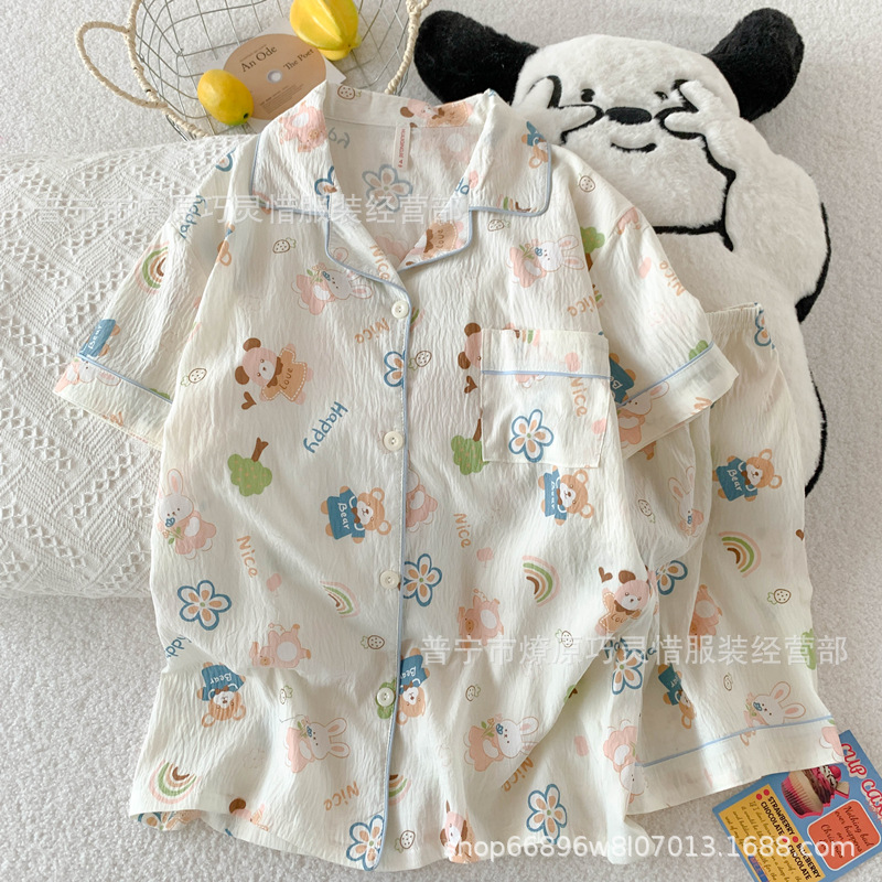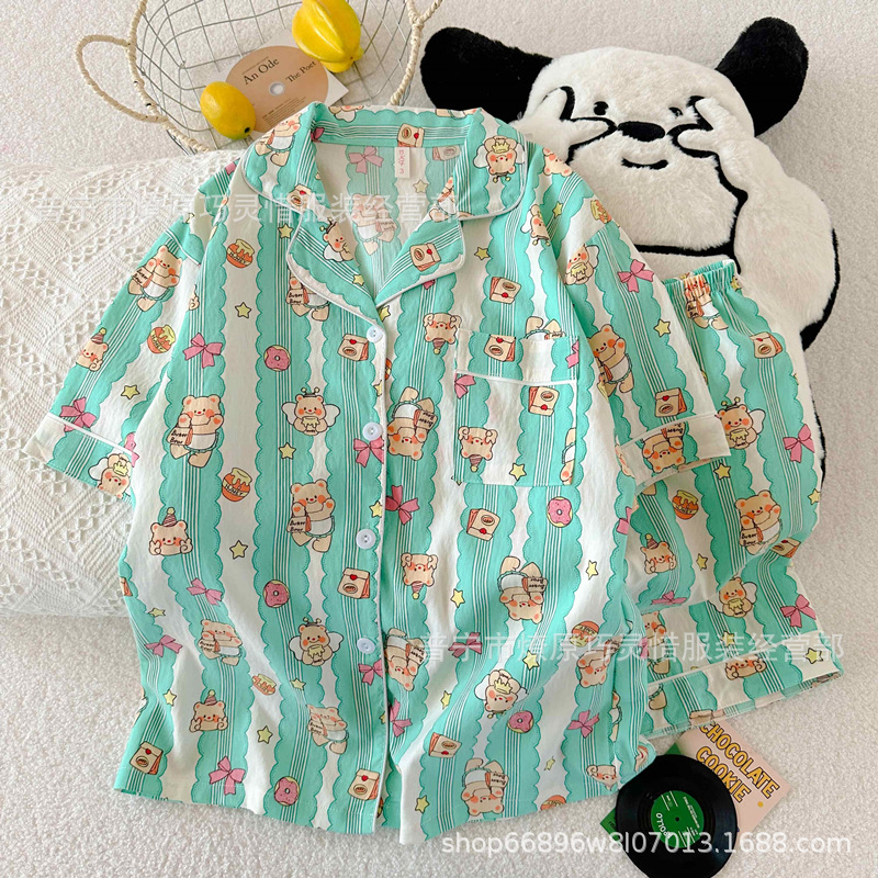 2025 여름 새로운 구름면 카디건 옷깃 달콤한 소녀 잠옷 짧은 소매 반바지 여성 홈 의류 세트