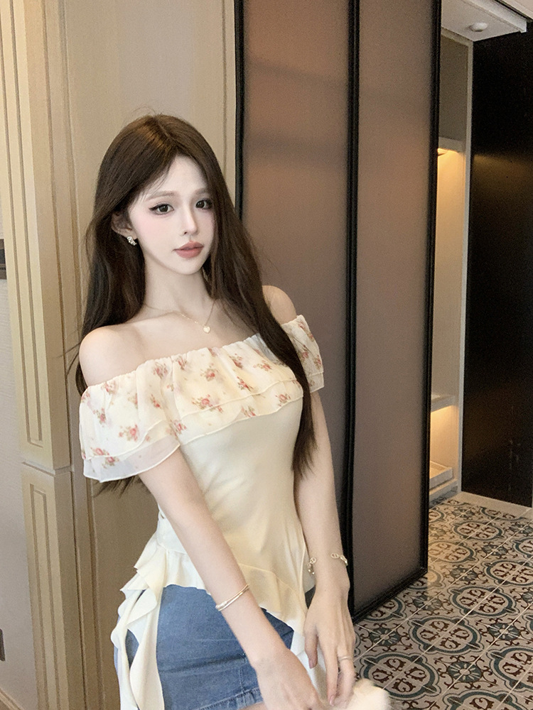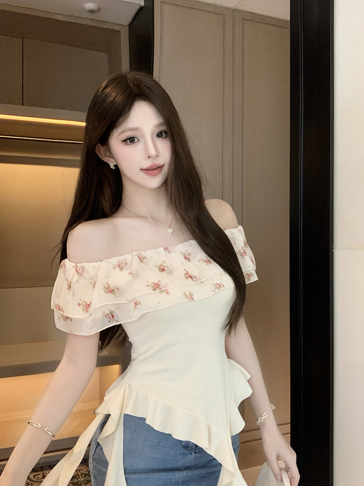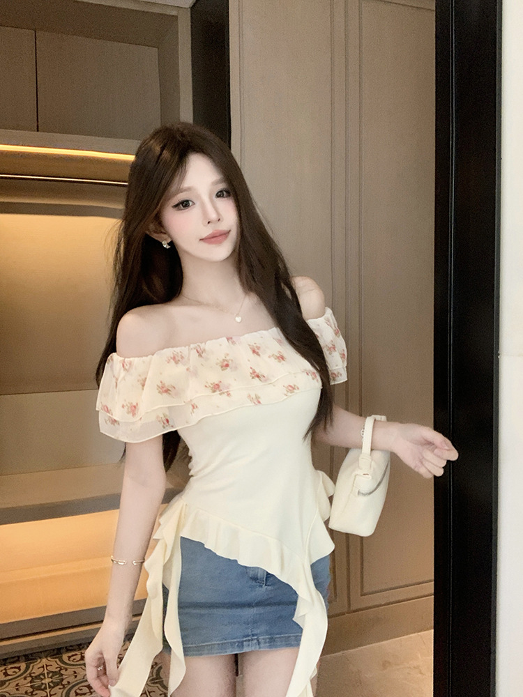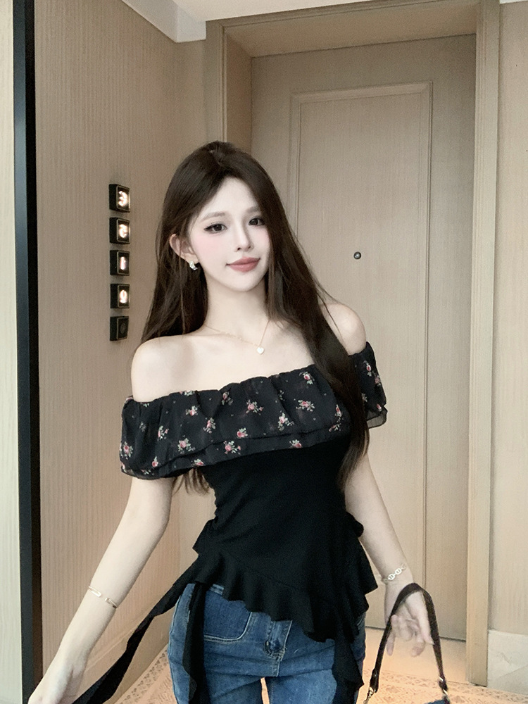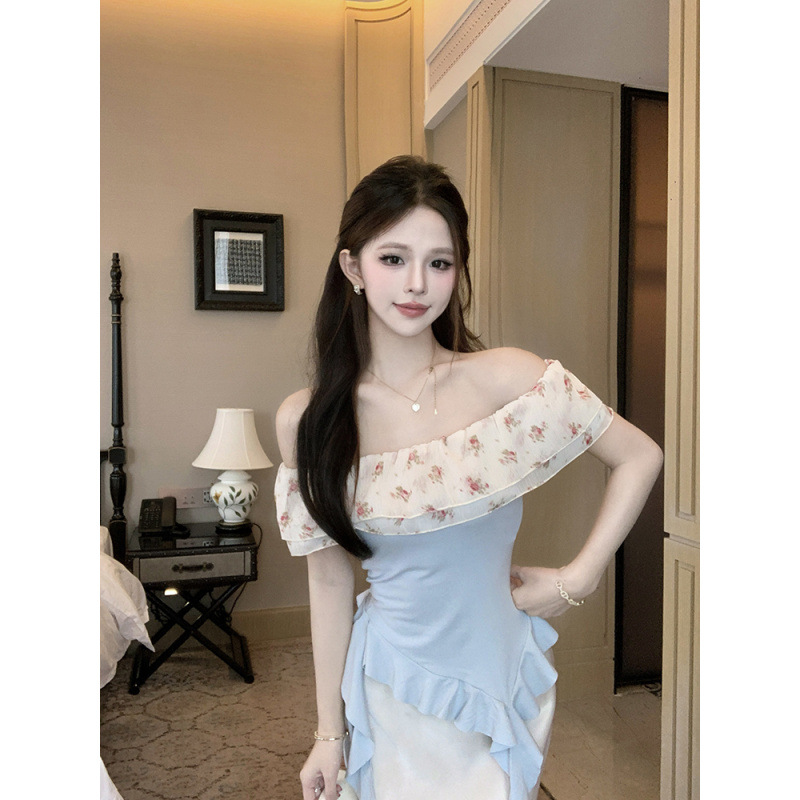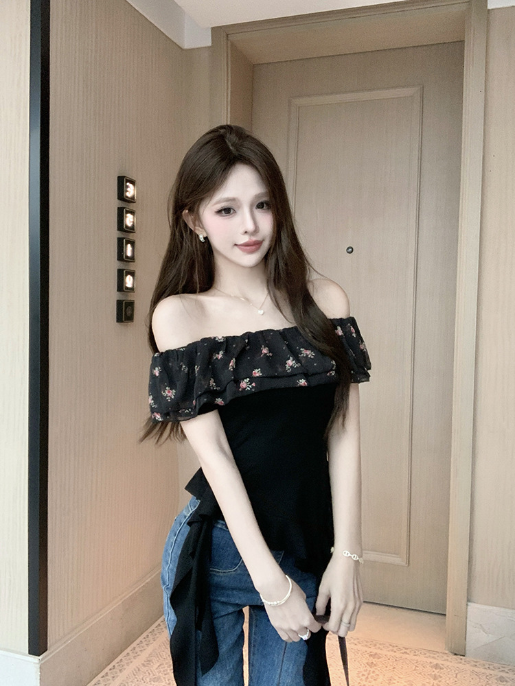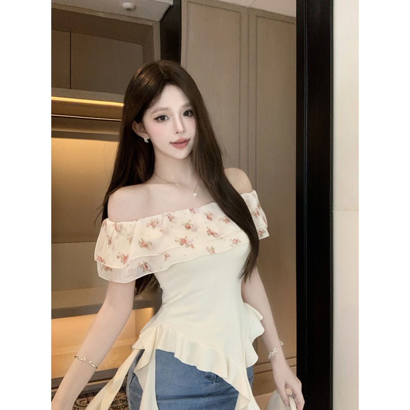 부드럽고 귀엽고 달콤한 원라인 오프숄더 탑, 목가적 스타일의 섹시한 휴가 불규칙한 리본 러플 꽃무늬 티셔츠