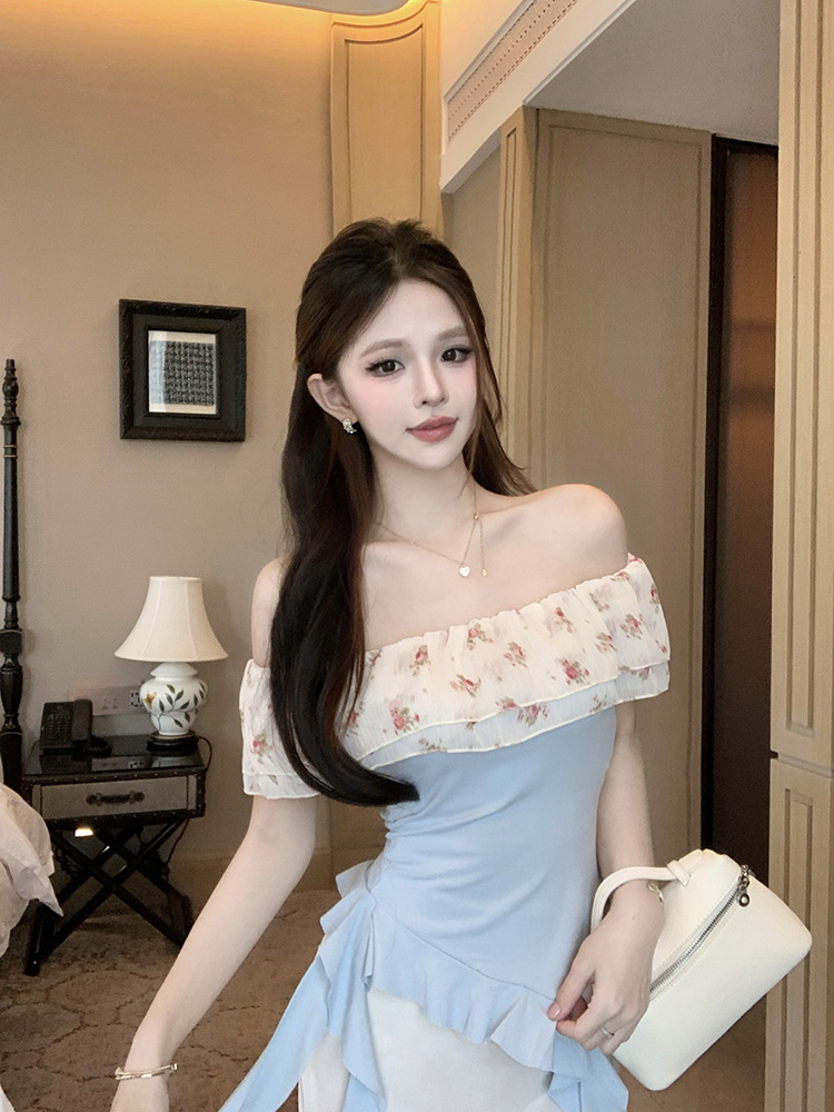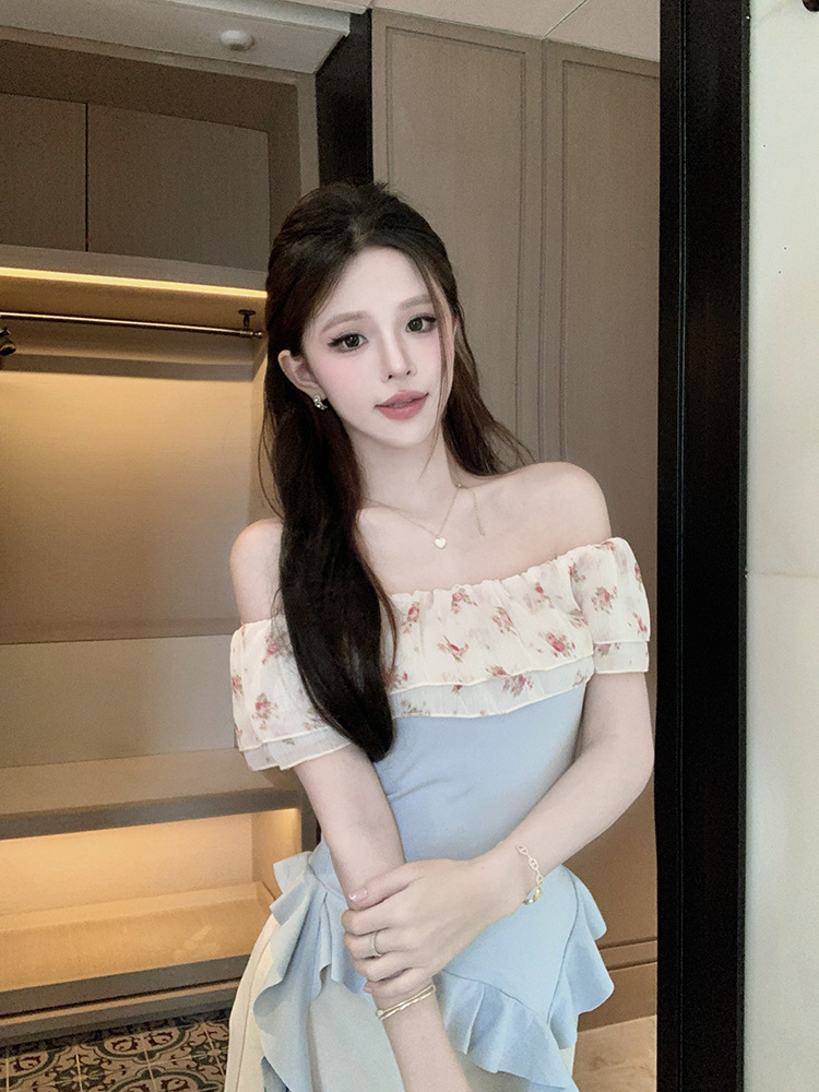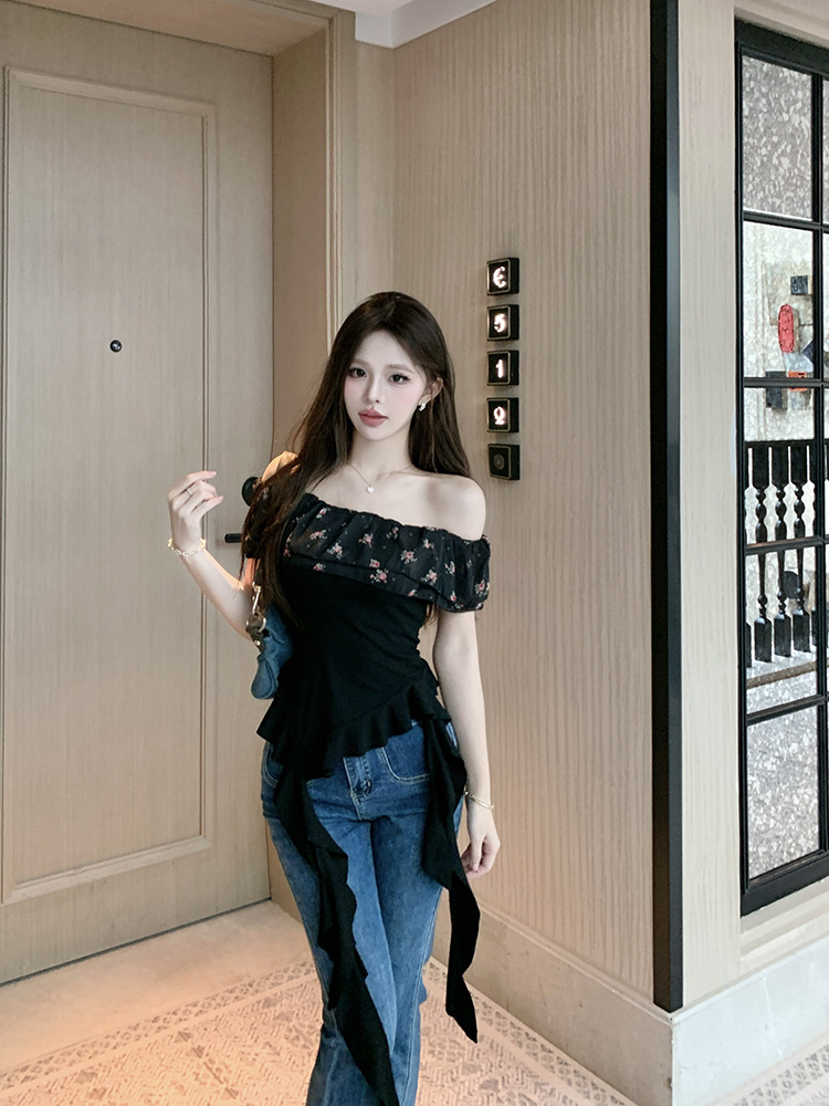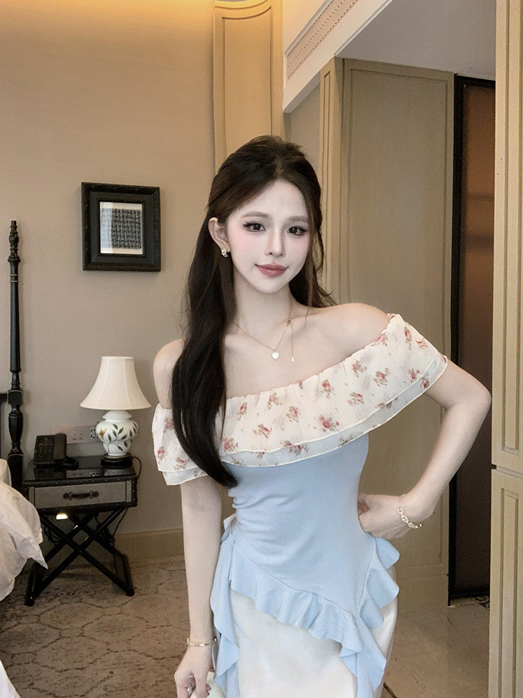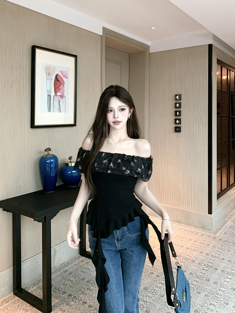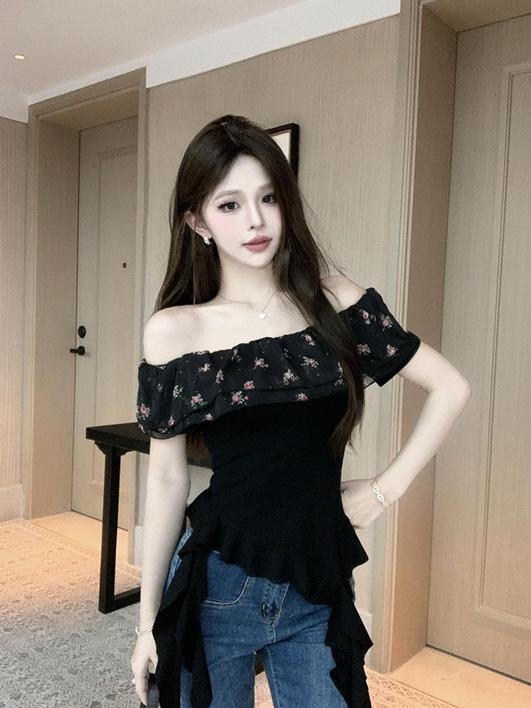 부드럽고 귀엽고 달콤한 원라인 오프숄더 탑, 목가적 스타일의 섹시한 휴가 불규칙한 리본 러플 꽃무늬 티셔츠