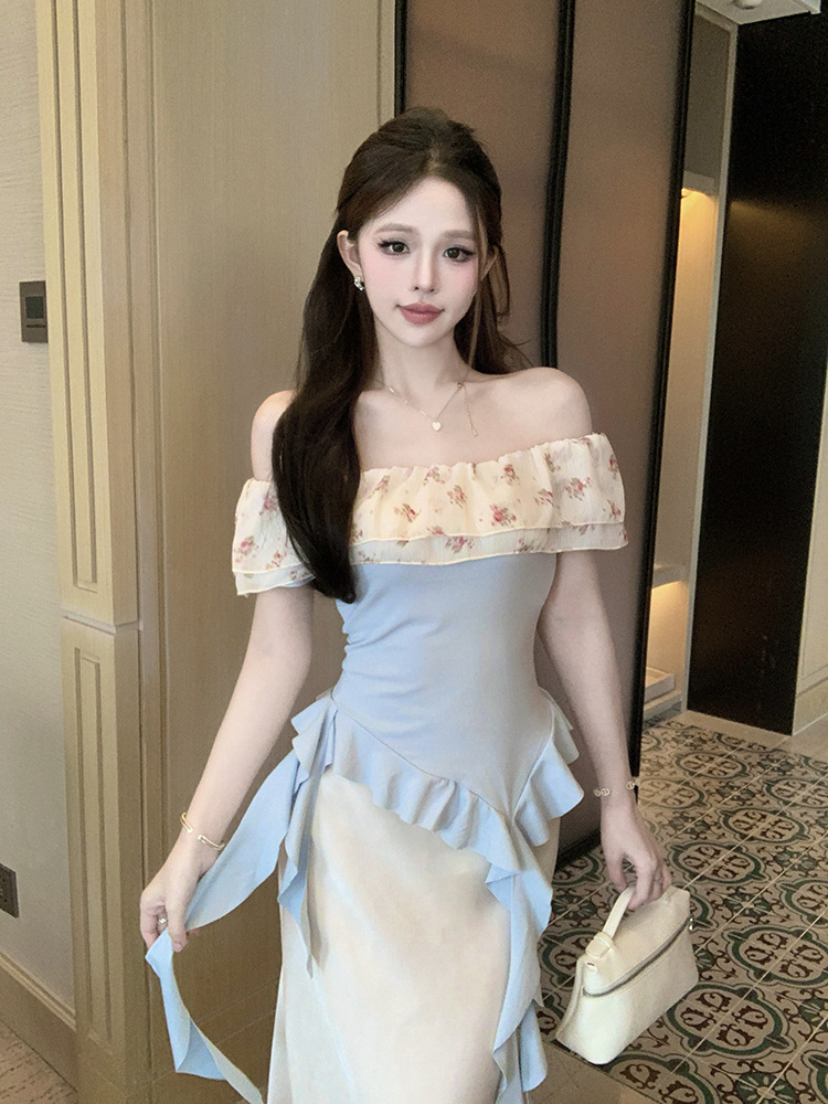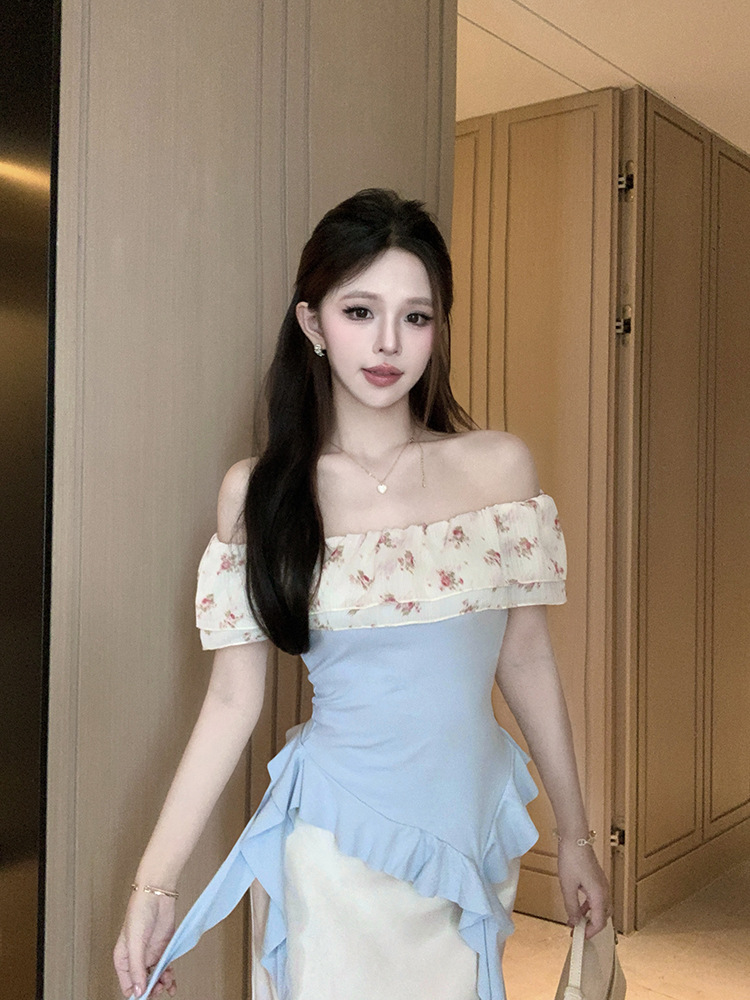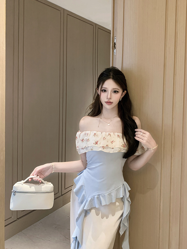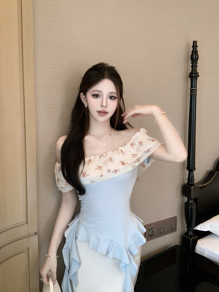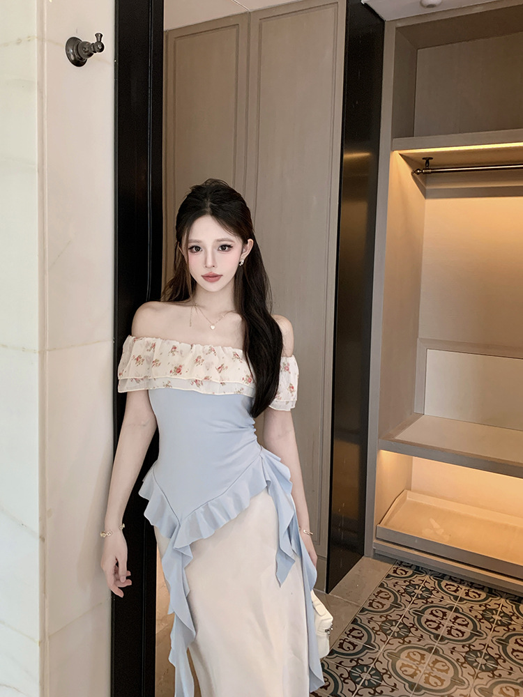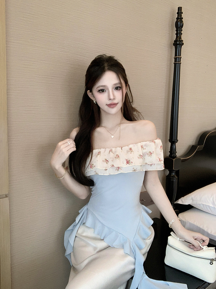 부드럽고 귀엽고 달콤한 원라인 오프숄더 탑, 목가적 스타일의 섹시한 휴가 불규칙한 리본 러플 꽃무늬 티셔츠