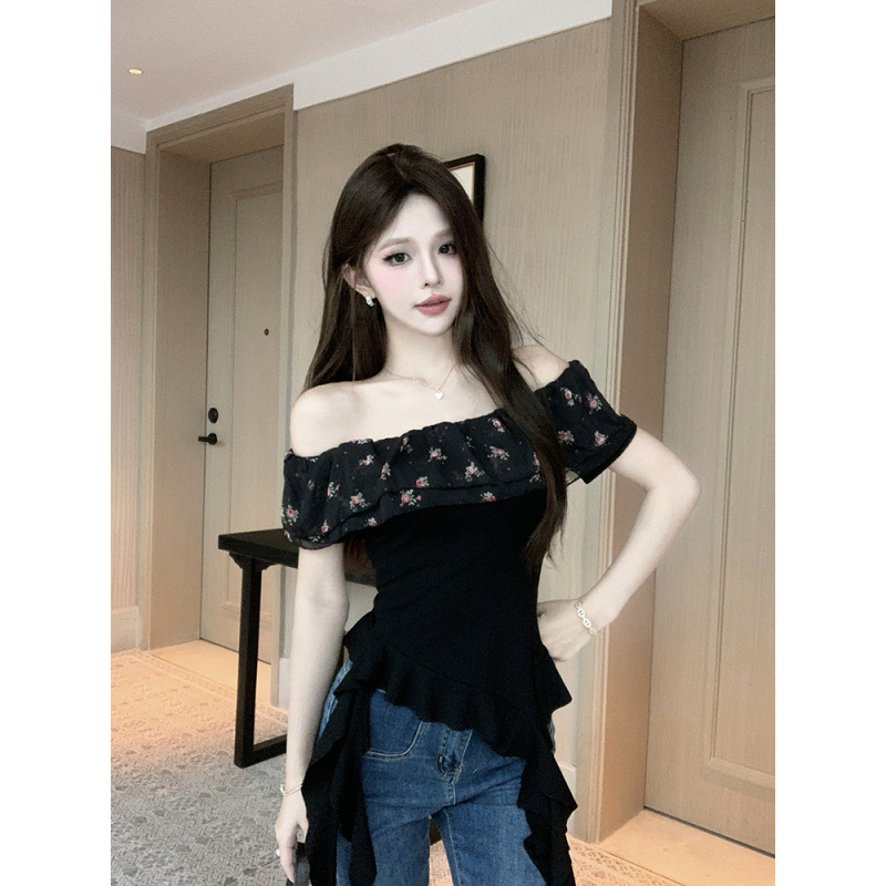 부드럽고 귀엽고 달콤한 원라인 오프숄더 탑, 목가적 스타일의 섹시한 휴가 불규칙한 리본 러플 꽃무늬 티셔츠스토어 가기