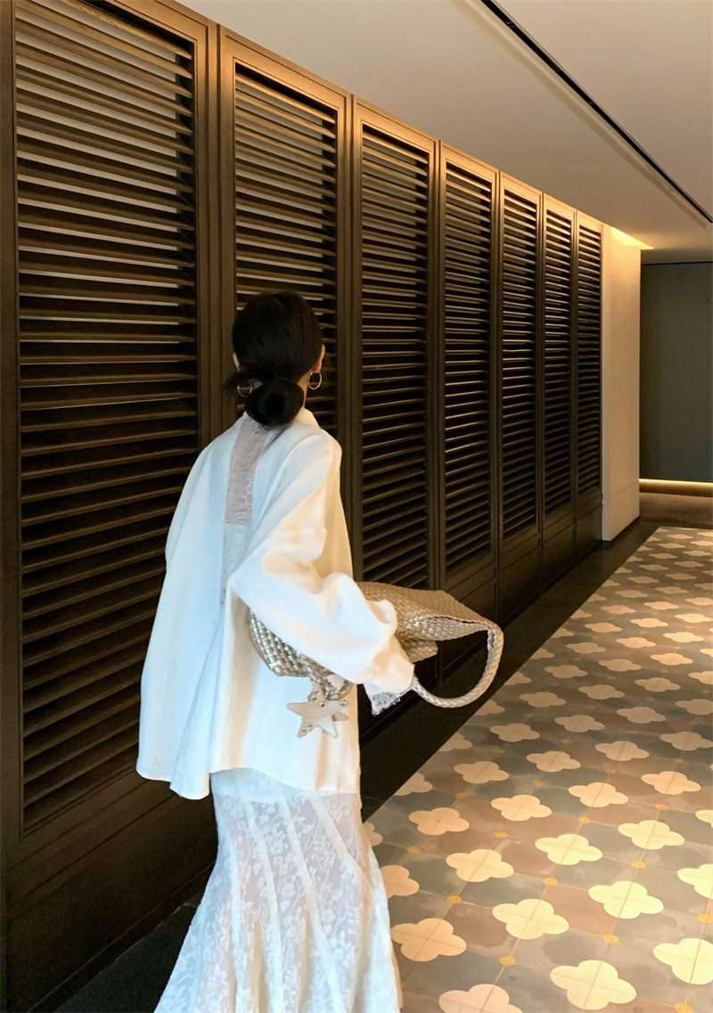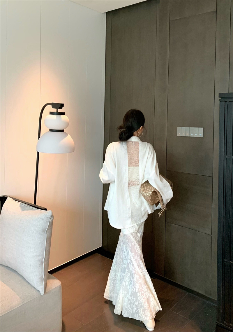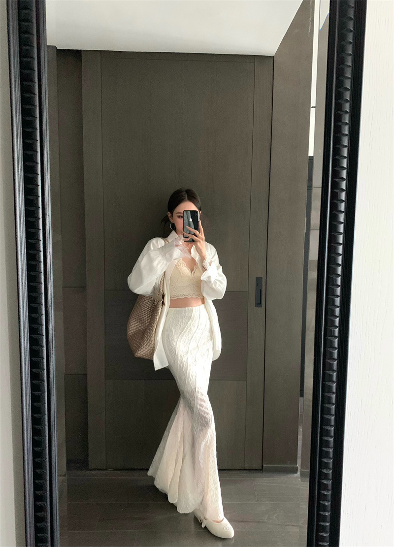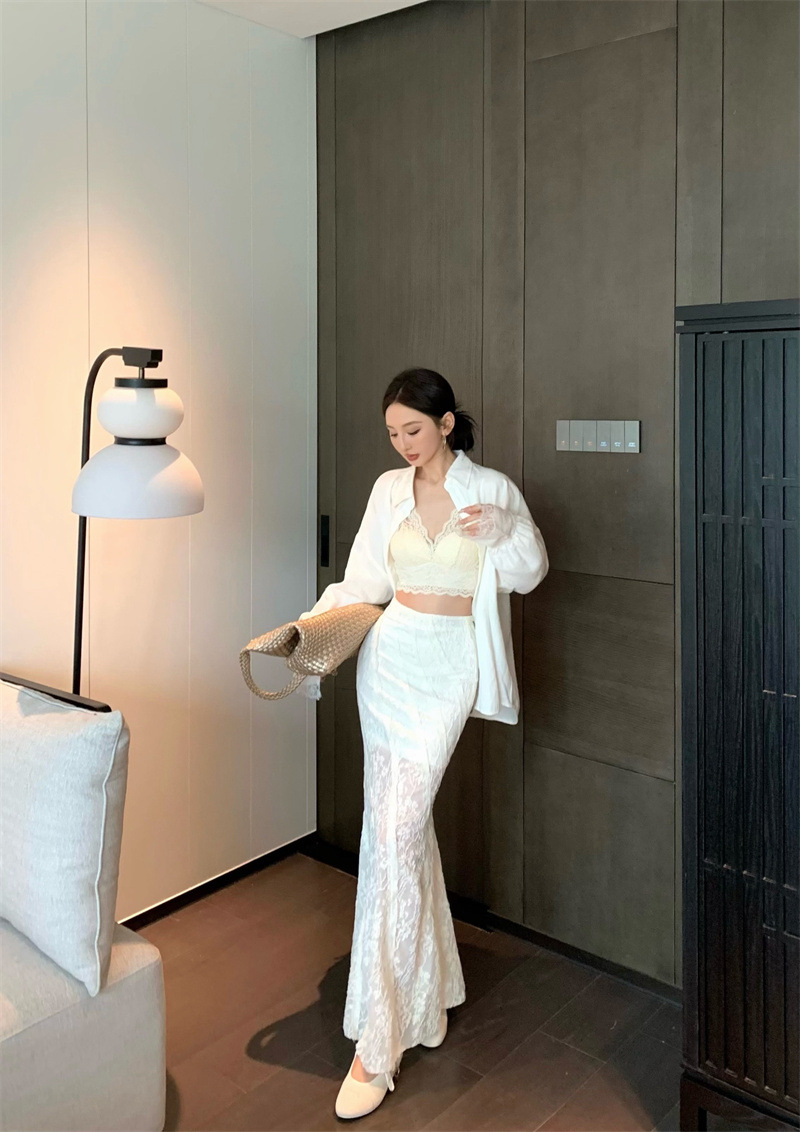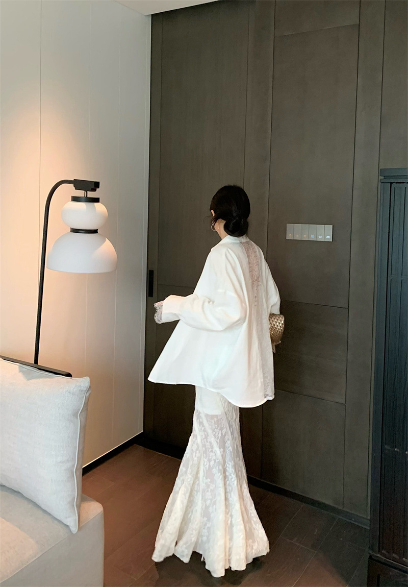의류 세트 여성용 우아한 프렌치 레이스 바느질 긴팔 카디건 화이트 셔츠 탑 높은 허리 스커트 롱 스커트스토어 가기