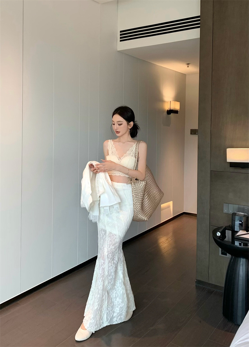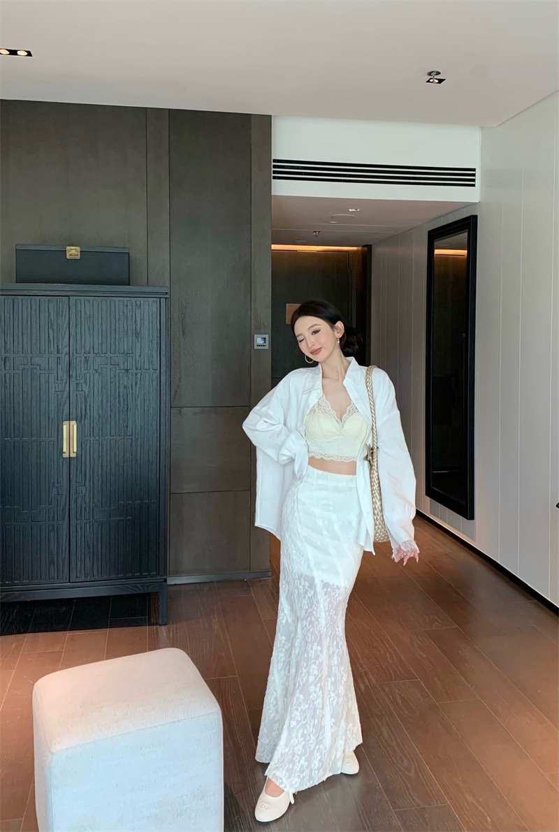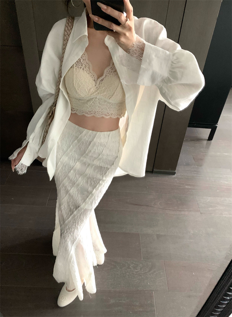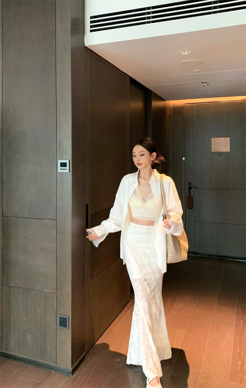 의류 세트 여성용 우아한 프렌치 레이스 바느질 긴팔 카디건 화이트 셔츠 탑 높은 허리 스커트 롱 스커트